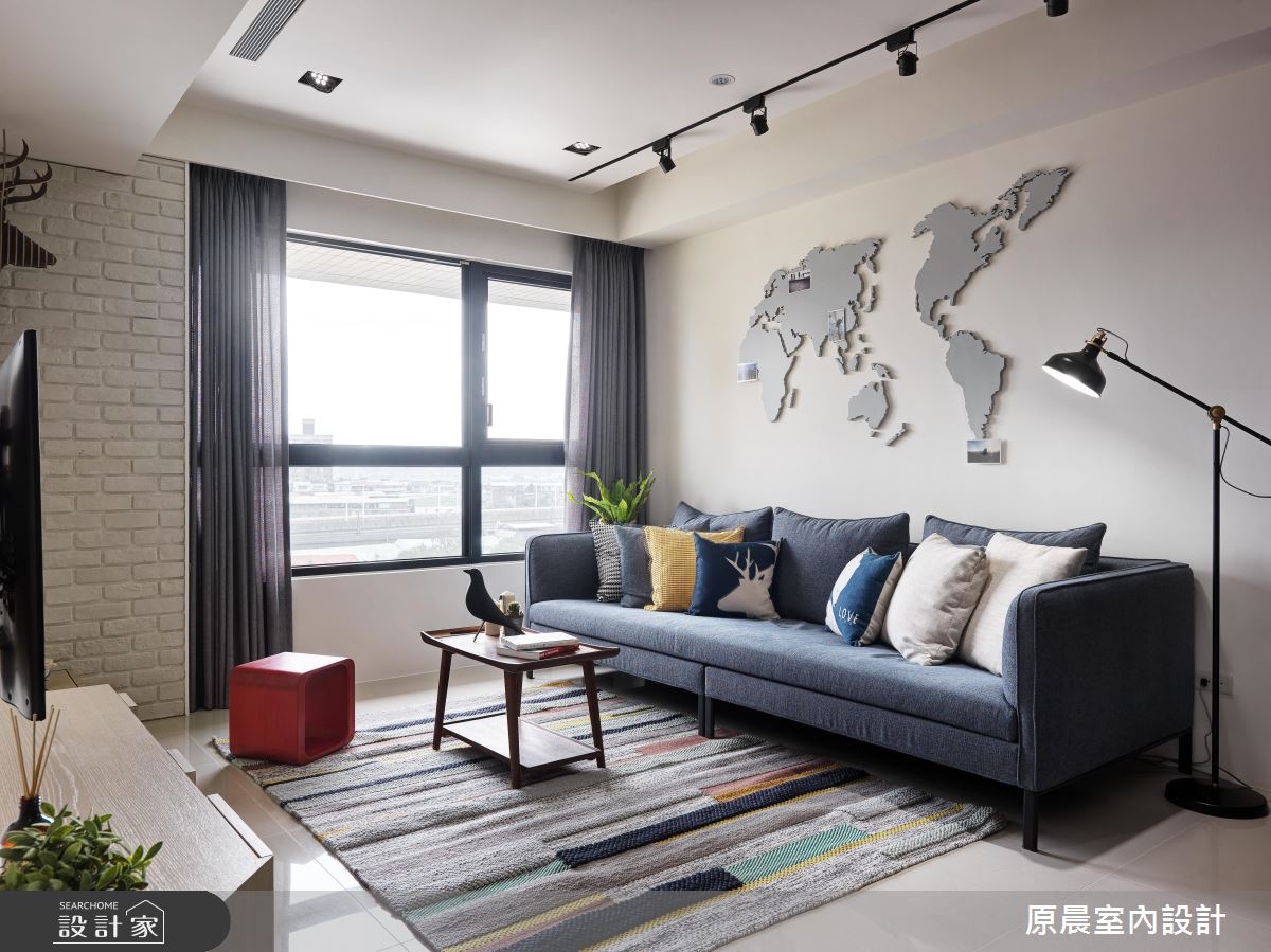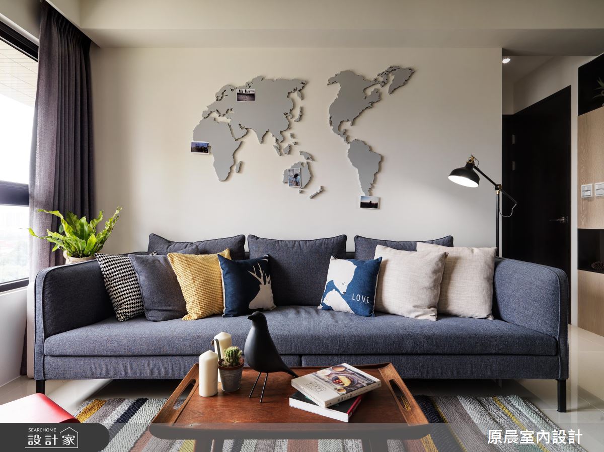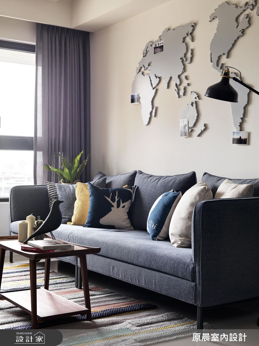 客廳沙發牆面刻意大面留白,巧妙加入凸面的世界地圖圖塊,型塑牆面的一大焦點,帶出旅行之於屋主夫妻的美好意義!