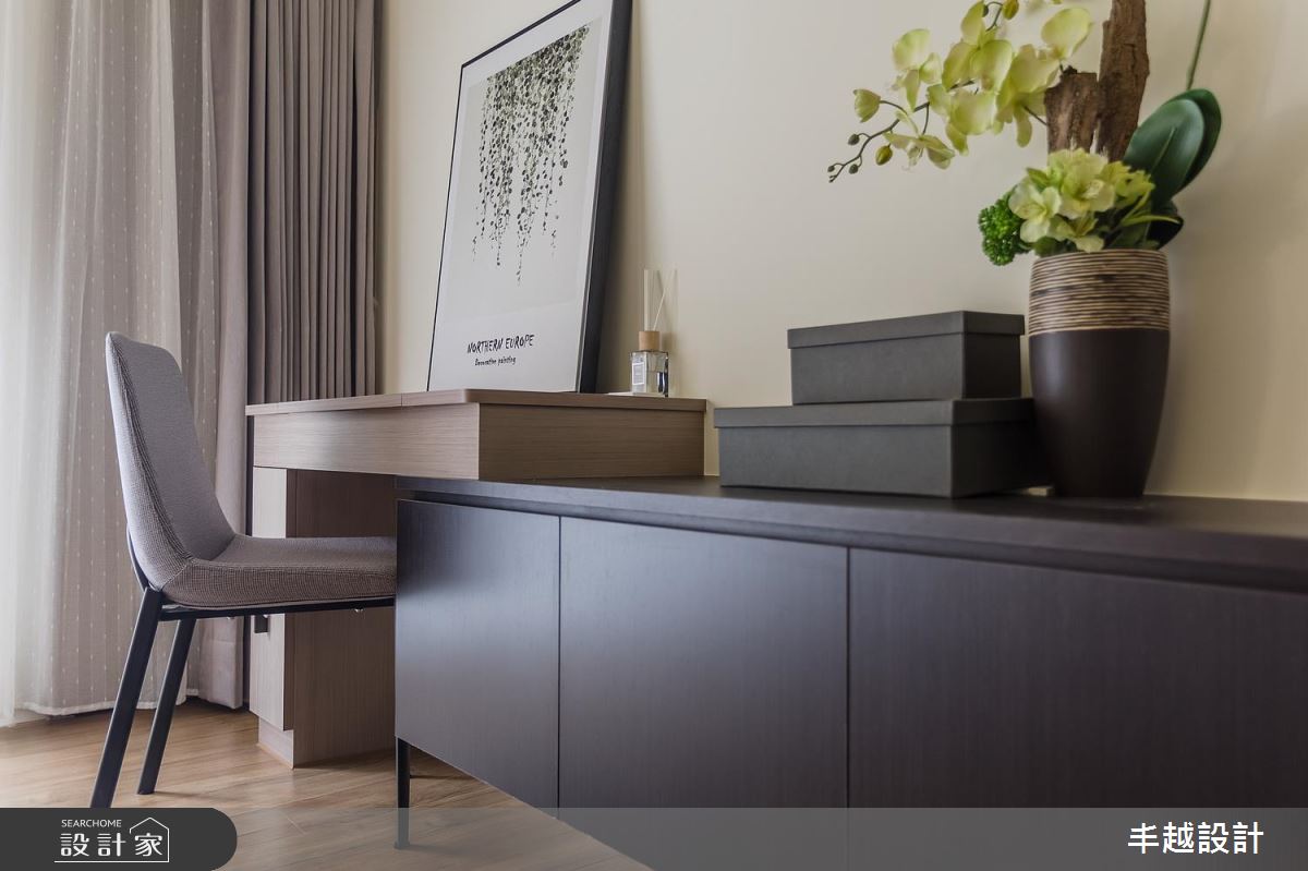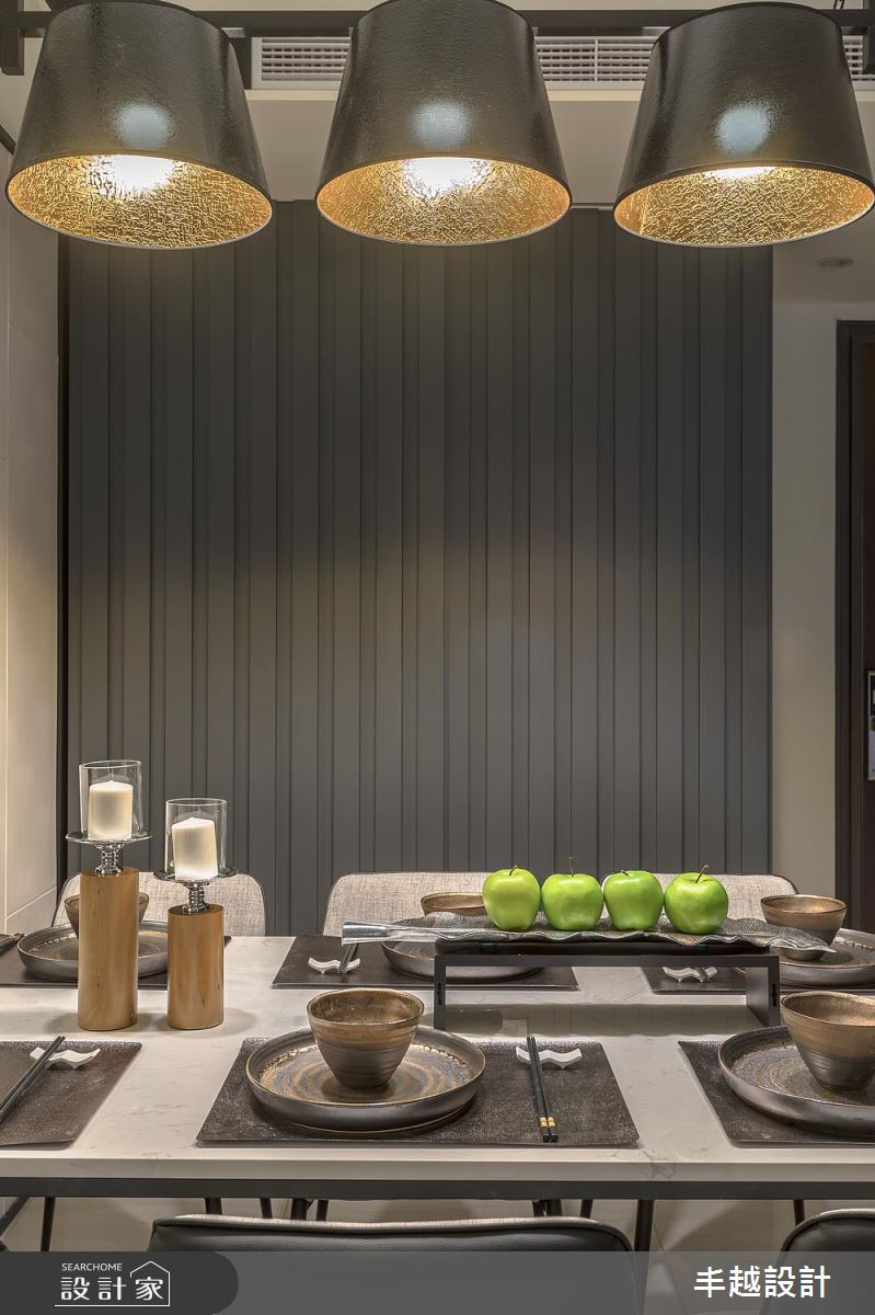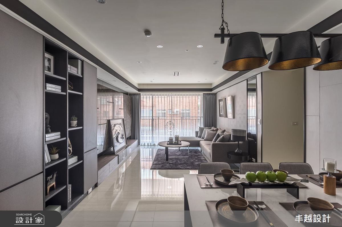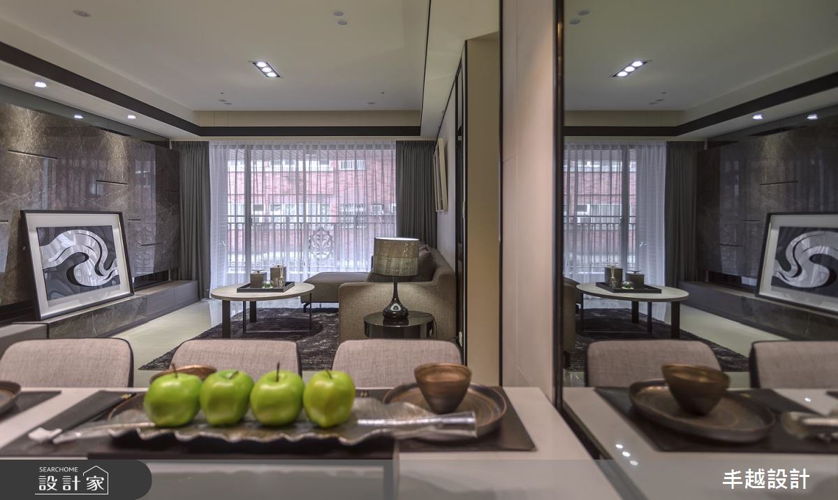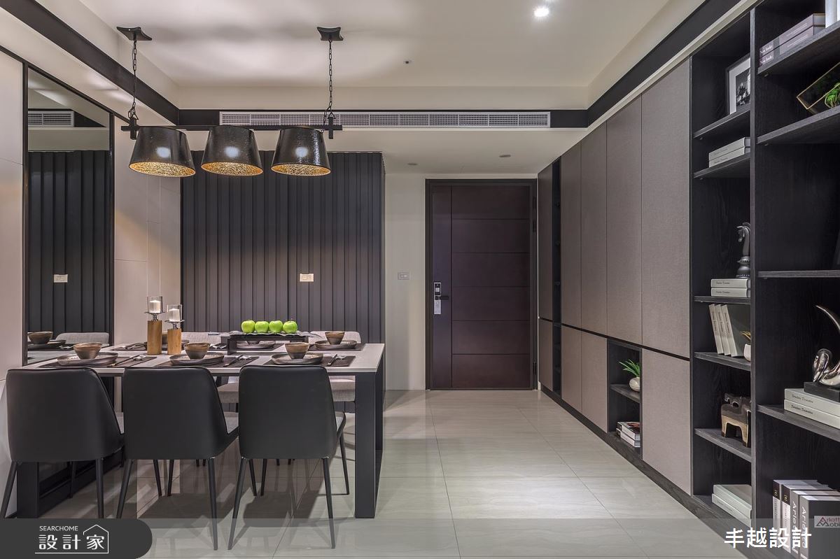 室內以開放式格局規劃,自然光從客廳的落地窗引入,讓空間裡更顯明亮、簡潔之美感,展現開闊氣度。電視牆以大地色系的大理石拼接而成,流露出自然的紋理美感,彰顯屋主對美學的獨到品味;沙發背牆以素雅的米色壁紙鋪陳,利用藝術畫作的妝點,替家挹注素雅的藝術氣息;大門口到電視牆之間,以一大面櫃體作為銜接,將鞋子、書籍與生活物件皆整齊收納,強化實用的生活機能;餐廳區以黑白色系搭配,呼應整體室內的風格主題,天花板藉由三盞弧型線條的燈飾點綴,暈黃的光感從天灑落,傳遞溫潤的人文設計,讓用餐時光倍感溫暖,而主體壁面貼附鏡面的手法,則讓空間有視覺放大的驚人之效。