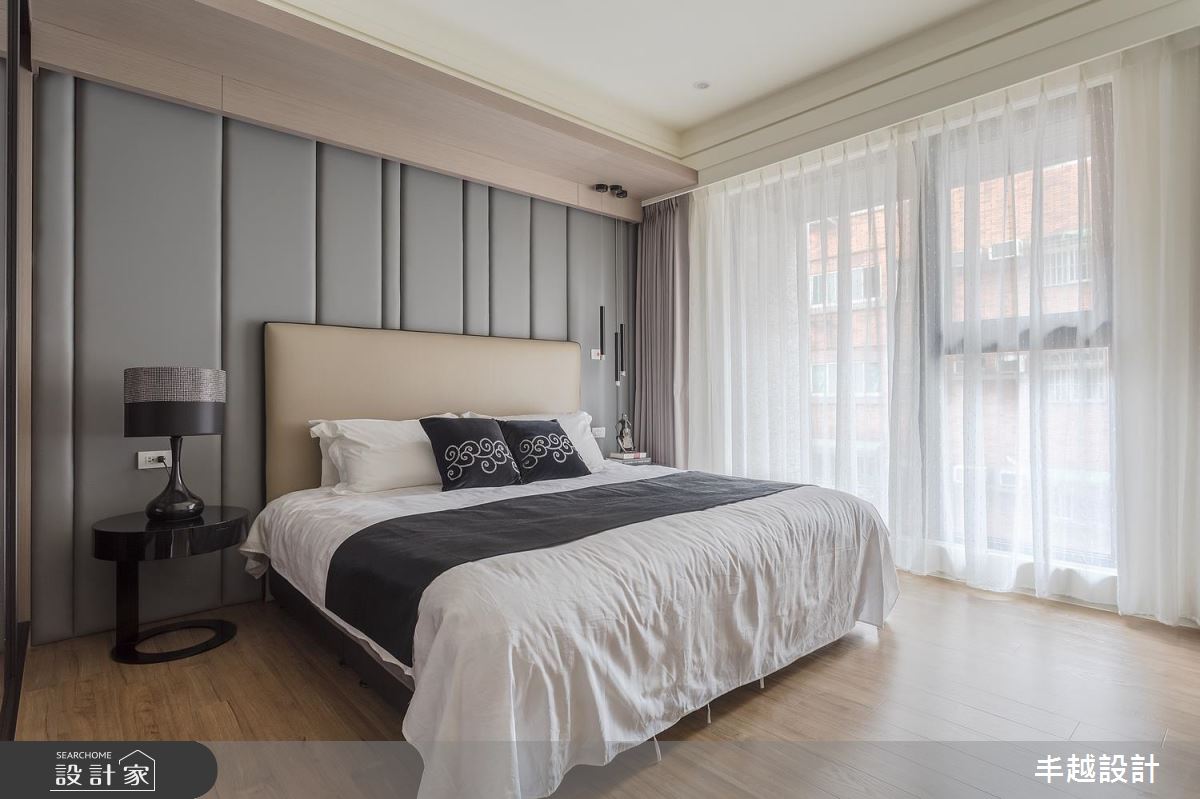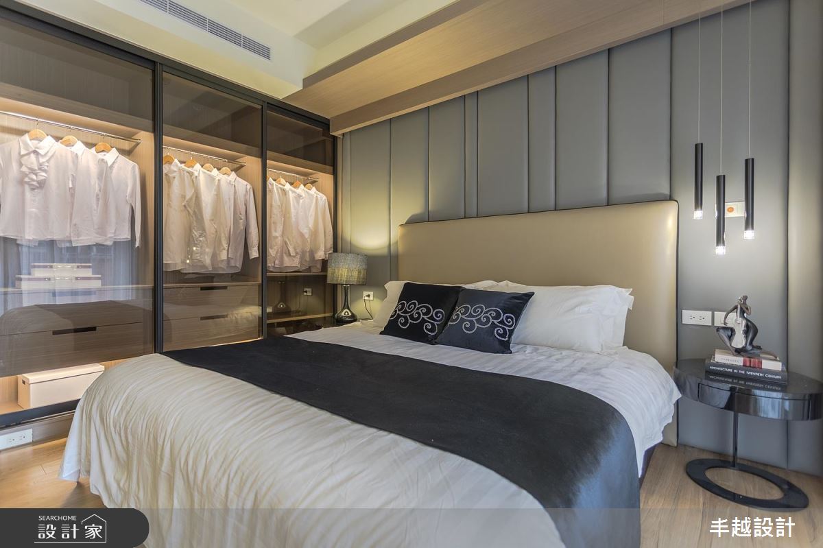 延續公領域的迷人質感,主臥空間以素雅色系為基底,整片以玻璃質材為門片的衣櫃設計,搭配內嵌光源的照明方式,營造出精品級的收納風格。