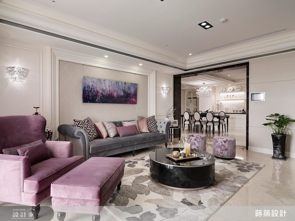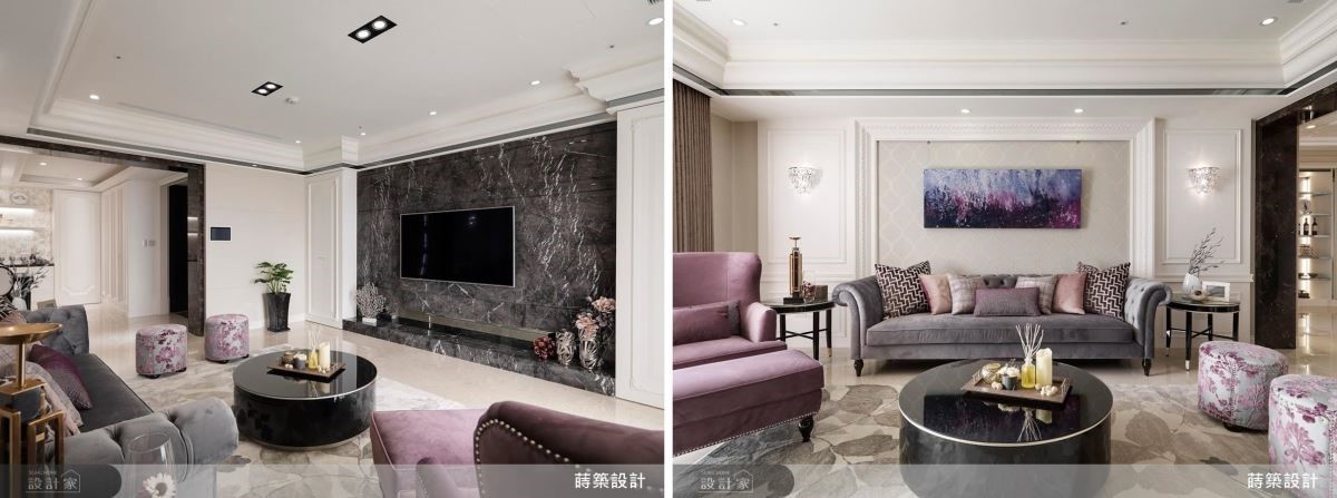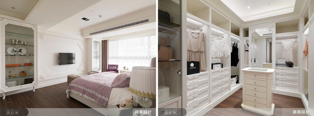 擴大後的主臥室面積與客廳幾乎一樣大小,此外還有媲美精品店的豪華更衣室,讓女主人好好享受無以倫比的空間感。公共領域方面,雖然業主在色彩上選用比較保守的淺色系,但蒔築團隊利用各式特殊石材以及手繪油畫,為空間注入多樣的色彩,更選用進口亮片壁紙搭配光線,呈現出多樣視覺享受。在各式繁複的手工線條語彙交錯中,勾勒出華麗的古典風格居家面貌,確實達到了業主「大器豪宅」的夢想。