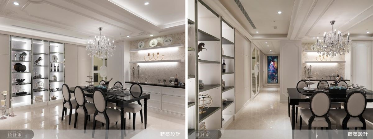 業主希望能有足夠的收納,於是利用櫃體取代實牆,一方面拉齊格線,一方面把畸零地變成儲藏室。在餐桌左側整面的收納櫃中間,做出開放性的展示架,以灰鏡做出金屬感的邊框,再貼上進口亮片壁紙,配合燈光,呈現華麗的時尚感;而另一側備餐櫃的壁紙又是另一種形式,從不同角度看,就會有不同的景致(左圖)。