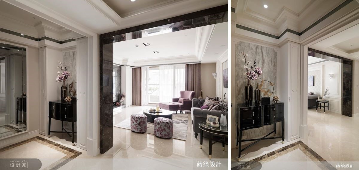 開放性的公共空間還是有使用上的區別,蒔築團隊特別做出門框,突顯業主想要的大器感。進入玄關後,白色門框通往餐廳,而黑金峰石材打造的黑門框則界定出客廳範圍,很有大戶人家的規格(左圖)。