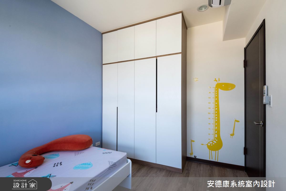 小孩房以粉紫色系的壁面作為跳色安排,白與木紋色系搭配的衣櫃設計,替北歐風的休憩空間更添活力。