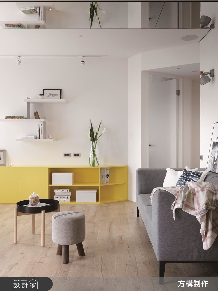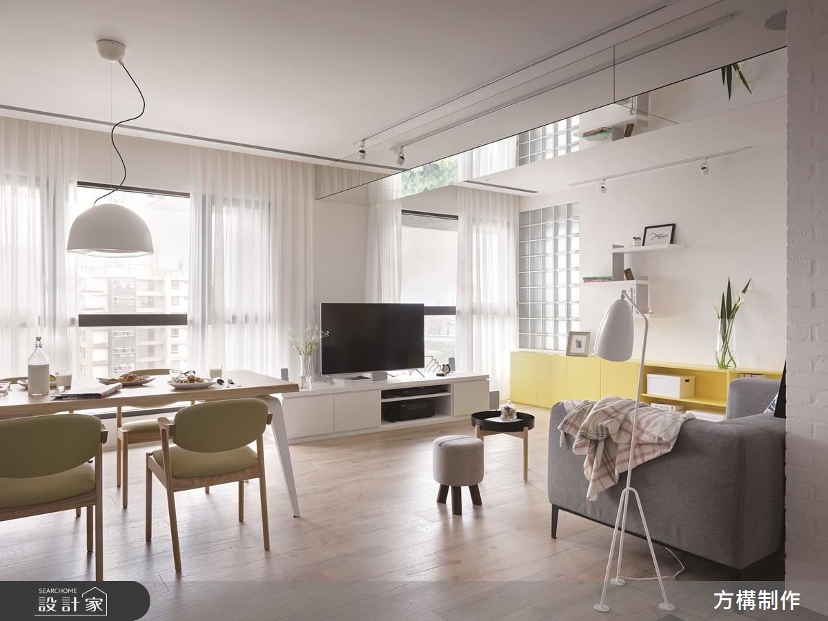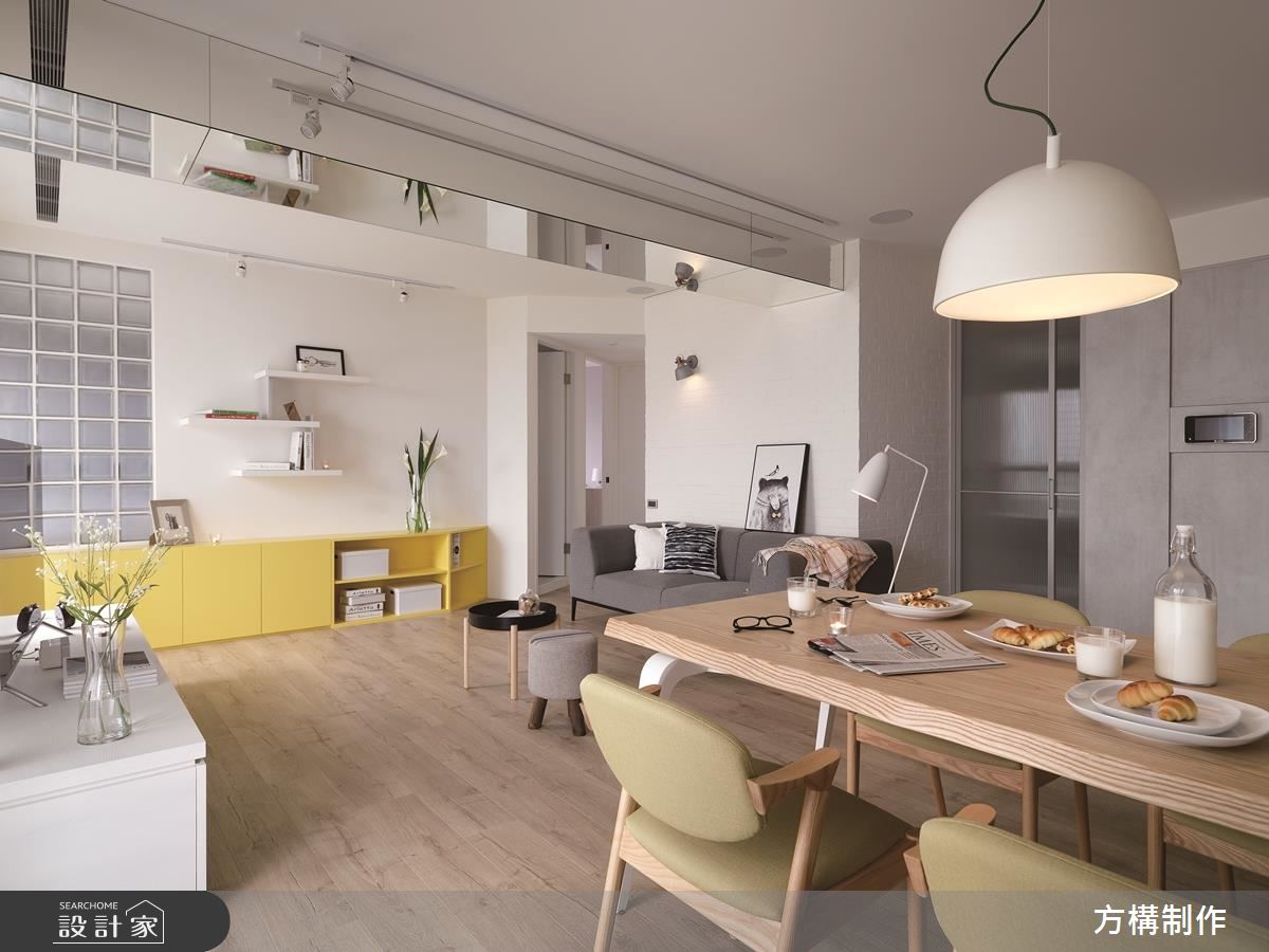 清新感十足的 23.5坪北歐風居宅,設計師藉由純淨清爽的白色系,搭配檸檬黃色的櫃體、層板點綴,並以明鏡將樑體做三面包覆,巧妙化解了樑柱的壓迫感,為居住者勾勒出明亮又舒適的居家面貌。