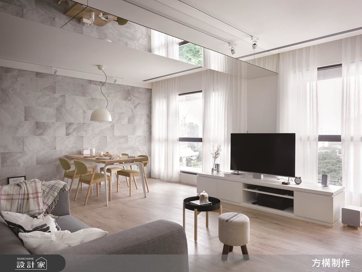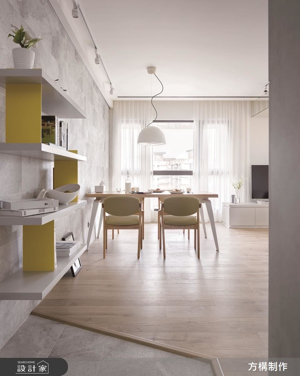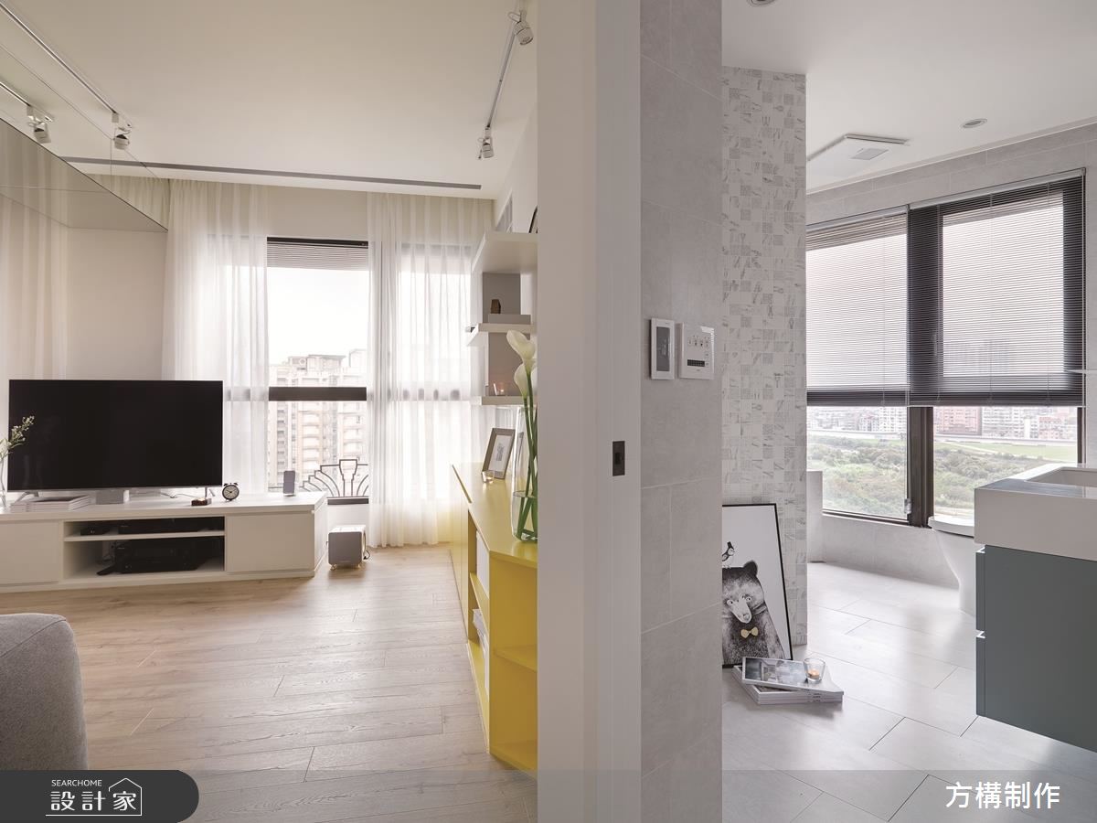 清新感十足的 23.5坪北歐風居宅,設計師藉由純淨清爽的白色系,搭配檸檬黃色的櫃體、層板點綴,並以明鏡將樑體做三面包覆,巧妙化解了樑柱的壓迫感,為居住者勾勒出明亮又舒適的居家面貌。