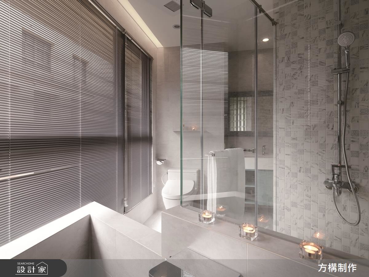 走進室內,淺灰色的石磚一路由玄關處向公共領域漫延,並透過地坪材質的轉換,切分出內、外的空間屬性。灰色布織沙發以及淺色木質餐桌、餐椅等家具軟件的選擇,使空間質感更加溫潤和舒適。為了增加空間的明亮度和通透感,設計師在牆面及門片上使用長虹玻璃、玻璃磚等設計,落地窗旁則加上白色紗簾,過濾出柔和不刺眼的舒適光線。機能相當完整的衛浴盥洗空間,採乾溼分離設計,包含淋浴、泡澡區,以及一般盥洗區,並安排於採光充足的窗邊,搭配捲簾設計可視需求調整光線強弱及隱私性,為居住者帶來舒適的洗浴時光。