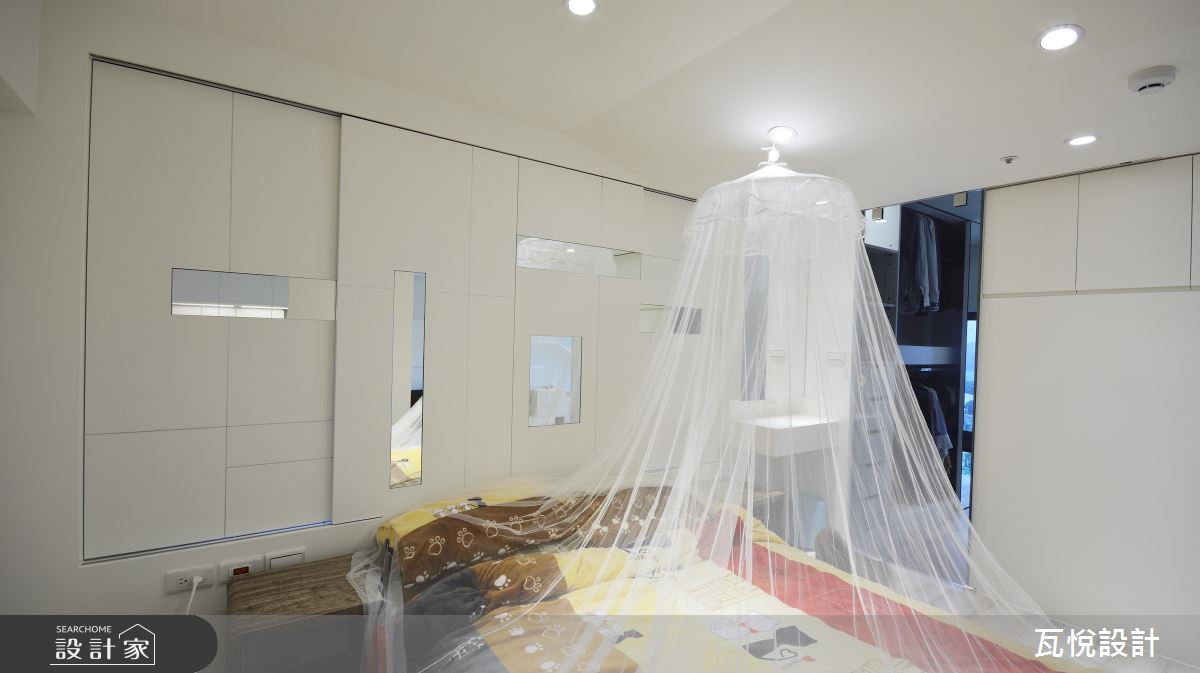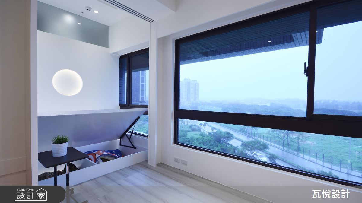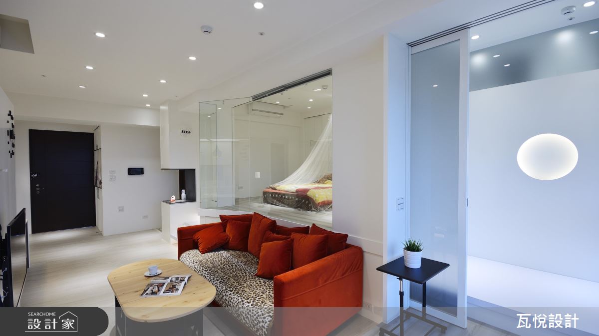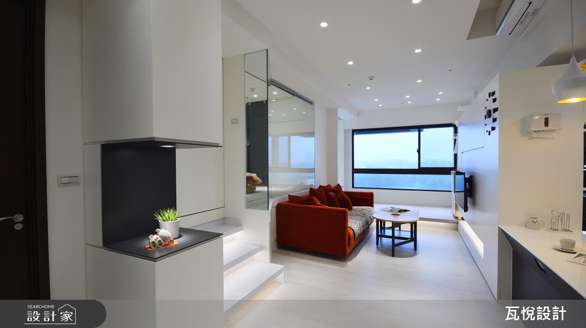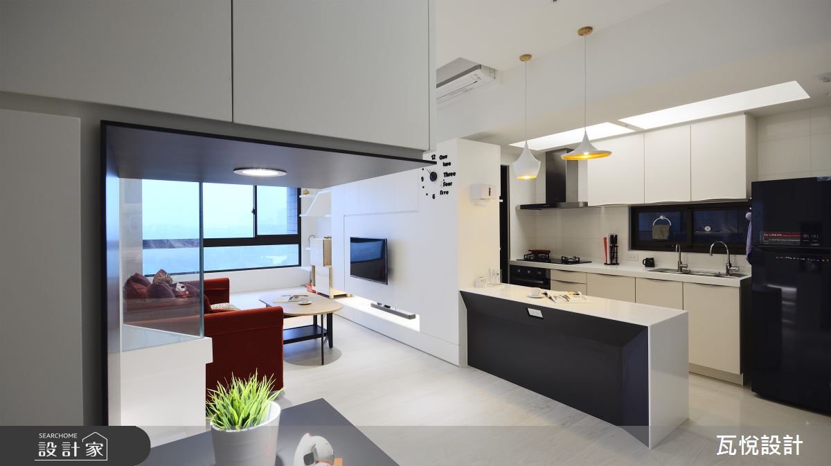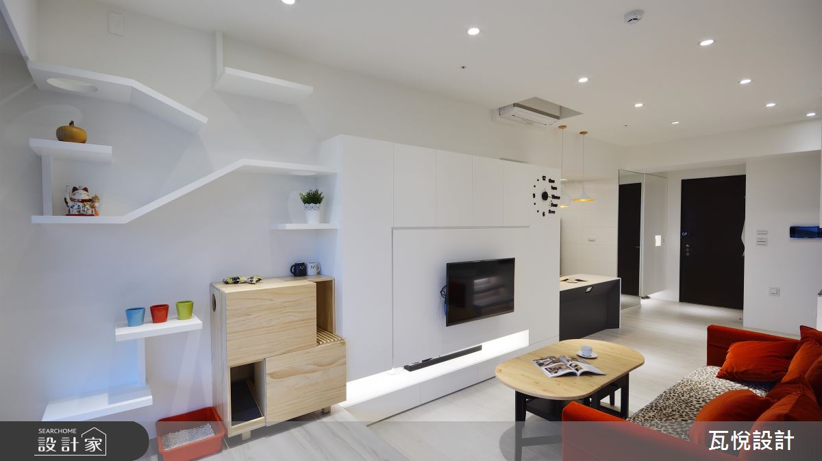 由於坪數有限,因此設計師採開放設計串連公領域,也抹除了制式的玄關空間,以柱型收納櫃兼具屏隔功能。利用吧台取代餐桌,成為一字型廚房與客廳的接壤。在臨窗處將地坪墊高,規劃了一處結合貓屋與跳台、可供屋主休憩的場域,更在後方區域增設了拉門和上掀式床板,成為一個簡單的多功能客房。針對收納機能,設計師墊高臥房地坪,在下方增設儲藏室,並利用轉折斜角設計打造大型開口,更利用電視牆上方空間結合收納櫃體。風格則以帶有溫馨氛圍的純白現代風格為主,並以玻璃取代隔間牆,放大空間感受。