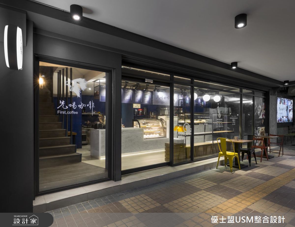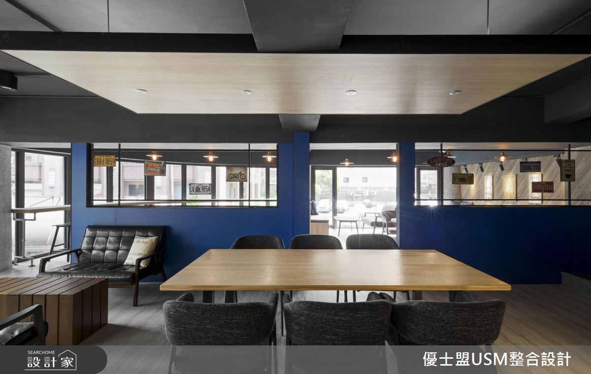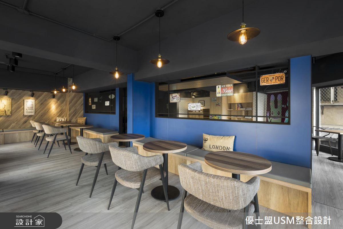 一樓以玻璃與鐵件勾勒出清爽、俐落的外觀,騎樓區還擺放幾個等候座椅,成為歡迎到訪來客的絕佳方式,跳色鐵椅的安排更呼應室內活潑、不受拘束的氛圍。一樓主要規畫結帳與外帶區,壁面以深藍色系打底,搭配白色調的大理石櫃台,鮮明的色調刻劃出空間比例與層次,而天花板以隔柵鋪陳,延伸視覺之感讓空間更顯開闊;循著鋪設木紋踏板的階梯來到二、三樓,整排落地玻璃窗的設計,讓室內用餐的人們能夠欣賞戶外的天然景致,而充沛的戶外光線也能映照室內,即使以深色調做為空間安排,也能保有明亮、寬敞之感;天花板以黑色調為基底,軌道燈穿梭其中,木紋肌理的材質運用,讓空間沒有刻板的冷冽感受,反而增添溫潤質感;輕工業元素的軟裝與配件混搭著,天花板垂掛幾盞風格燈飾,明暗交錯的地坪與壁面安排,激盪出輕快、時髦的用餐氛圍。
