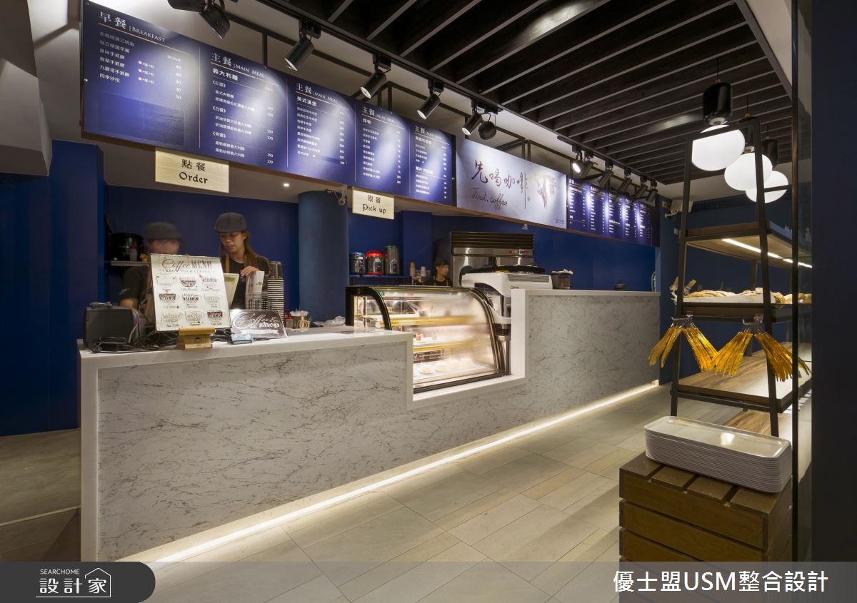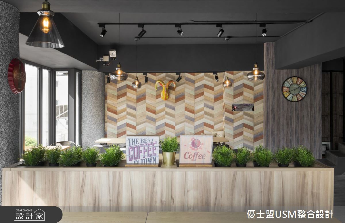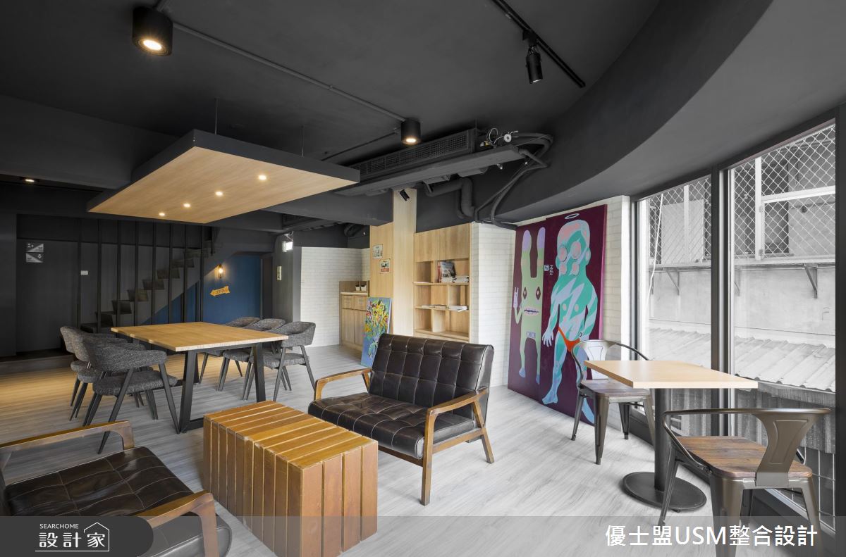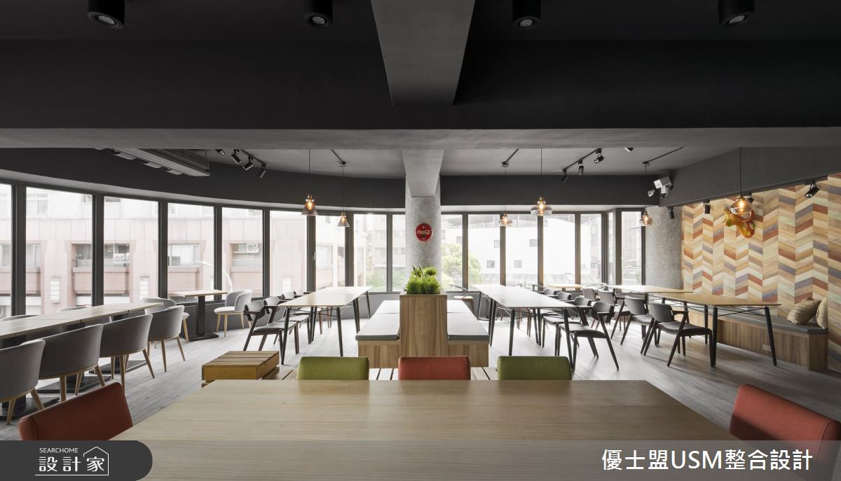 一樓以玻璃與鐵件勾勒出清爽、俐落的外觀,騎樓區還擺放幾個等候座椅,成為歡迎到訪來客的絕佳方式,跳色鐵椅的安排更呼應室內活潑、不受拘束的氛圍。一樓主要規畫結帳與外帶區,壁面以深藍色系打底,搭配白色調的大理石櫃台,鮮明的色調刻劃出空間比例與層次,而天花板以隔柵鋪陳,延伸視覺之感讓空間更顯開闊;循著鋪設木紋踏板的階梯來到二、三樓,整排落地玻璃窗的設計,讓室內用餐的人們能夠欣賞戶外的天然景致,而充沛的戶外光線也能映照室內,即使以深色調做為空間安排,也能保有明亮、寬敞之感;天花板以黑色調為基底,軌道燈穿梭其中,木紋肌理的材質運用,讓空間沒有刻板的冷冽感受,反而增添溫潤質感;輕工業元素的軟裝與配件混搭著,天花板垂掛幾盞風格燈飾,明暗交錯的地坪與壁面安排,激盪出輕快、時髦的用餐氛圍。