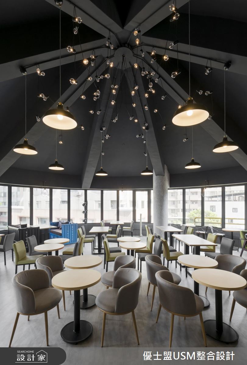 四樓空間以圓心軸為概念,天花板藉由穹頂造型支撐起建築體,並藉由精緻的燈泡與垂掛式吊燈擺設,創造出如繁星點點的迷人天際,在此情境下用餐,別有一番風味。