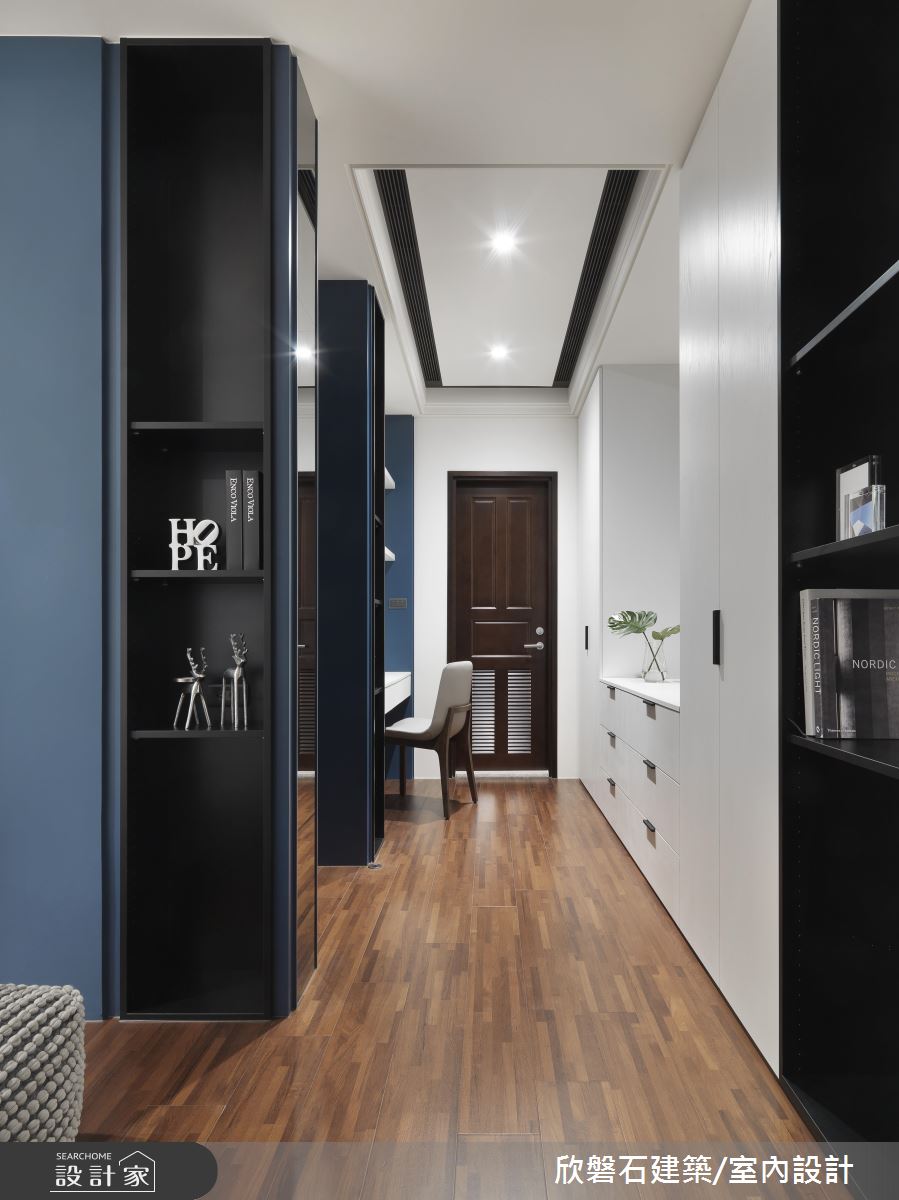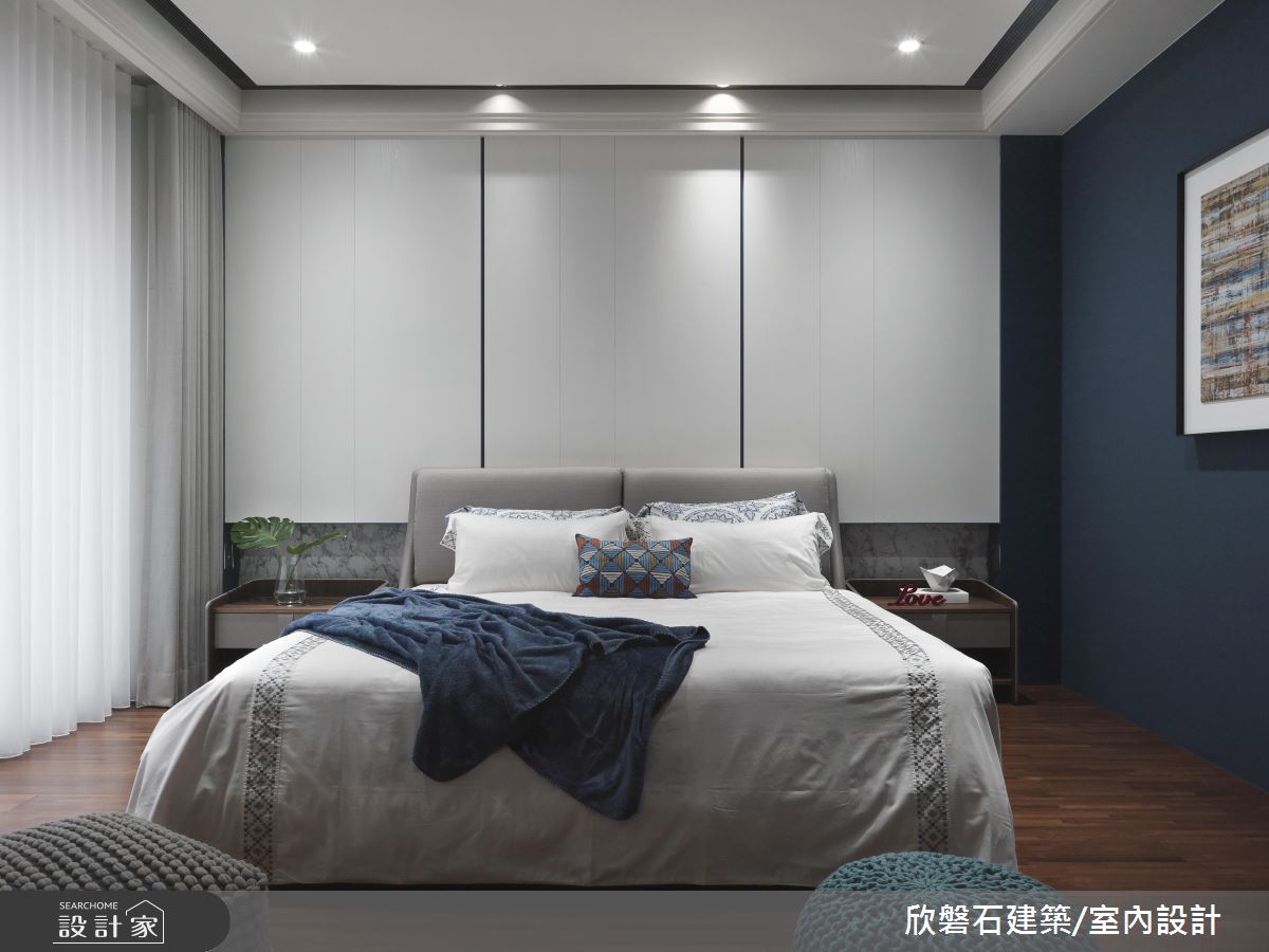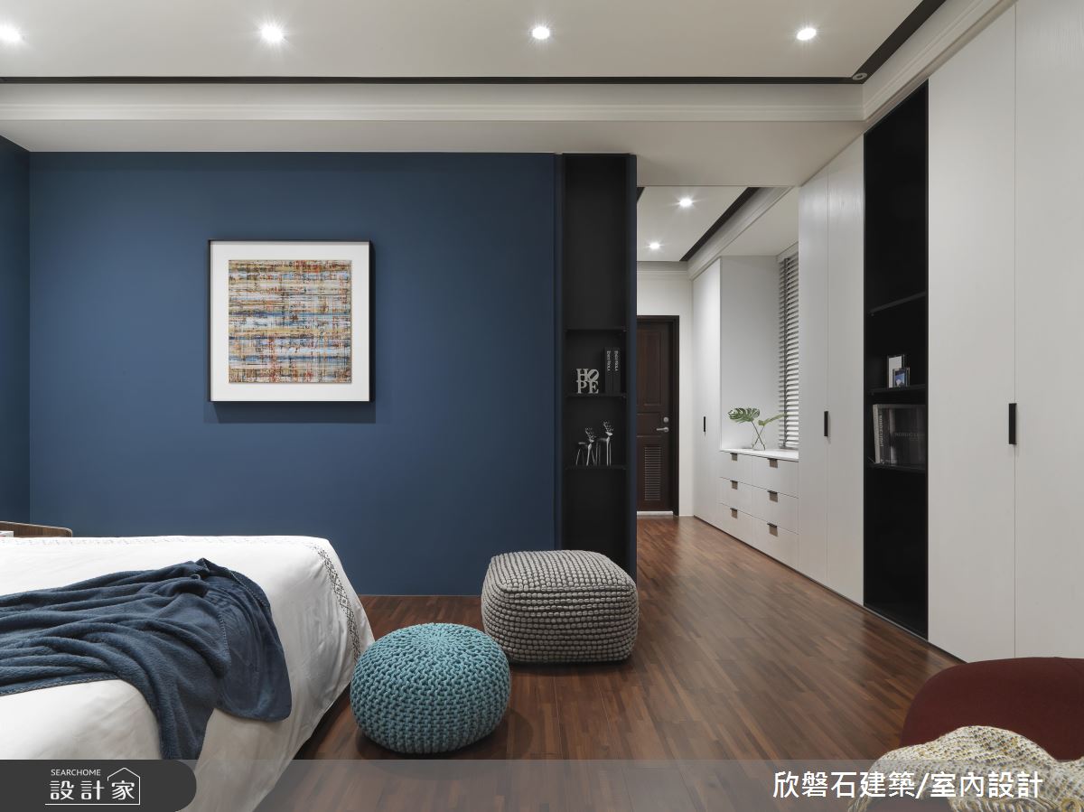 主臥以沉穩的天鵝絨藍作為主色,更在床頭點綴大理石元素,達到風格吻合的目的;因為坪數足夠,更結合閱讀、休憩等書房機能,提供寬裕的起居空間。