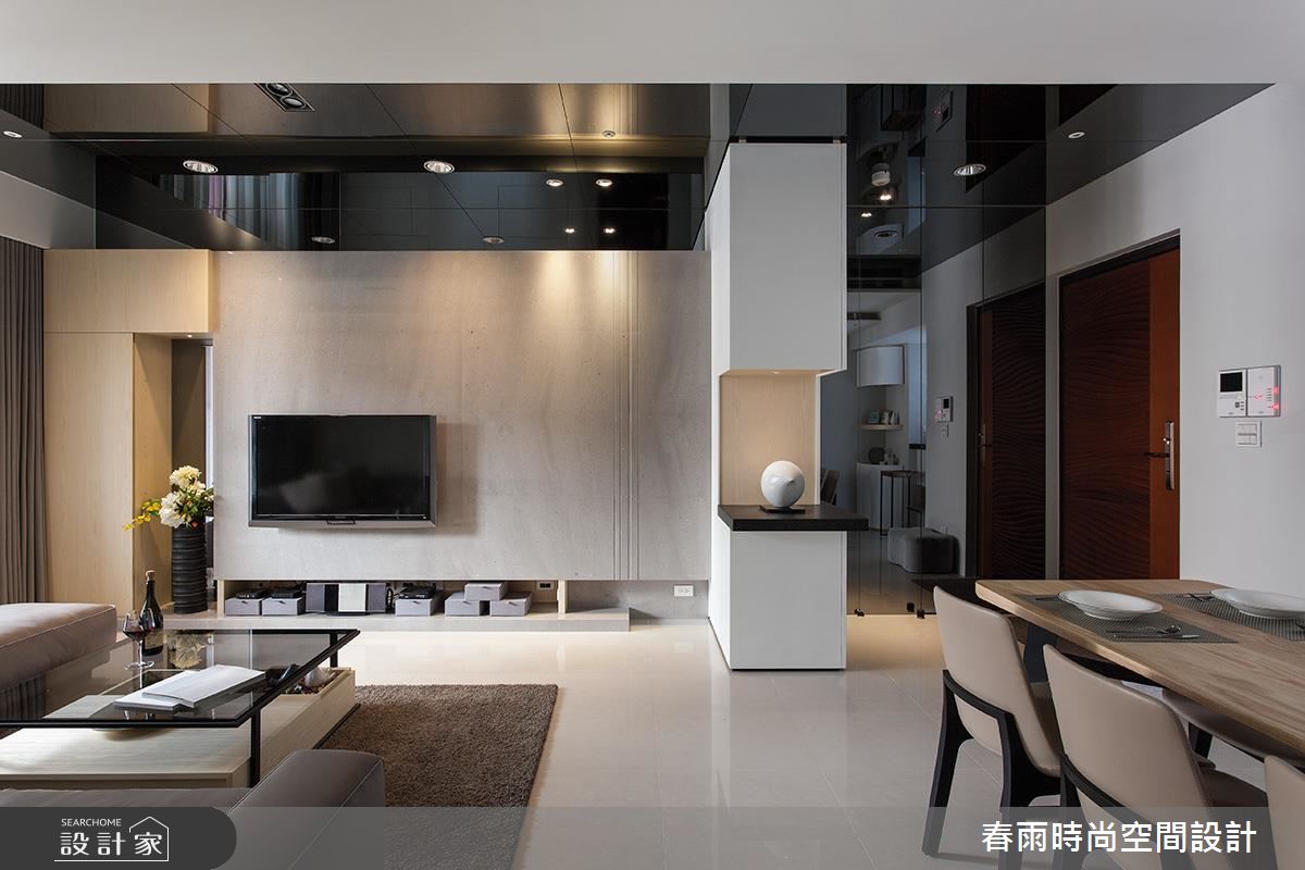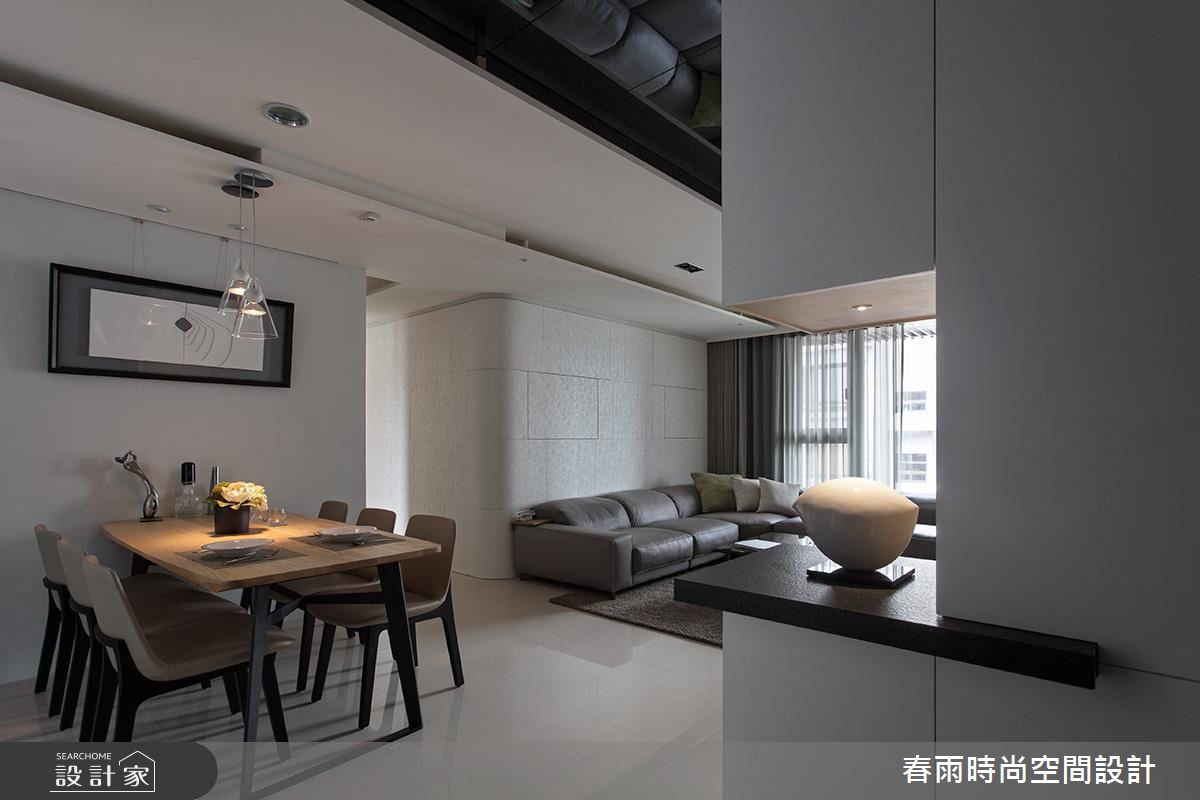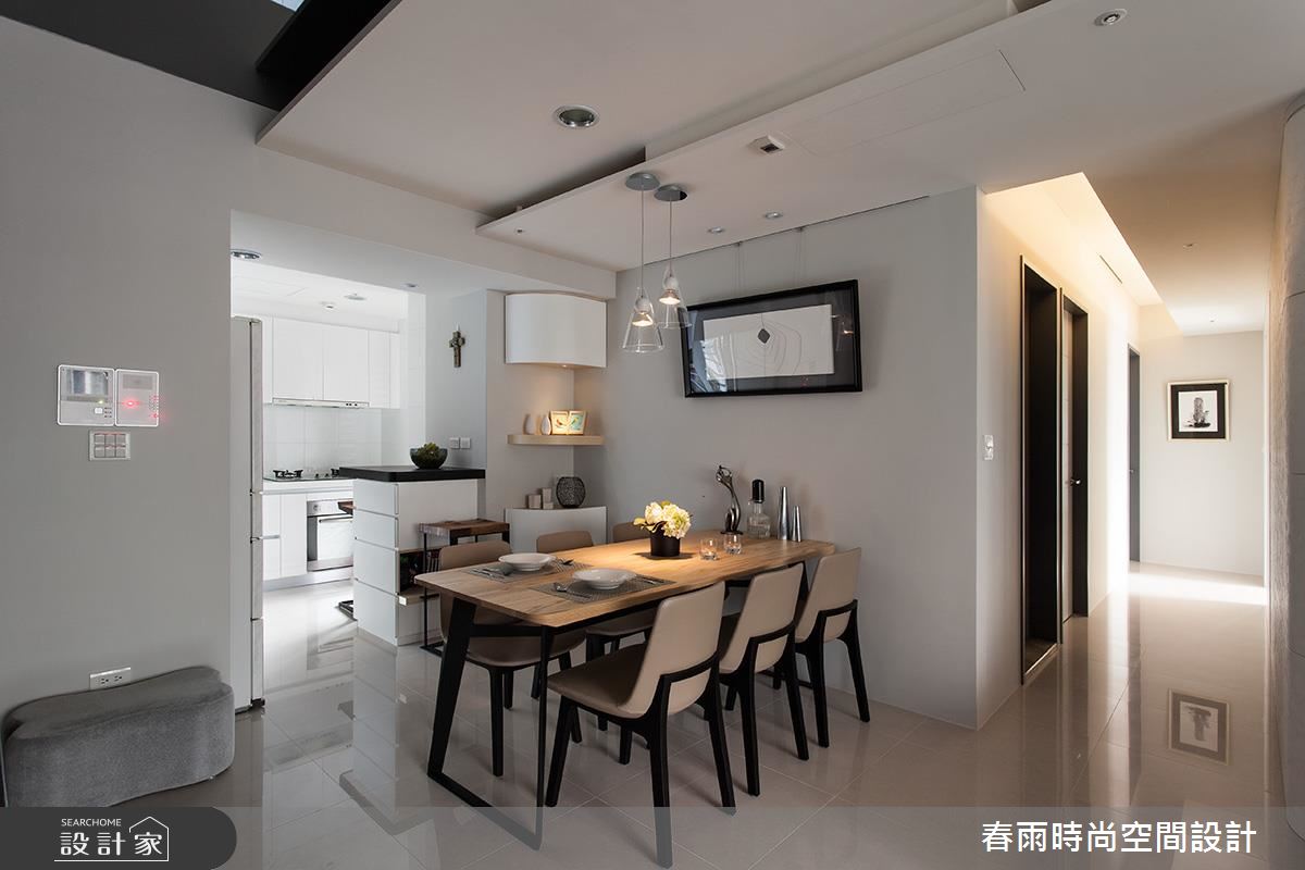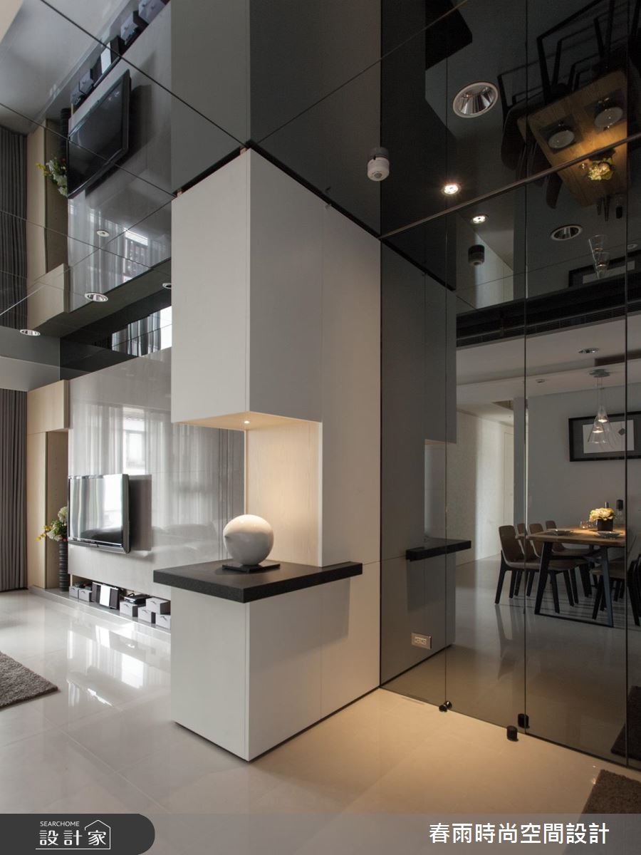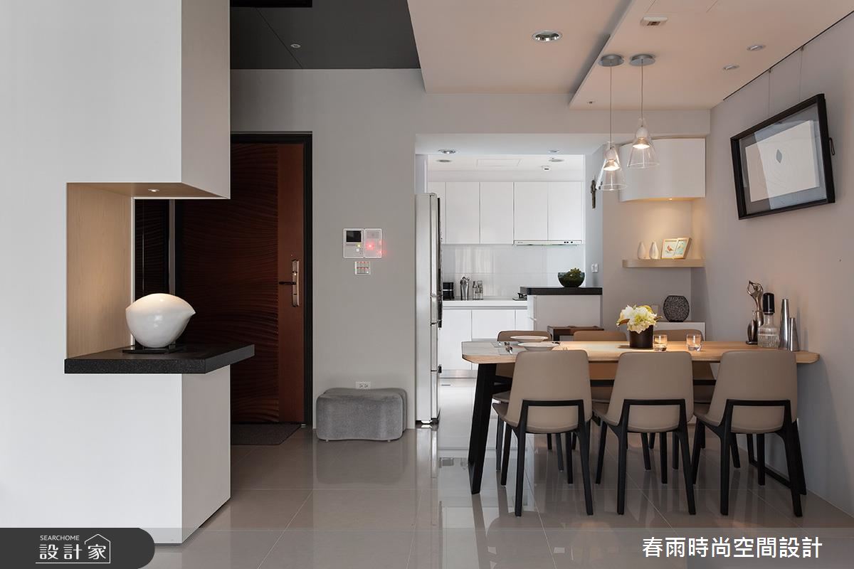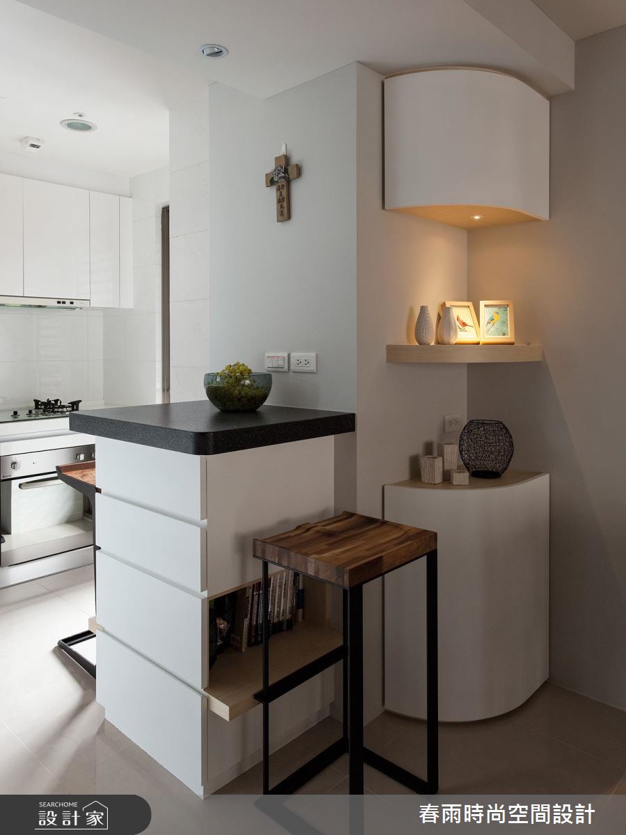設計師在玄關處加入鏡面,並順勢將材質延伸到天花,產生空間放大、拉高的錯覺效果;客廳電視牆則呈素面背景,給予細緻的溝縫勾勒、燈光修飾等,豐富牆面表情,一側更整合收納高櫃,透過上掀門與拉門的隱藏型式,將機能巧妙化為無形,沙發背牆更選用高質感的皮革,刻意圓弧導線的牆線,不僅削弱廊道的鋒銳觀感,也形成絕佳的過度動線導引,且在牆體中加入隱藏式收納空間,將儲物功能隱於高級建材之內;餐廚領域,以黑白極簡定調整體氣氛,並在餐廚之間的開放動線之中,置入一座靈巧的小中島吧檯,不只增添多樣化的用餐情境,也將此量體結合抽屜與展示機能,達成一物多用的聰明妙用!