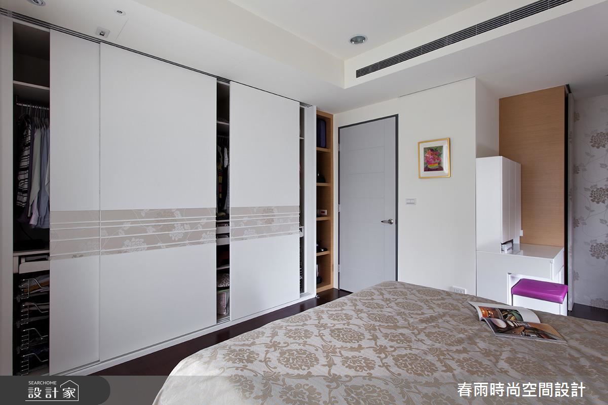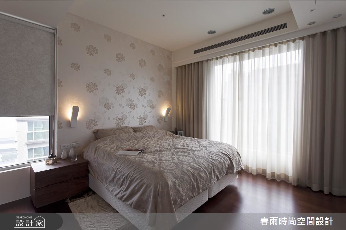 寢臥透過細緻壁紙鋪陳牆面,並挹注適度留白,彰顯空間的優雅大器,衣櫃牆腰處更做出花色點綴,與牆面及床單形成呼應,帶出專屬使用者的端莊氣質!