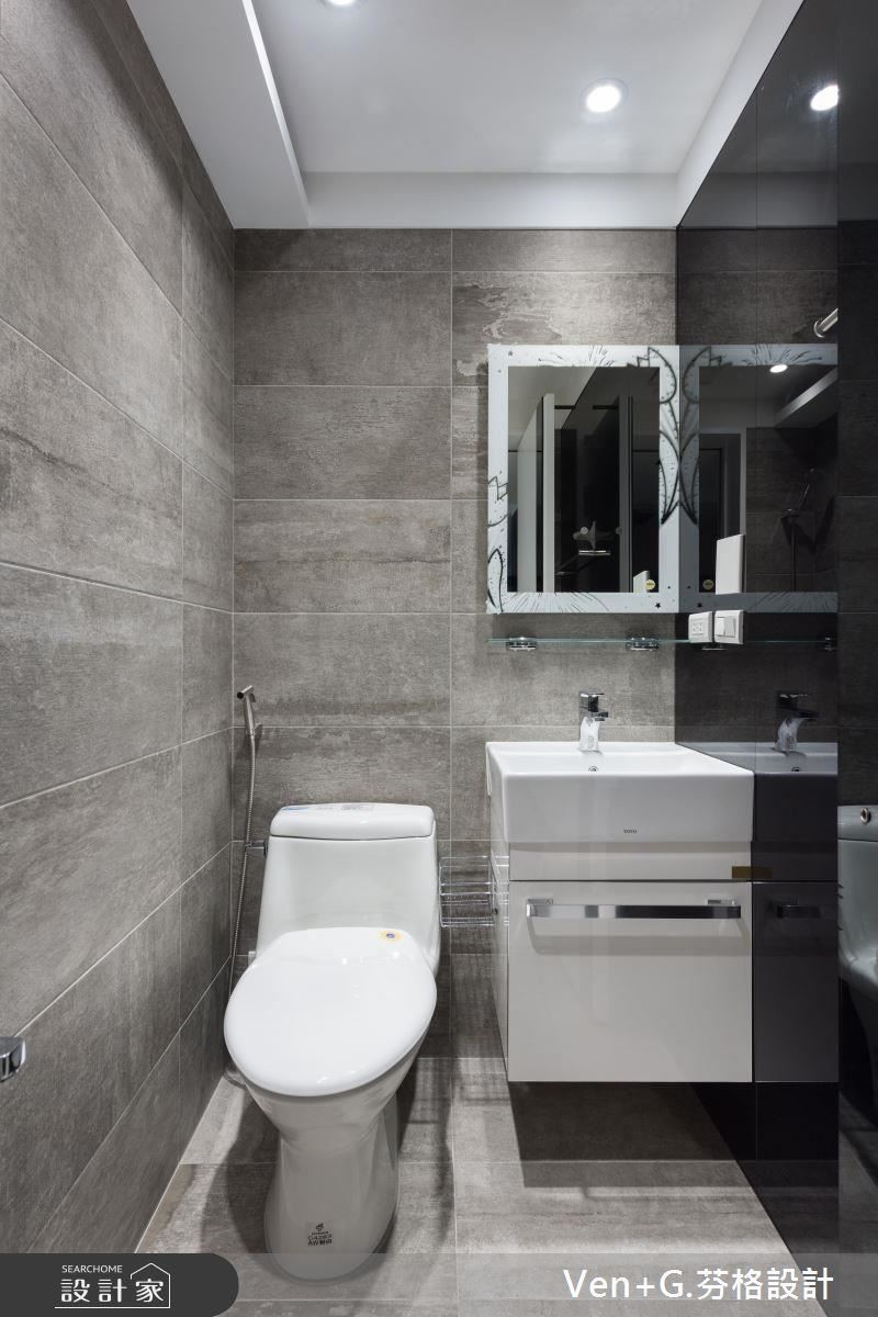 衛浴中牆面使了兩種材質,磁磚與黑玻璃,相異質地除了替小環境帶來不同表情,也因為黑玻具反射性,除了加深空間立體度,也讓整體更有層次深度。