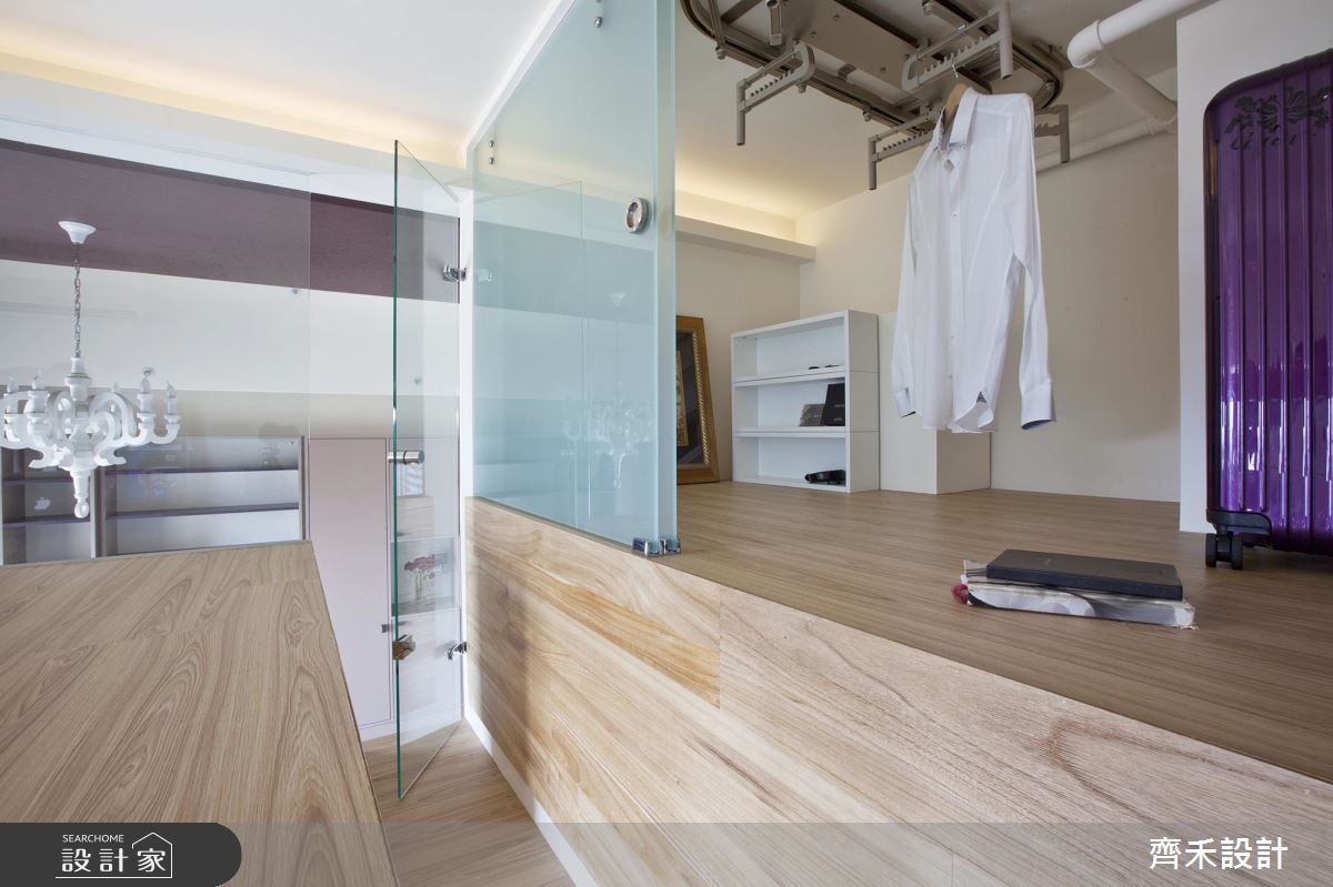 打開大門後,右側收納櫃串連電視機能,直抵窗邊陽台,木紋視覺的櫃體讓室內顯得自然舒壓,且將電視與收納功能相融為一;原3米6的房子高度無法建造出樓中樓的形式,最終在沙發後方的區塊以復式夾層來解決高度問題,結合風化木與玻璃圍塑出臥室領域,穿透質感隨著充沛的自然採光映照下,調和出流動的空間感受;臥室下方作為書房功能,低矮的天花板以風化木鋪敘,傳遞溫潤自然的感受,側邊樓梯與爬梯以不銹鋼梯搭配玻璃,交織出俐落、鮮明的結構,流露出明快的時尚品味;樓上除了規劃休憩的臥室空間,更利用玻璃拉門界定出衣櫃與更衣室,讓整體機能更加完整。