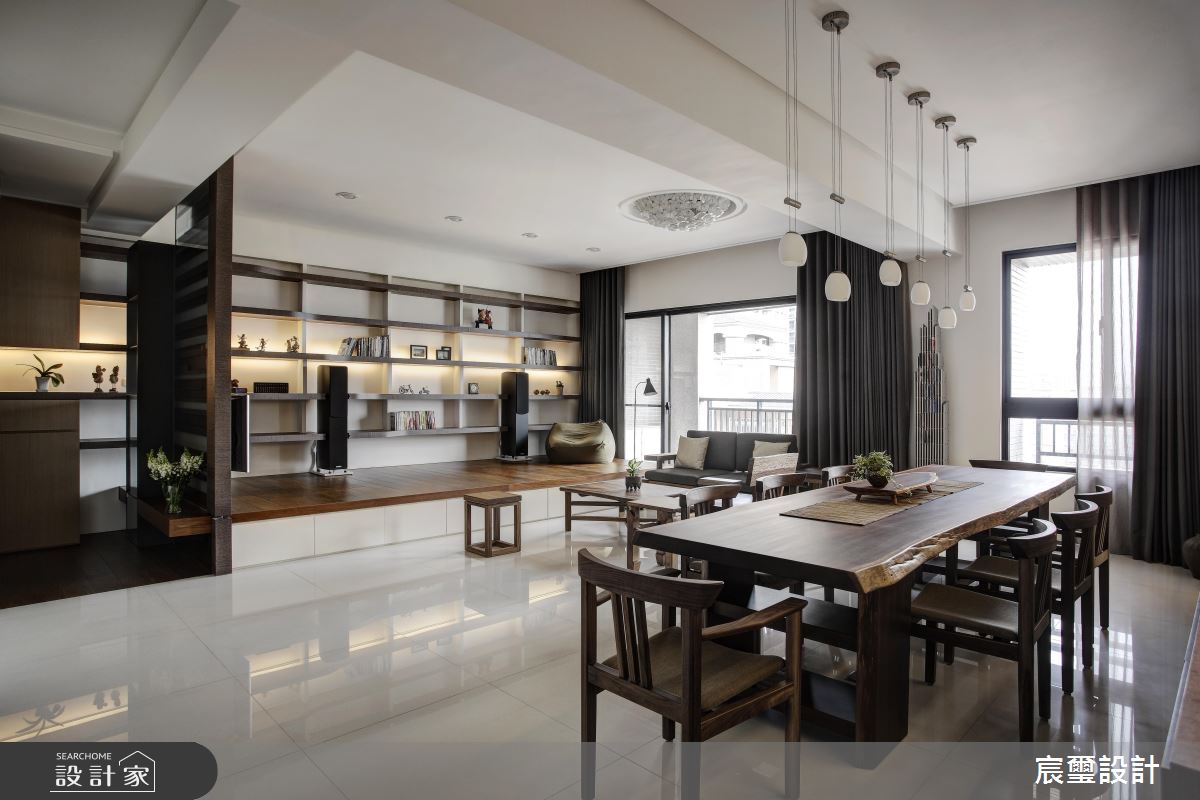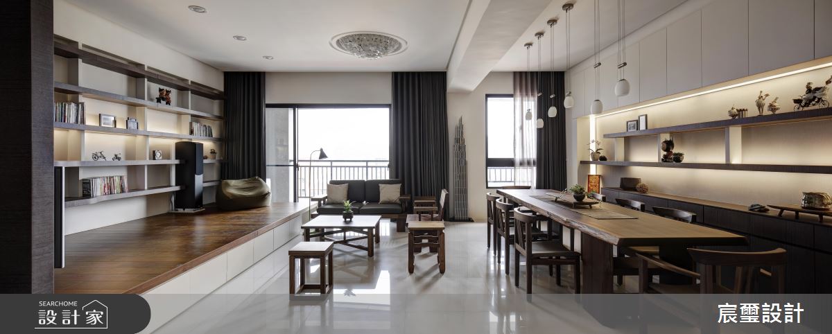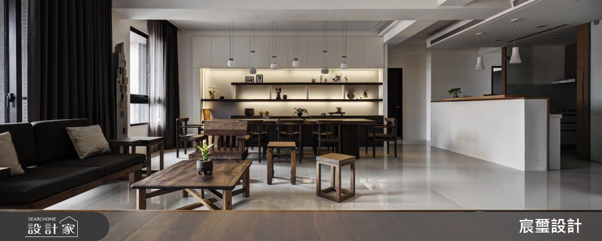 玄關處,配置具穿透性的屏風,在增加視覺延伸感之餘,也借引客廳日光,讓光線亦可照亮入門區域,地板則經由木地板、石英磚的差異轉變,做出落塵與室內的明確劃分;公領域,呈現寬敞開放的視野,沒有刻意的隔間,讓餐廳、起居書房、客廳等相互整合,變為一個完整大客廳型態,僅透過家具位置定義每個生活主題,而仿舊的原木桌椅,也增添了質樸的生活味道;尤其更顛覆電視牆作為主牆的設定,改變家的使用情境,且配置一區開放式臥榻,不僅型塑親子專屬的遊戲互動區,也在架高地坪底下暗藏實用收納機能;臥房內,則承襲著木質的寫意,彰顯自然氛圍,並納入充足陽光,注入溫潤美好的氣氛!