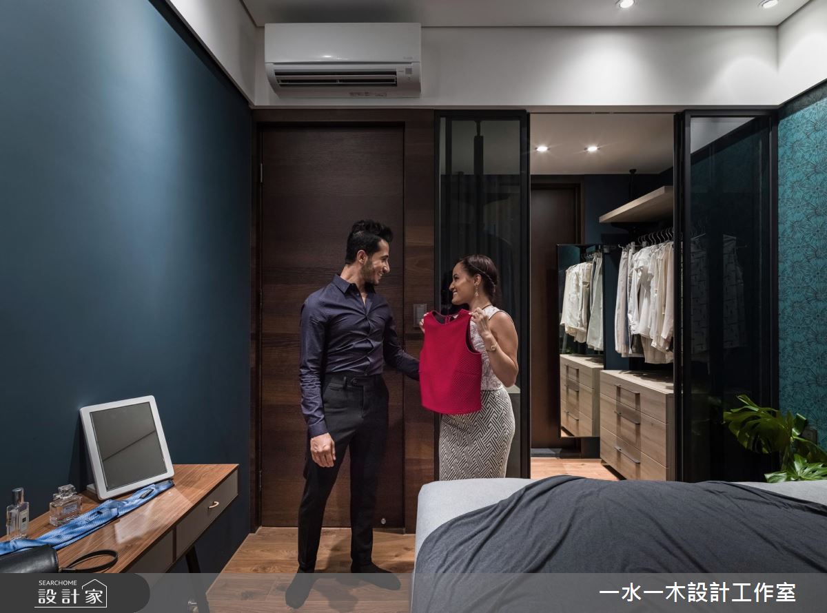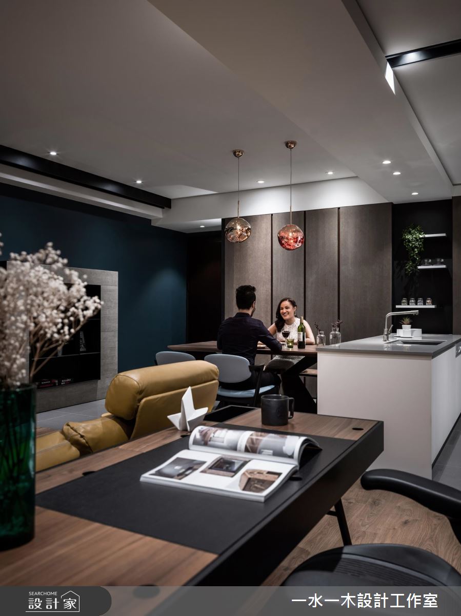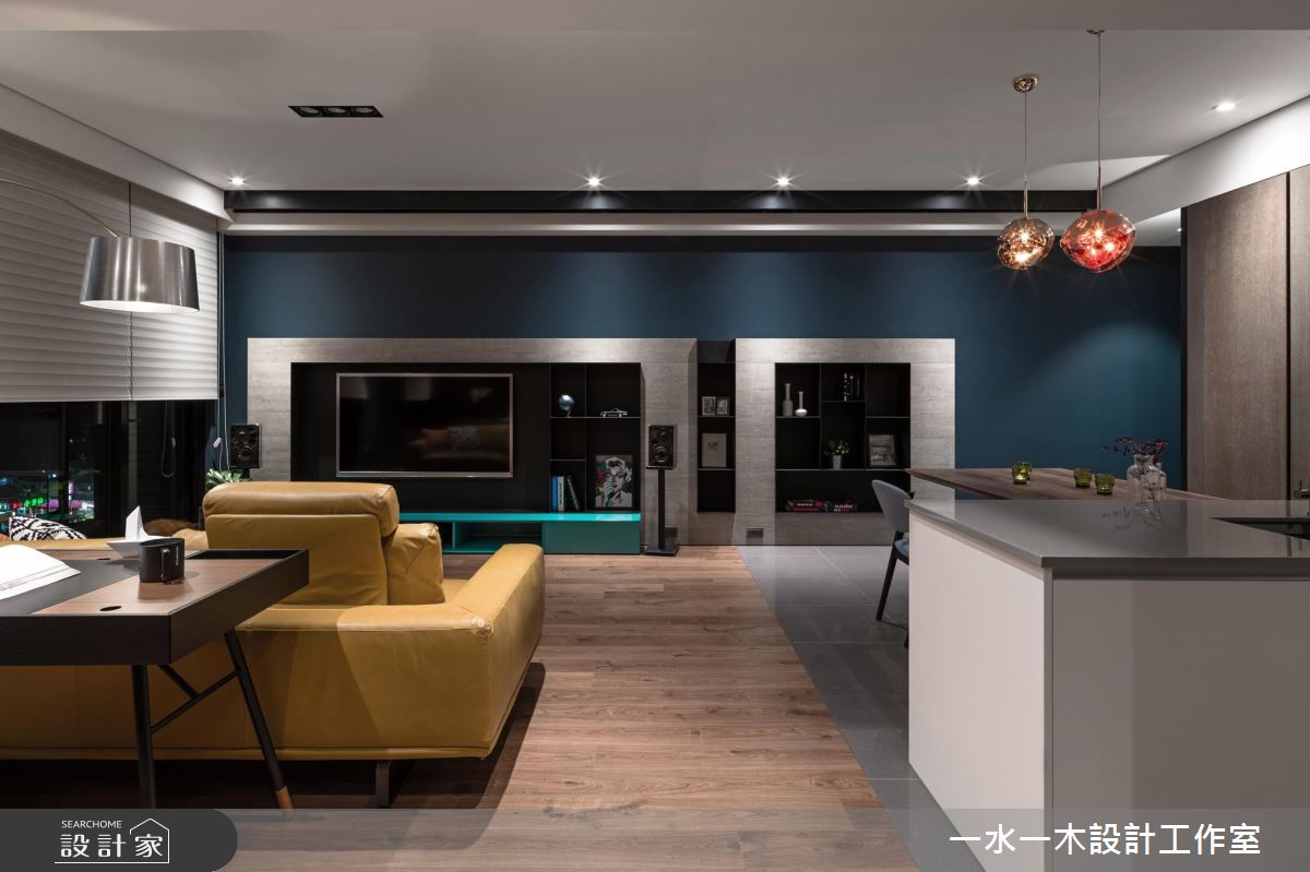 空間內,讓廳區呈開放型式,使小空間可延攬更開敞的視野,並透過地面材質差異,來區分客廳、餐廚區塊,打造既開放又獨立的微妙關係,而電視牆的設計則是一大看點,除了安置電視屏幕,也增加收納展示,讓整道牆更具層次與設計感,並引用深藍色作為背景基底,與芥末黃沙發形成色調對比,搭配著日照的光線滲透,型構富有異國感的家居氛圍;同時,將書房也納入公領域內,以低調的深色木皮鋪陳櫃面,再融入植栽、花藝等妝點,圍塑出一塊沉澱人心的閱讀角落!