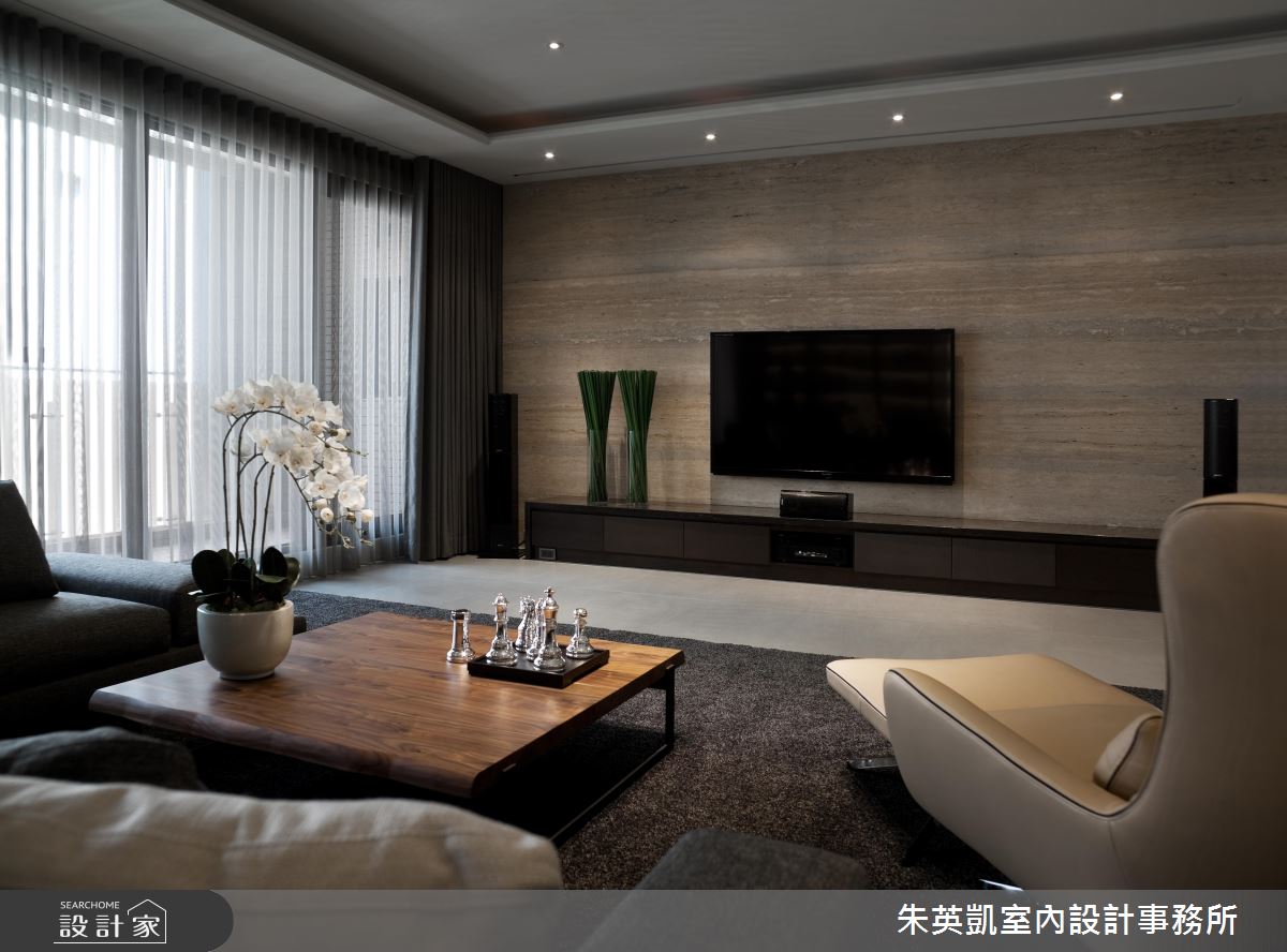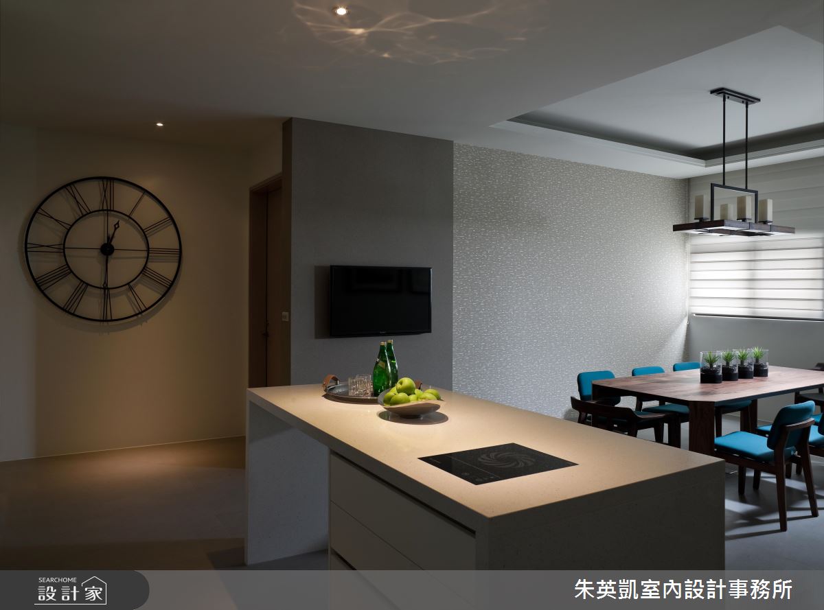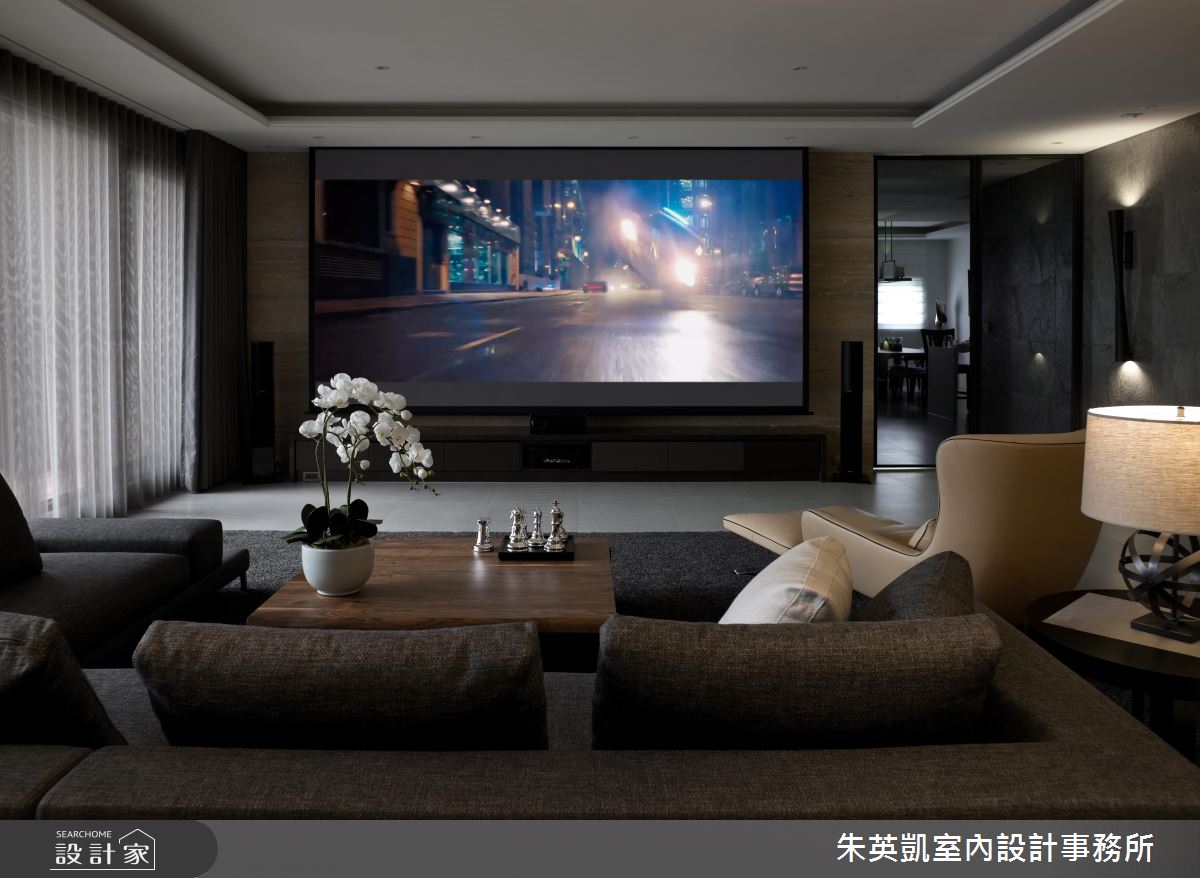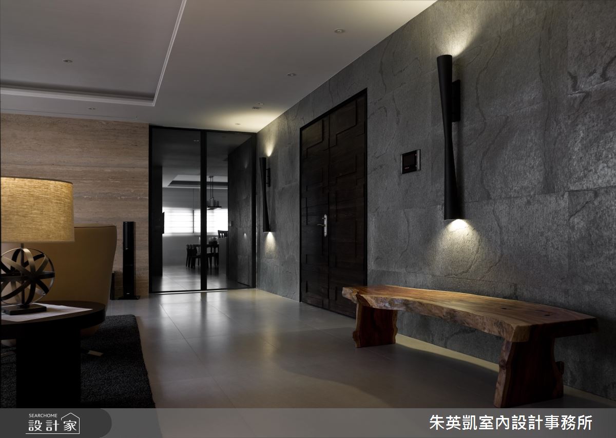 入口玄關處,設計師沿著立面鋪陳薄片石材,加以照明燈光烘托氣氛,照映出細緻的建材層次;步入廳區,設計師採以淺色洞石打造電視牆,形成充滿暖意的背景,一旁連接灰玻延伸牆面尺度,順勢帶出半穿透的視線連結,而電動投影布幕的規劃,更隨時讓客廳可變為家庭劇院,讓一家人在此共享天倫;餐廚領域,則在立面加入進口壁紙、特殊漆料,透過壁材與燈光的掩映,彰顯每道細節的變化層次,並同時配置吧檯與一般餐桌,跳脫傳統的制式感,賦予更具互動性的用餐情境;私領域,則將地坪轉化為溫煦的木地板,回歸溫潤質感,並搭佐帶有鄉村風韻的家具,以及柔和的採光照拂,凝聚紓壓的起居氣氛!