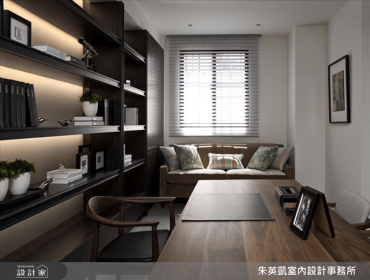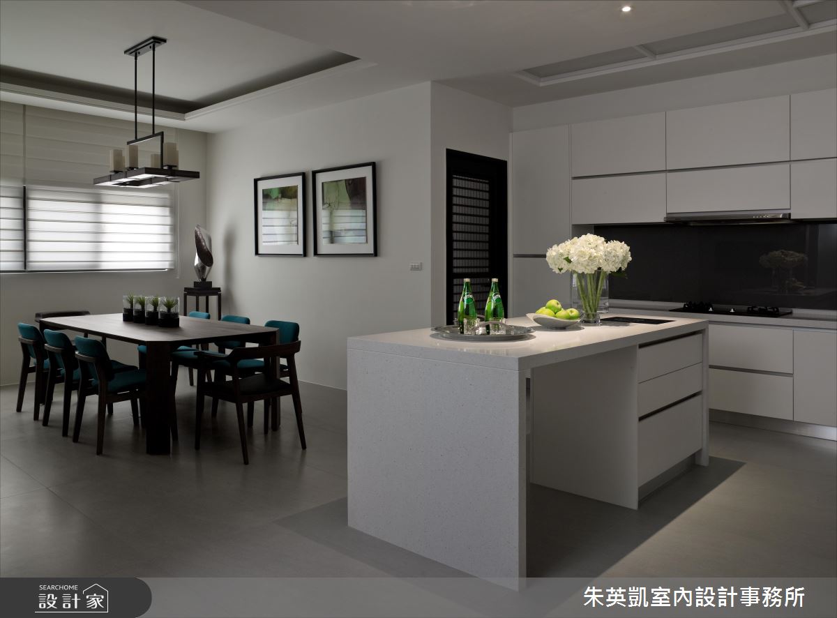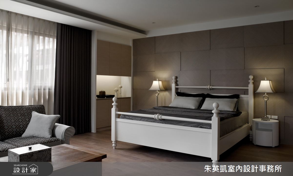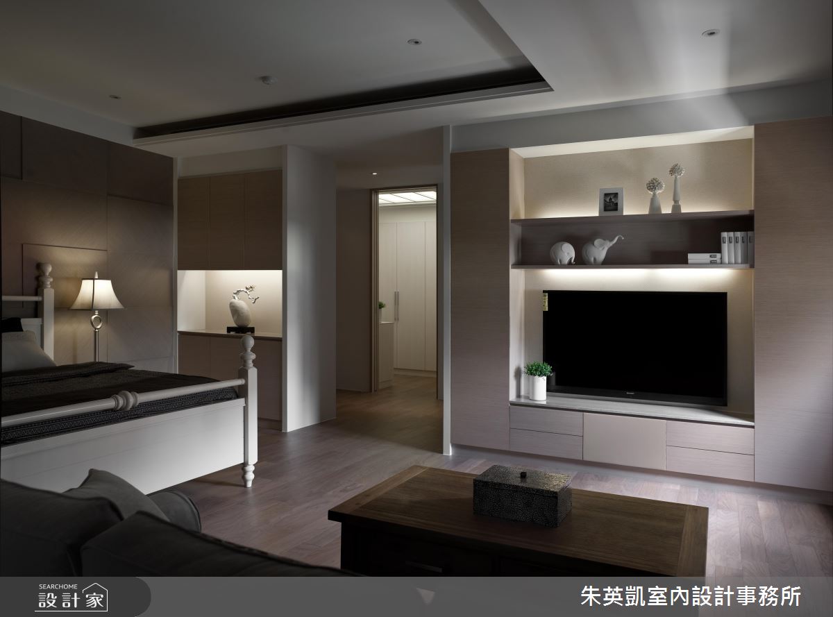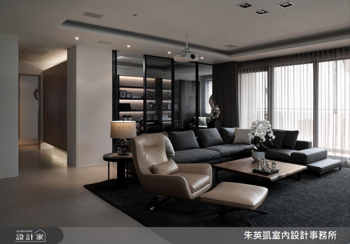 入口玄關處,設計師沿著立面鋪陳薄片石材,加以照明燈光烘托氣氛,照映出細緻的建材層次;步入廳區,設計師採以淺色洞石打造電視牆,形成充滿暖意的背景,一旁連接灰玻延伸牆面尺度,順勢帶出半穿透的視線連結,而電動投影布幕的規劃,更隨時讓客廳可變為家庭劇院,讓一家人在此共享天倫;餐廚領域,則在立面加入進口壁紙、特殊漆料,透過壁材與燈光的掩映,彰顯每道細節的變化層次,並同時配置吧檯與一般餐桌,跳脫傳統的制式感,賦予更具互動性的用餐情境;私領域,則將地坪轉化為溫煦的木地板,回歸溫潤質感,並搭佐帶有鄉村風韻的家具,以及柔和的採光照拂,凝聚紓壓的起居氣氛!