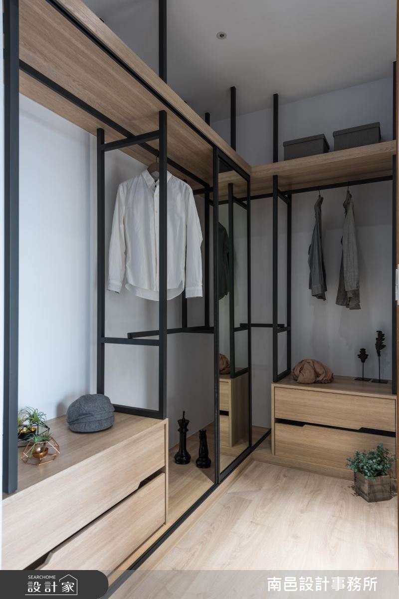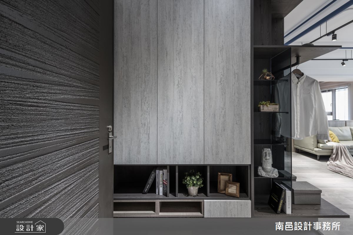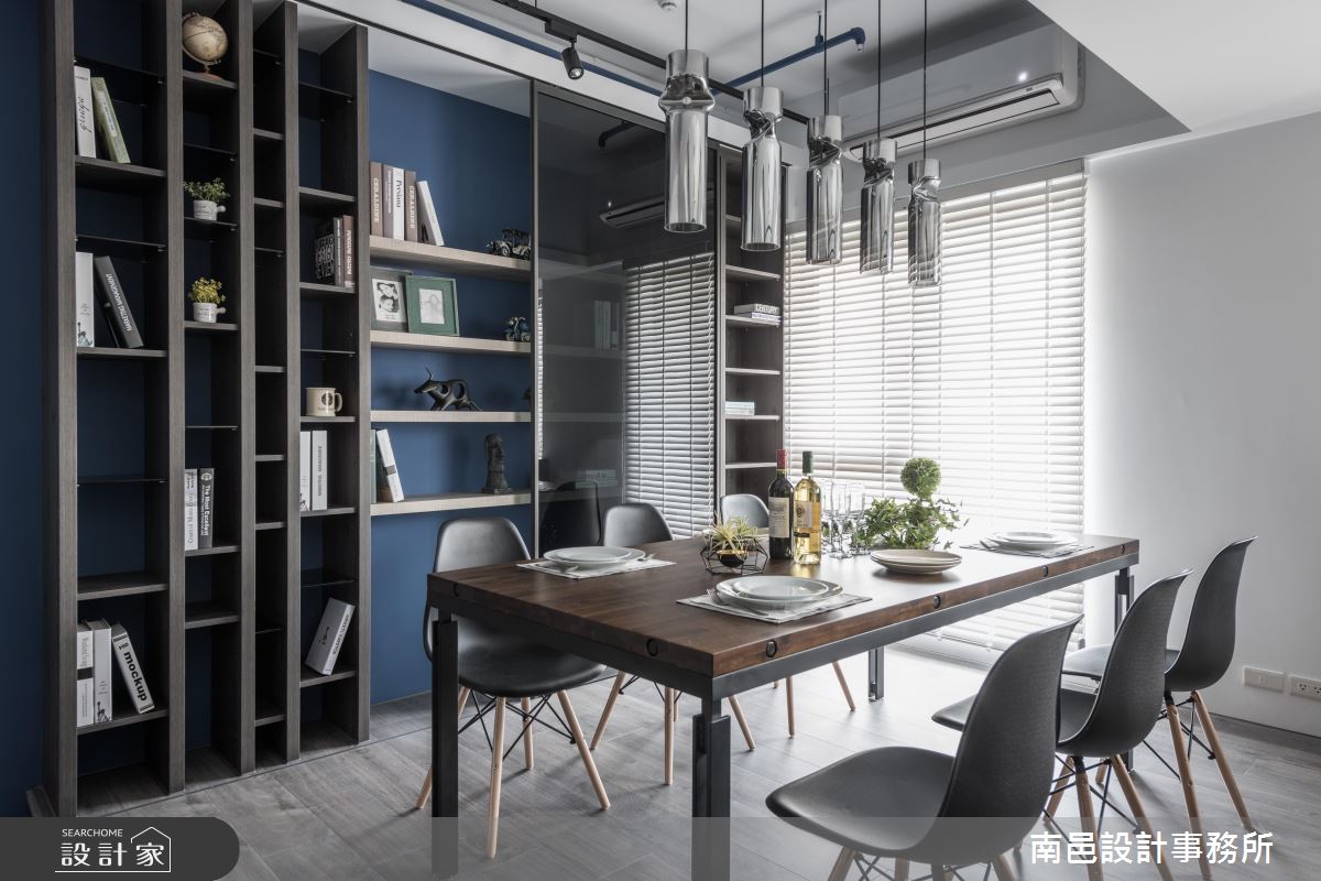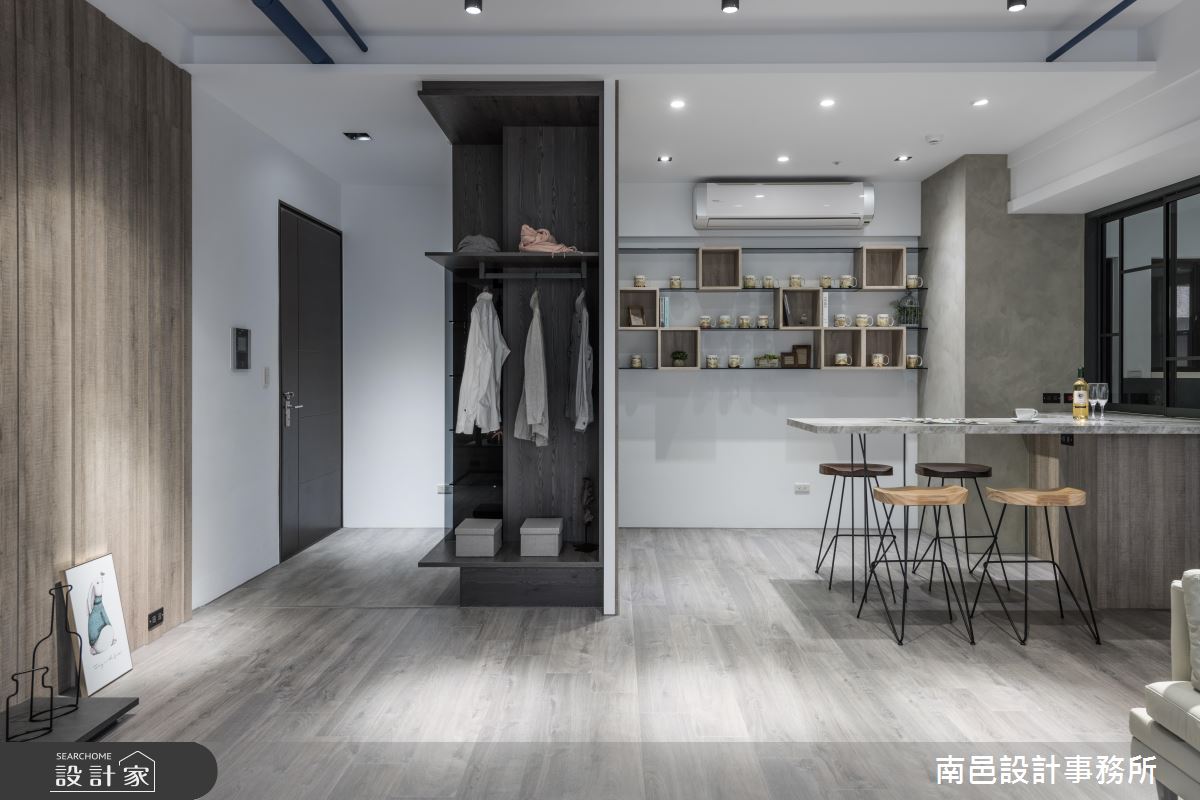 設計師將重點放在公領域動線分配,採開放空間串連客、餐廳與休閒吧台。玄關利用櫃體抹除開門見灶的尷尬感,並善用轉角空間加入衣帽架機能,進入客廳時即可卸除所有負擔。為了達到空間放大的目的,除了開放設計,更保留原始天花板高度、以矮牆取代隔間牆,讓光線毫無阻礙地進入公領域。設計師更在獨立廚房的連接處設計多功能 L 型吧台,並採用玻璃作為隔間,防止油煙溢散卻不減通透度。針對風格營造,設計師依據屋主喜愛的現代氣息,以低彩度為主體,搭配色調輕淺的木皮、木地板,與牆面灰階特殊漆的紋理相呼應,軌道燈更展現俐落特色,餐廳主牆與廊道底部的湛藍色調則成為亮眼端景。