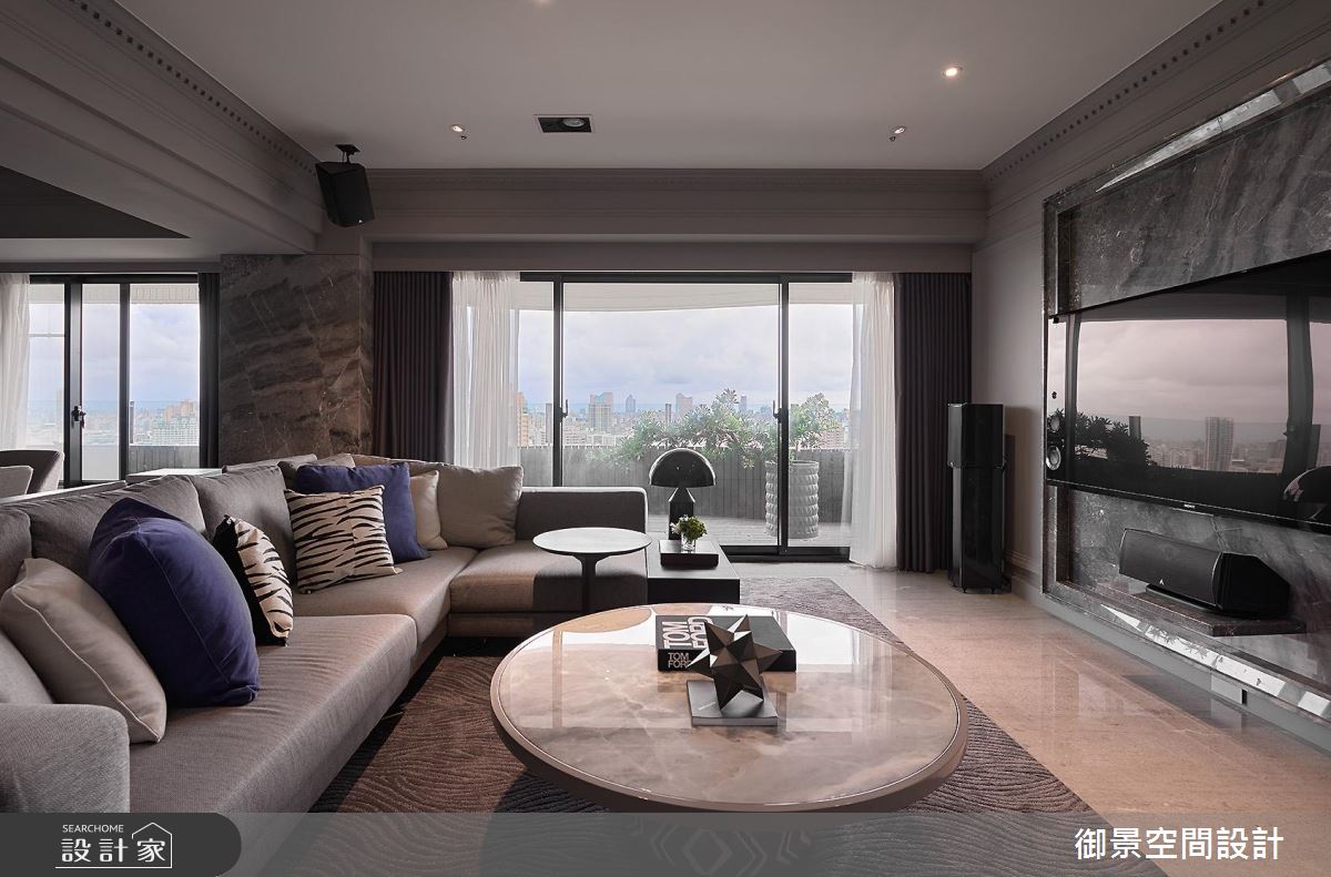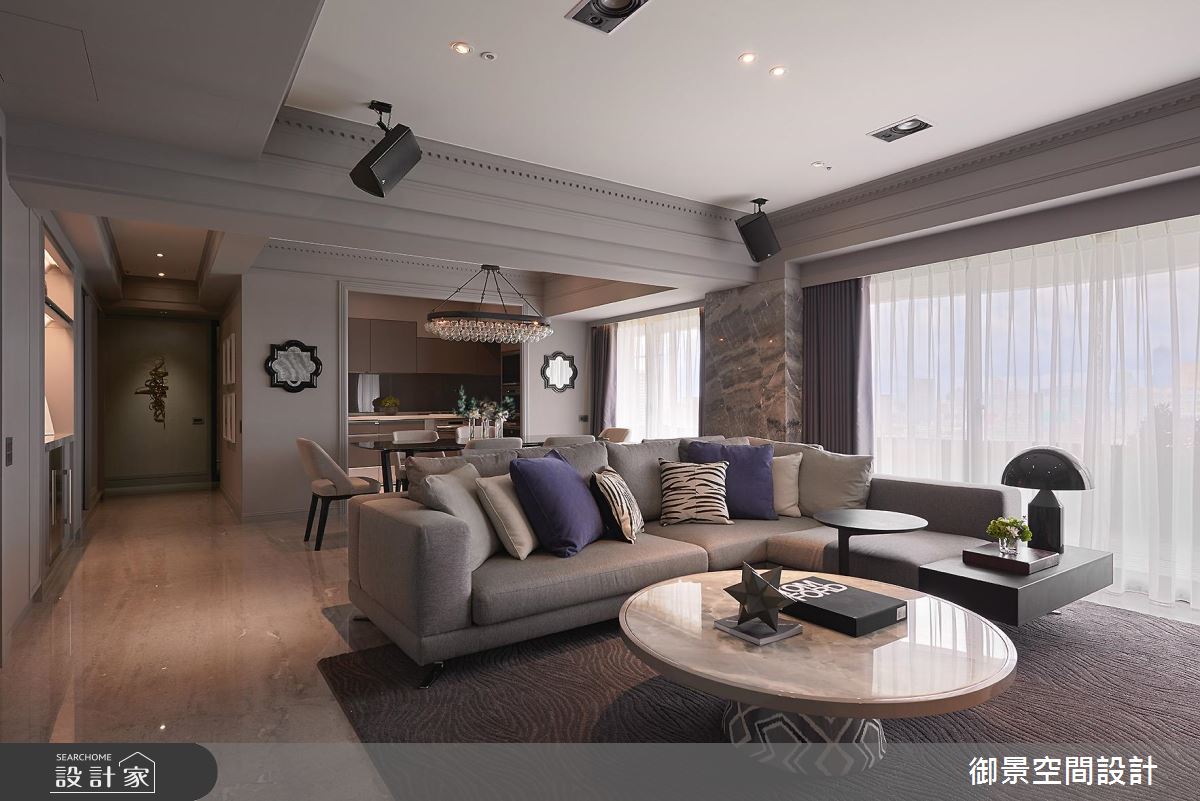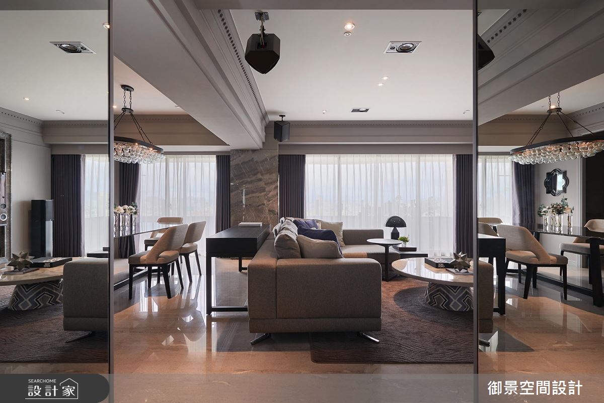 寬敞的65坪空間裡,擁有絕佳的採光優勢,可利用空間的完整性也較高,各場域的比例切割成為設計重點;而面對存在的樑柱結構,則藉由線版比例的拿捏,整合材質並予以簡化的手法,融入整體的設計裡。戶外充沛的暖陽穿越陽台的玻璃拉門,灑落滿室潔淨之意,玄關到客廳之間,以一道貼附鏡面的門框界定,公領域裡以傳統的噴漆手法傳遞出新古典的細緻、溫潤美感;電視牆以大面石材鋪陳,茶几挑選銀白色調的圓弧形石材,與電視牆相互呼應;L型沙發的後方為餐桌區,上方擺設手工口吹玻璃燈罩,並焊接不鏽鋼金屬結構的燈飾,展現動人的時尚工藝;一旁壁面則以大理石飾底、透亮的鏡面分割手法,規劃出平台與收納機能的minibar,彰顯屋主對生活的非凡品位。