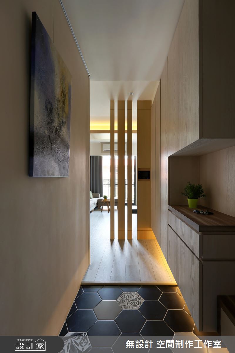 玄關利用六角磚做出內外地坪區隔,並以大面積懸櫃提供充足收納機能。櫃底的間接照明與隔柵式屏風為沒有採光的玄關引入充足的光線,將危險降至最低。公領域採開放設計且並未更動格局,更抹除多餘贅飾,僅以木皮塗裝板、超耐磨木地板和淺色油漆巧妙營造舒心、療癒的效果,將重點放在軟件家具與植栽的色彩搭配,精準控制預算。主臥與兒童房以清爽的色調與木質元素打造美型與機能兼具的舒眠空間。