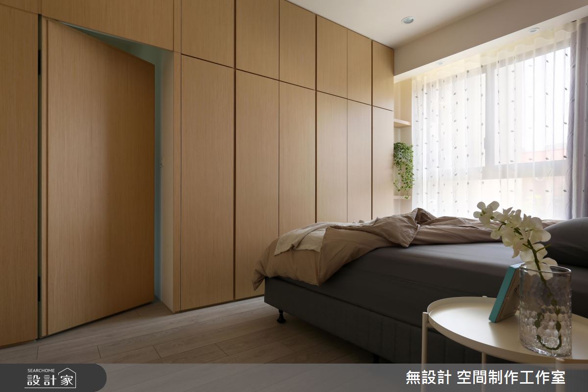主臥與次臥皆利用大量木元素鋪陳,點綴植栽與簡約家具,更比照公領域衛浴入口,善用隱藏門片設計,達到清爽視覺目的。