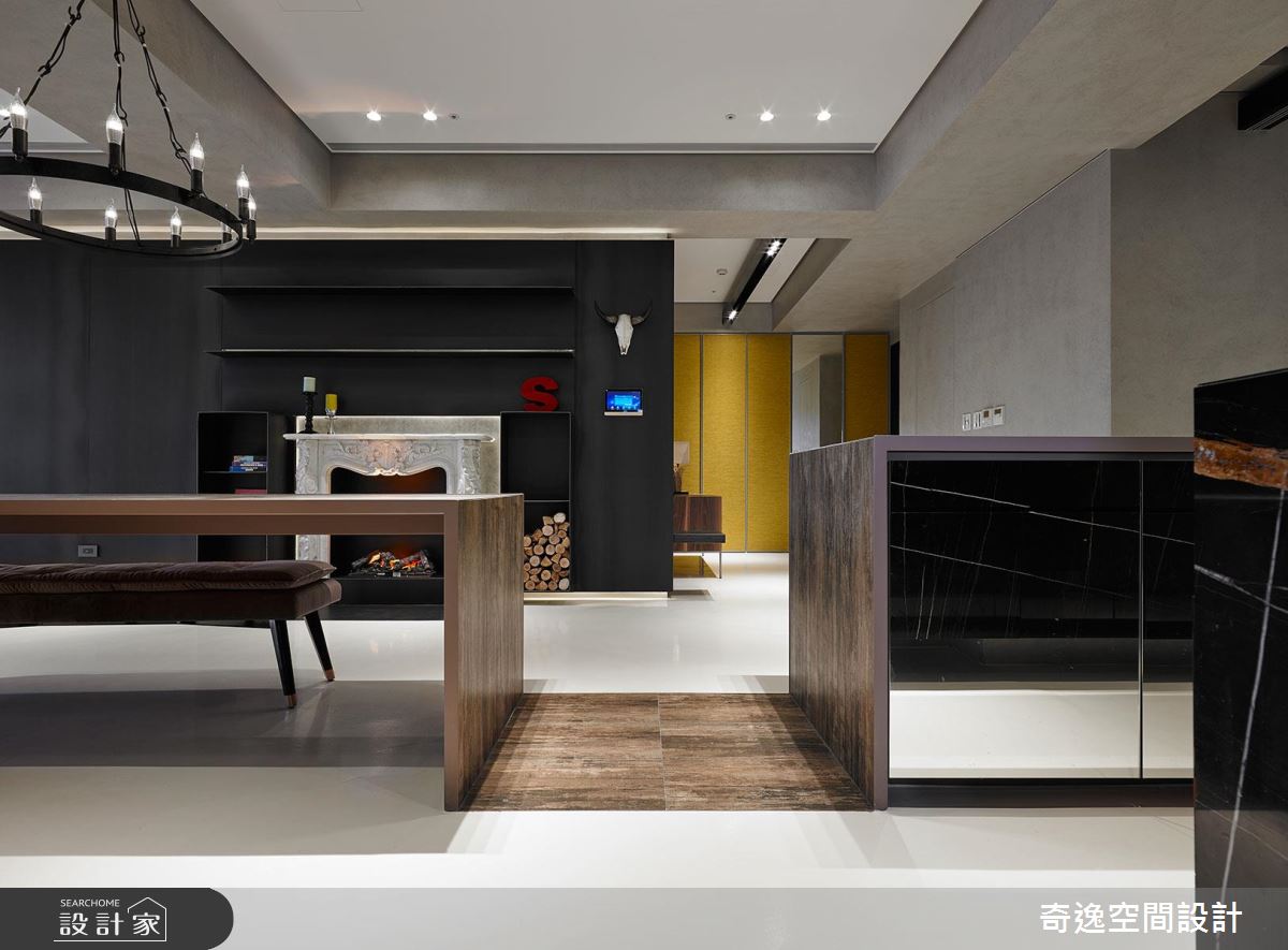 入室後的玄關,藉由木作矮櫃、人物雕像的藝術畫作打造一處現代感的前衛端景,引領出家屋的風格特色。沿著清水模質感的壁面走進餐廳區,以黑鐵板鋪陳的主題牆,融入白色古典歐風的壁爐設計,更延伸出整片電視牆體,大面積的尺度擘劃,彰顯非凡氣勢;壁爐造型牆結合鮮明的黑白色系,對比的視覺形塑出強烈的時尚風情,上方以層板規劃出展示機能,下方則以原木堆疊,與壁爐內的溫度相互呼應,增添溫暖感受;吧檯與餐桌間以同樣木紋質材的地坪做為串連,視覺延伸的感受讓領域更顯遼闊、放大;吧檯後方的收納櫃結合LED燈與鏡面,穿透視覺與光感交織出新穎的前衛感;吧檯旁設計一道玻璃拉門,界定出書房區域,明亮的光線與開放的展示書架,釋放出自然、紓壓的人文氣息,轉向客廳時,視線更能一眼望向落地窗,視線隨之遼闊、開放。