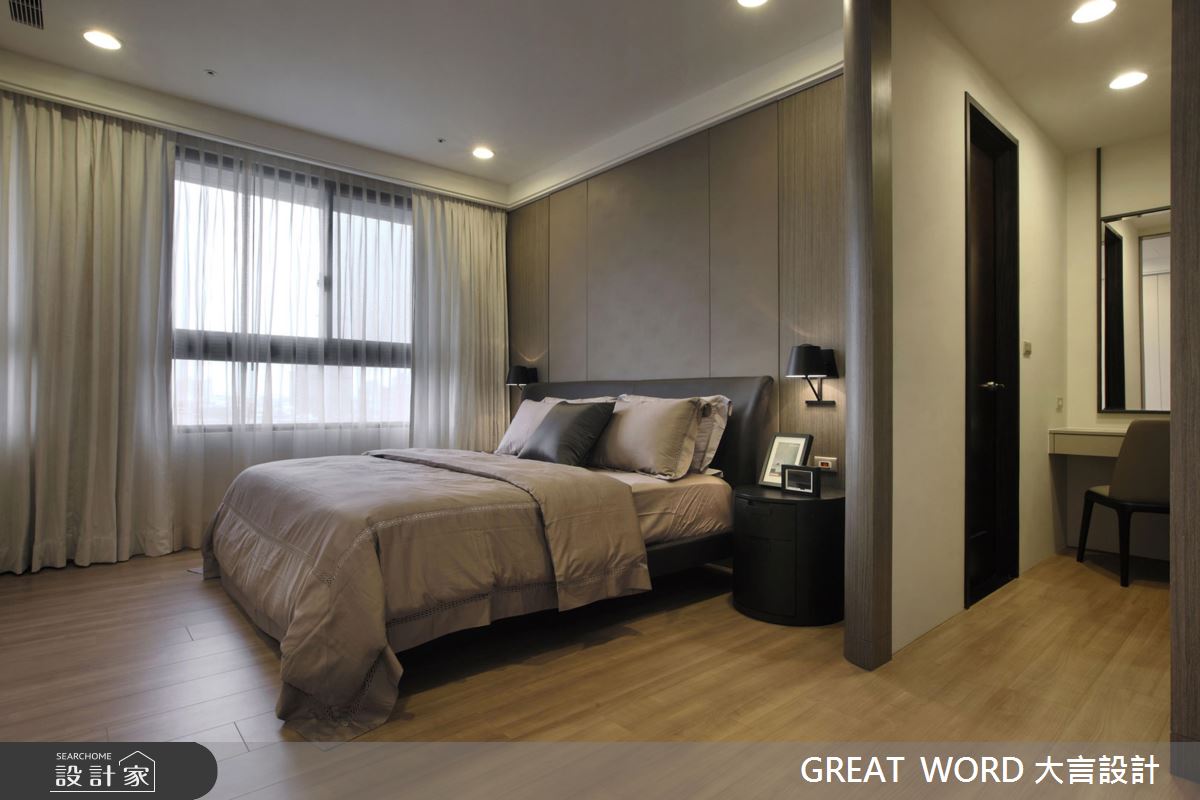針對私領域部分,主臥以溫潤的棕色調為主,搭配裱布、木皮建材與弧形設計,同樣凸顯了舒眠空間應有的安穩效果。