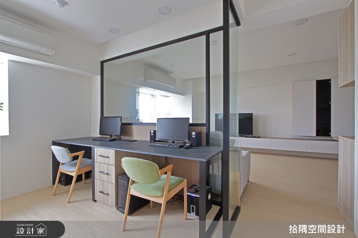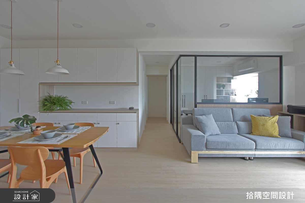 首先針對採光規劃,設計師依據屋主需求,將最好的光源保留給前陽台與客廳;接著以大量純白色調渲染整體空間,並精準掌握木元素比例,打造清新紓壓的端景。為了讓開放公領域的採光能毫無阻礙,特地使用近年非常受歡迎的玻璃與鐵件取代隔間,維持書房隱私卻不減通透感。由於放大視覺感受也是一大重點,巧妙以純白色調從玄關鞋櫃、餐櫥櫃一路延伸到電視牆,並以木地板、部分櫃面的輕淺木紋營造簡約、溫暖的風格,更滿足屋主大量的收納需求。