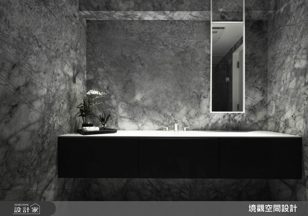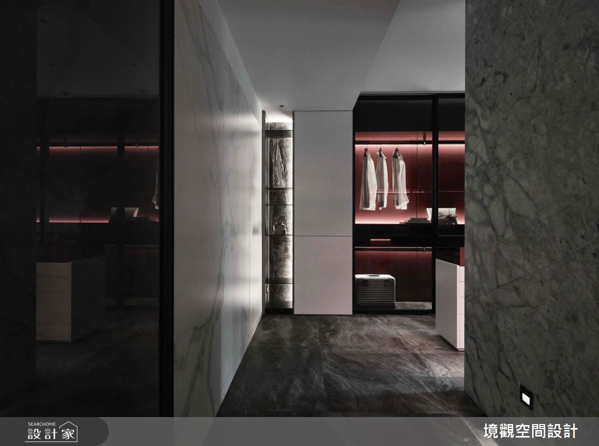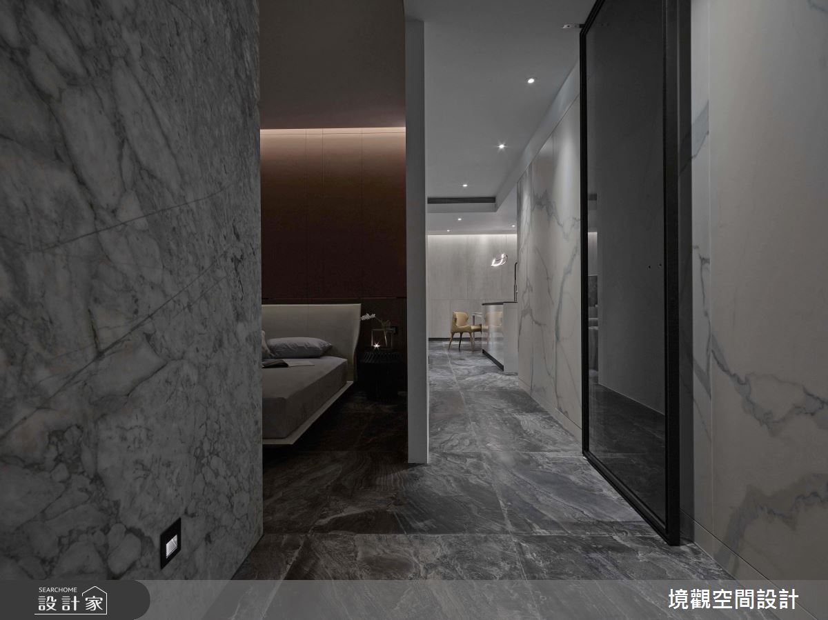 空間中,採用簡單的線條勾勒空間量體,並賦予材料新的意義,在每道壁面、地坪配置不同的大理石材,型塑如同潑墨畫般的視覺效果,透過色彩流動與自然紋理的展現,挹注自然感及時尚品味,表現材質最美好的肌理質感;色調分配上, 則選用灰色或白色相互交織,把視覺壓力降至最低,凝聚通透的視覺感受,再搭配充滿時尚俐落感的鈦金屬燈,於半空中綻放醒目的姿態,緩和整體冷冽感;臥室及更衣間內,則轉換建材,在檯面或床頭裱貼皮革,搭配光線折射,照映出面材的特殊光澤,在灰底之中,注入現代的時尚氣質!