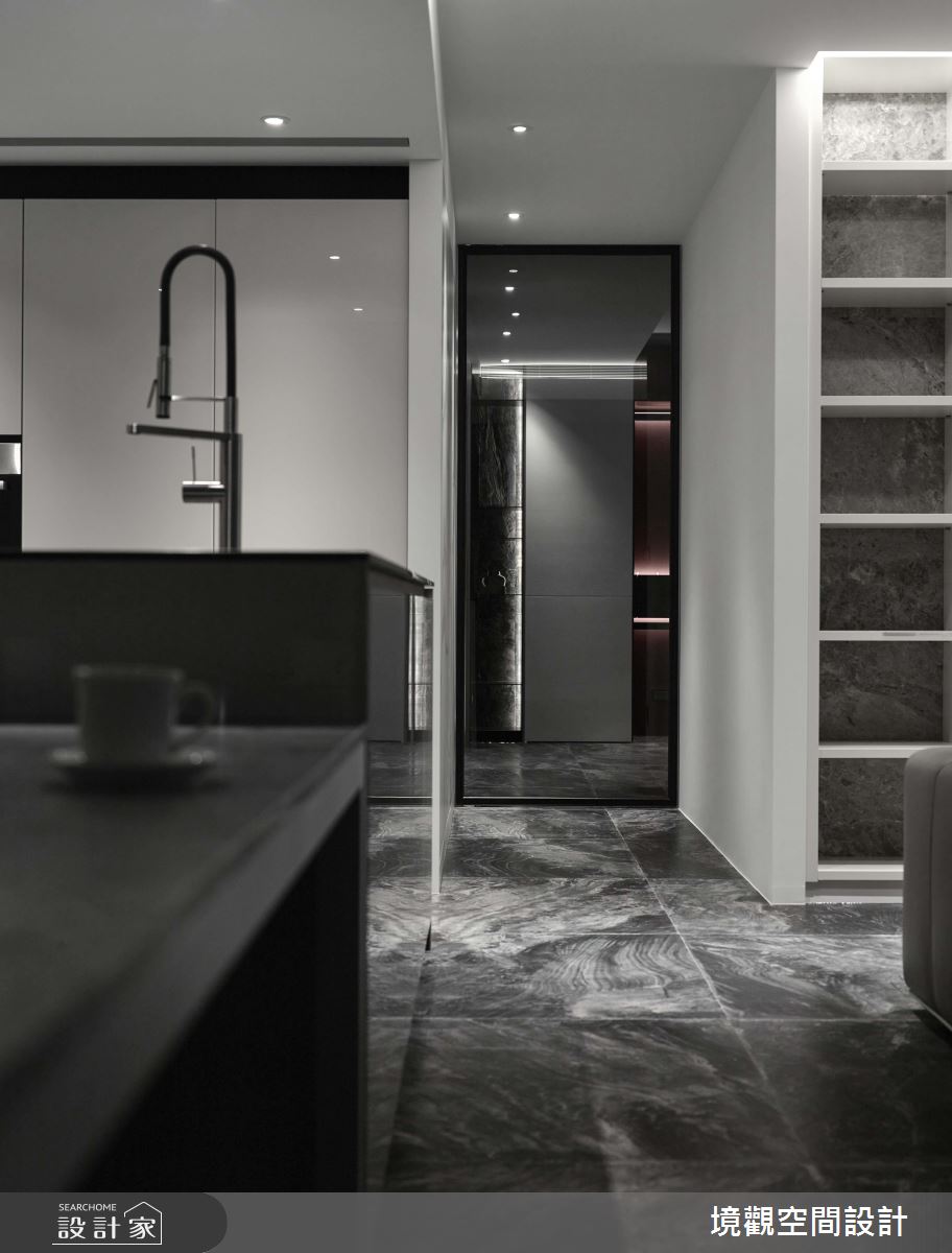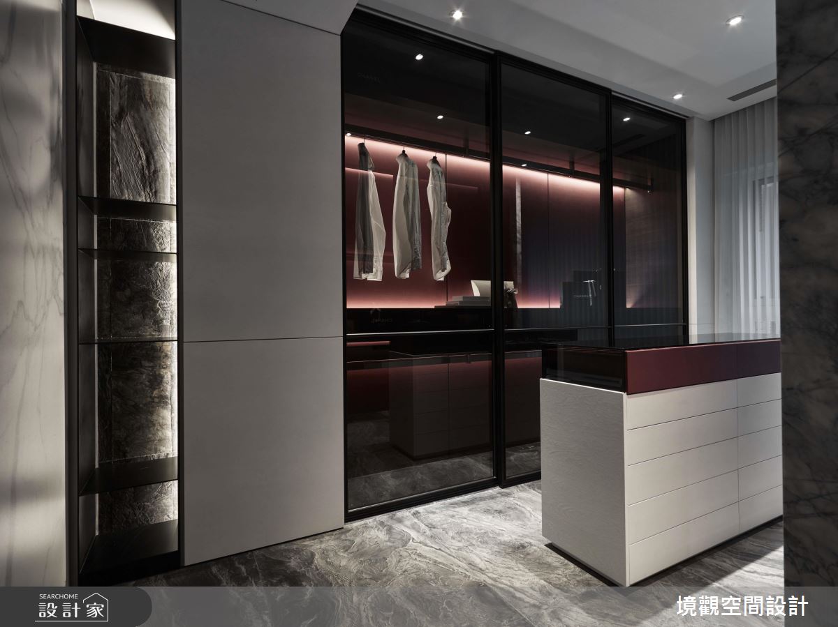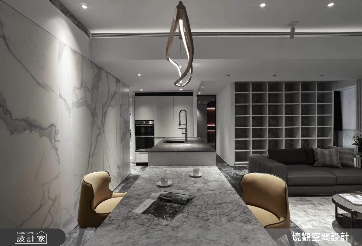 空間中,採用簡單的線條勾勒空間量體,並賦予材料新的意義,在每道壁面、地坪配置不同的大理石材,型塑如同潑墨畫般的視覺效果,透過色彩流動與自然紋理的展現,挹注自然感及時尚品味,表現材質最美好的肌理質感;色調分配上, 則選用灰色或白色相互交織,把視覺壓力降至最低,凝聚通透的視覺感受,再搭配充滿時尚俐落感的鈦金屬燈,於半空中綻放醒目的姿態,緩和整體冷冽感;臥室及更衣間內,則轉換建材,在檯面或床頭裱貼皮革,搭配光線折射,照映出面材的特殊光澤,在灰底之中,注入現代的時尚氣質!