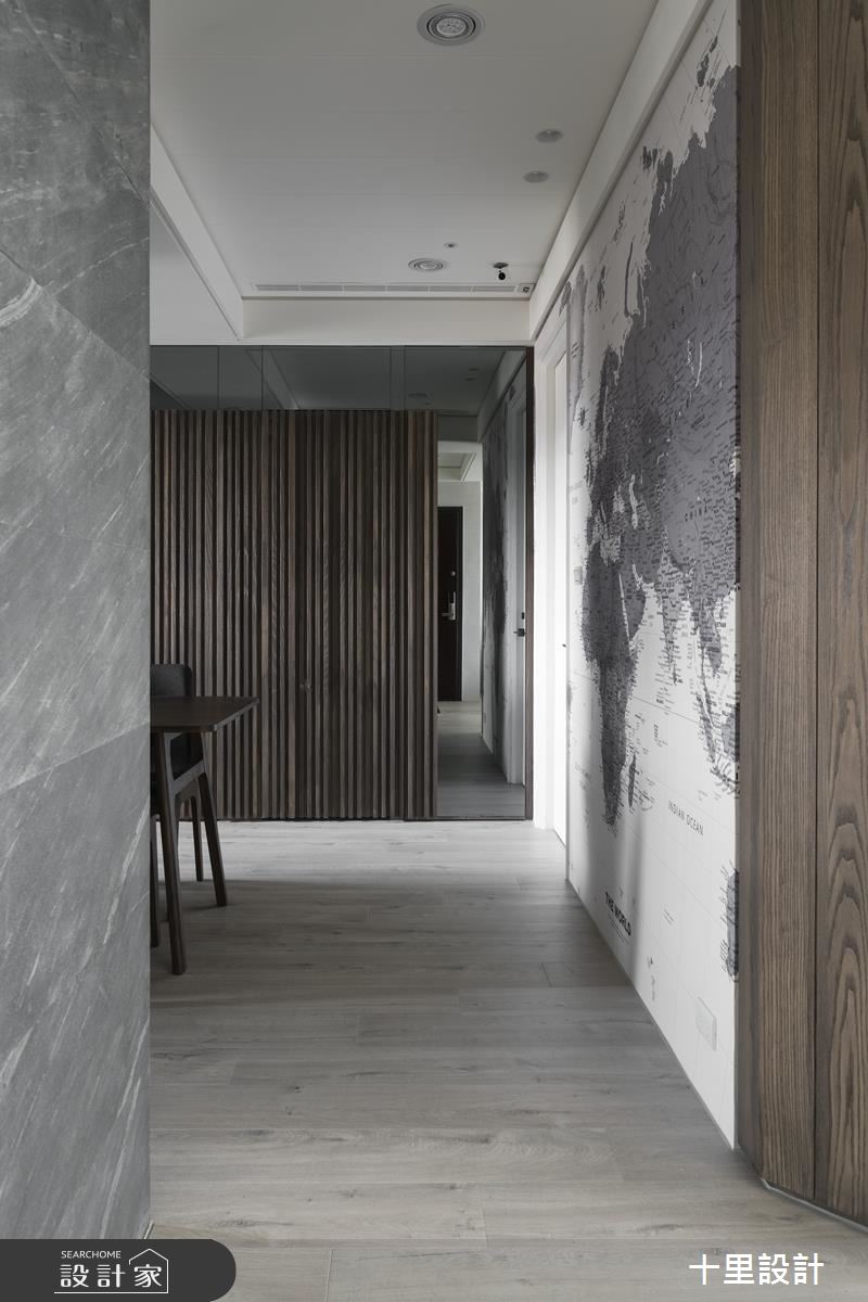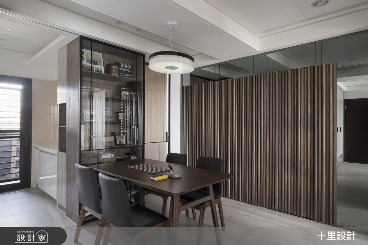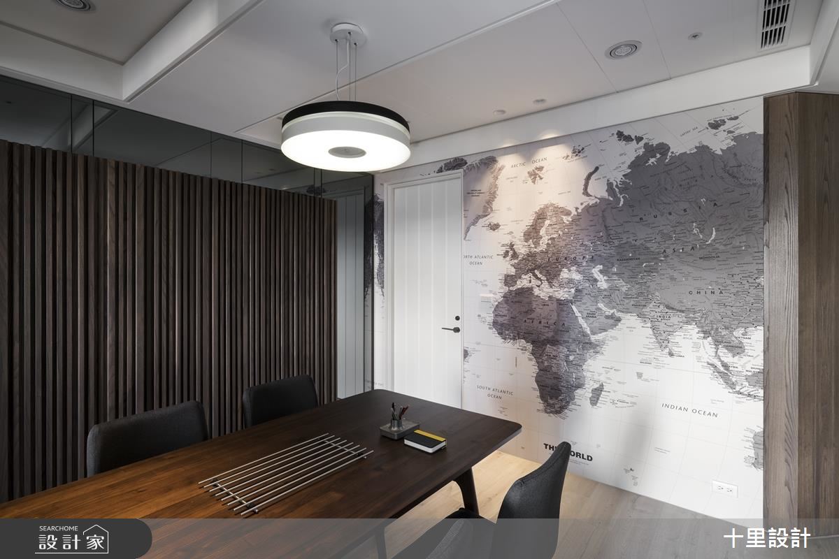 客廳區,將電視牆拉寬尺度,延伸立面的廣度,消弭掉上方樑體的樑線存在,並在木素材鋪展下,於牆體後配置隱藏收納空間,搭配黑鐵烤漆層板做出展示,營造富有機能的日式感靜謐表情;轉折進入餐廳,則刻意在轉角做出角度、導引流暢動線,於餐區加入大面積地圖壁紙,增添空間的趣味性,並承襲溫潤木意,規劃大面積的木格柵造型牆,運用排比的垂直線條,瞬間使立面跳脫不凡,彰顯深刻立體的律動變化,一旁更局部妝點鏡面,或在靠廚房地帶安置清玻展示櫃,替空間增添通透與輕盈,帶出視覺亮點!