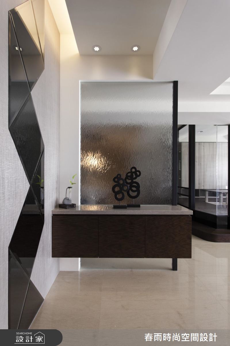 玄關以幾何圖樣以及與霧面屏隔結合的懸櫃,打造輕盈俐落的端景,同時抹除了開門見餐桌的尷尬感。右側以加入菱形花紋玻璃的櫃體收攏變電箱,更身兼置物空間。客廳與多功能和室之間以石材、鏡面與花紋玻璃取代實牆,成功的增加通透性與寬敞度。以灰玻框設獨立廚房,外部吧台與電器櫃空間,和餐廳形成順暢的烹飪動線,並將客衛入口隱藏於木皮牆面,搭配交錯玻璃櫃體達到展示機能。多功能半開放和室的牆面與地坪皆含大量收納空間,設計師更在角落為各式線路機體打造了專屬收納空間,維持視覺美觀。