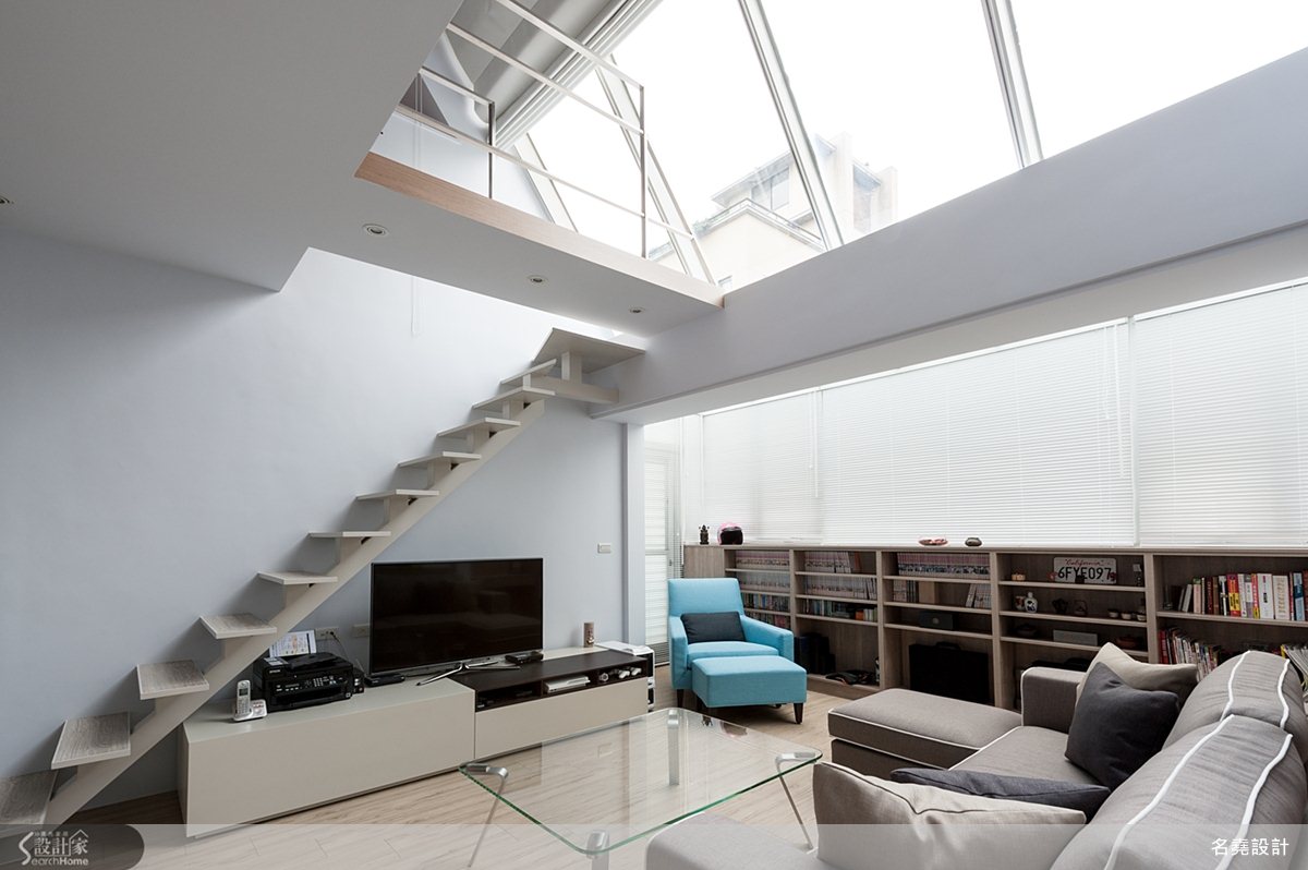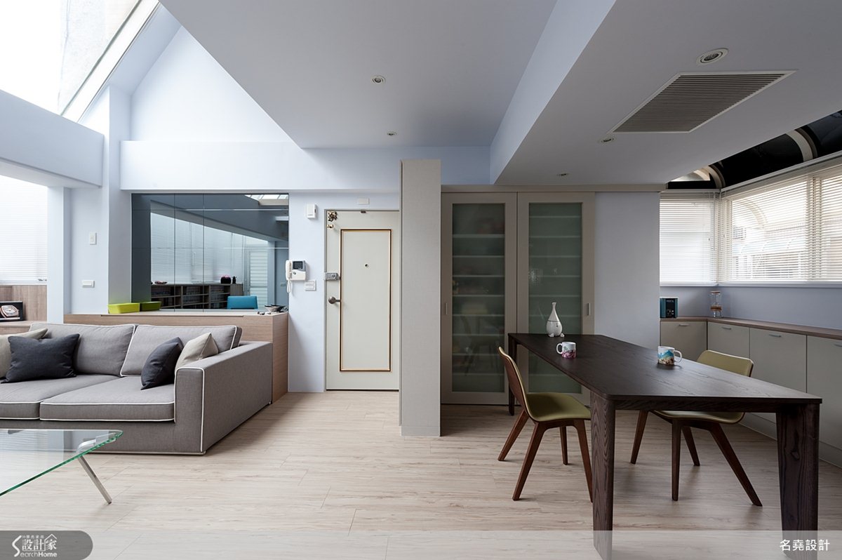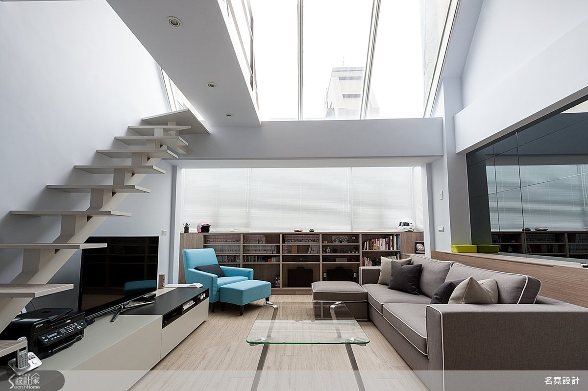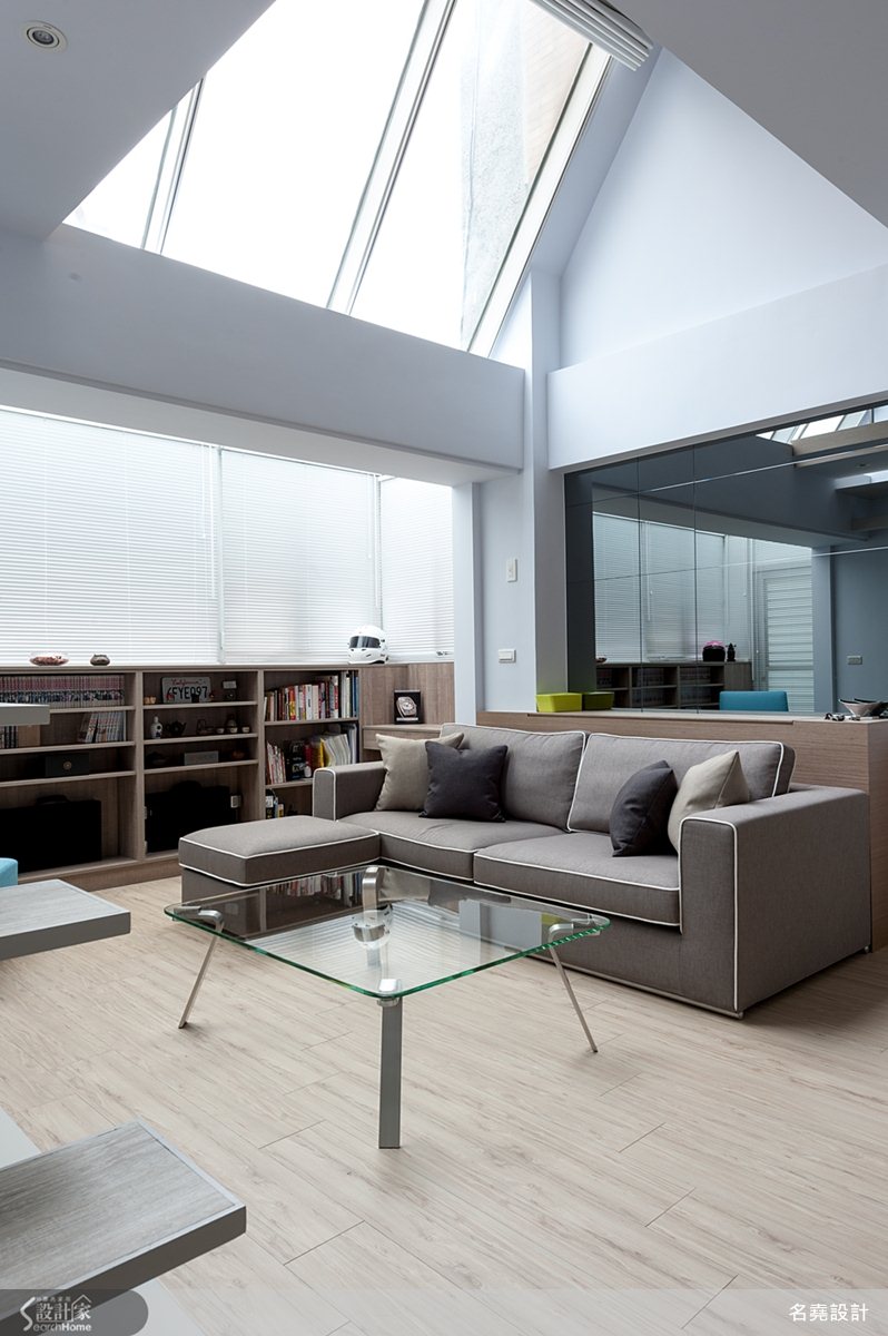 客廳區,採用淺色木地板大面鋪陳,融入天然的居家氣氛,並以挑高格局搭配延伸至屋頂的大片窗面,引進充足光線,型塑明亮的場景,空間內,採用木質書櫃與電視櫃強化置物機能,沙發背牆則採以鏡面材質,讓視線更具穿透感,一旁餐廳區域,配置充足的收納空間,以深色木質餐桌打造沉穩用餐氛圍;樓梯踏階,選用簡約的木質層板,並加入懸浮造型設計,讓延伸往上的步伐更具輕盈感受;沿天橋走道步入二樓臥房,可見以霧面玻璃打造的衣櫥櫃體,創造視覺通透感;書房場域經由斜窗搭配窗簾,引進不同時分的光影變化,營造多變的閱讀氣氛,牆面兩側則配置收納櫃體,兼具了休憩檯面與置物機能性,並同時於白牆上設計置物平檯,在牆面彎折出線條與角度的美!