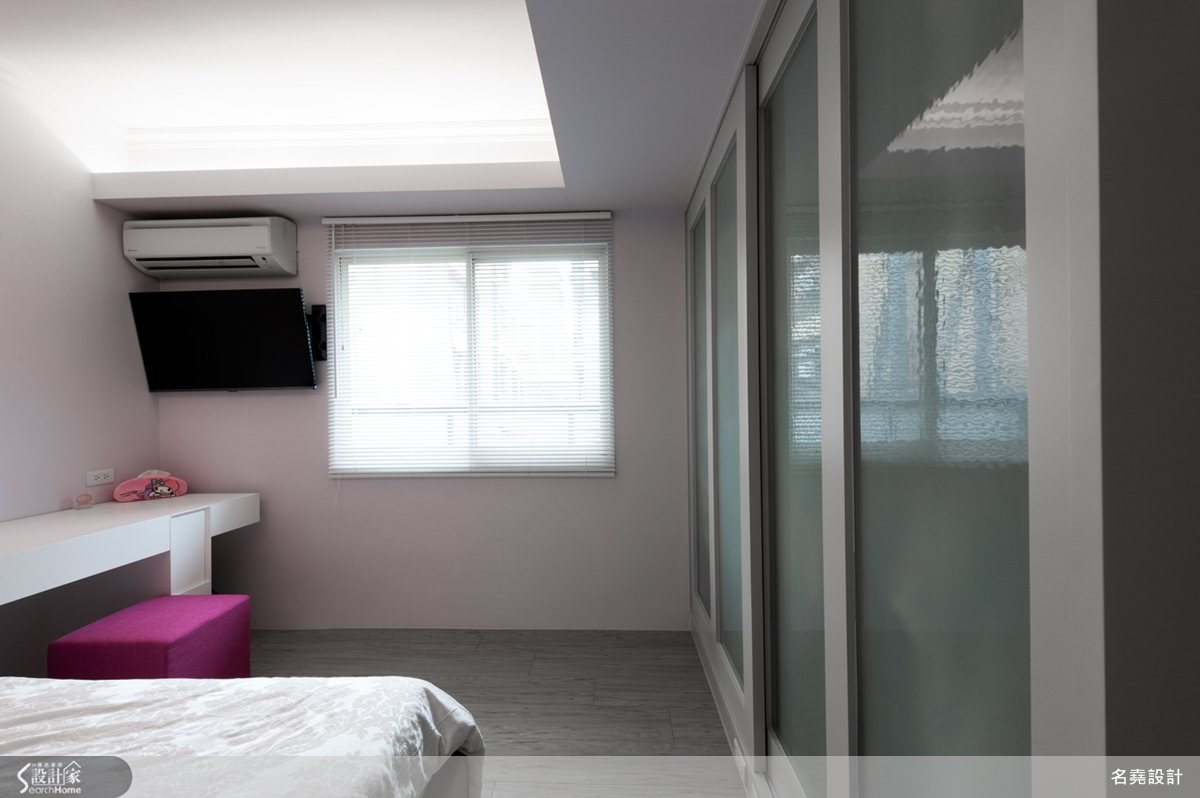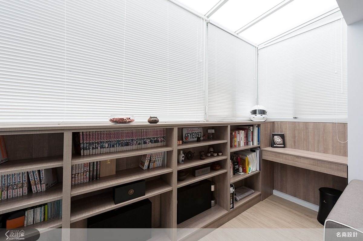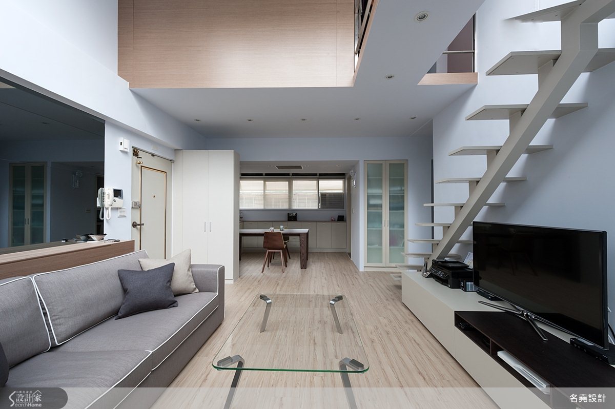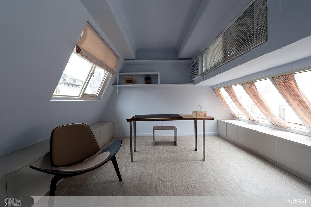 客廳區,採用淺色木地板大面鋪陳,融入天然的居家氣氛,並以挑高格局搭配延伸至屋頂的大片窗面,引進充足光線,型塑明亮的場景,空間內,採用木質書櫃與電視櫃強化置物機能,沙發背牆則採以鏡面材質,讓視線更具穿透感,一旁餐廳區域,配置充足的收納空間,以深色木質餐桌打造沉穩用餐氛圍;樓梯踏階,選用簡約的木質層板,並加入懸浮造型設計,讓延伸往上的步伐更具輕盈感受;沿天橋走道步入二樓臥房,可見以霧面玻璃打造的衣櫥櫃體,創造視覺通透感;書房場域經由斜窗搭配窗簾,引進不同時分的光影變化,營造多變的閱讀氣氛,牆面兩側則配置收納櫃體,兼具了休憩檯面與置物機能性,並同時於白牆上設計置物平檯,在牆面彎折出線條與角度的美!