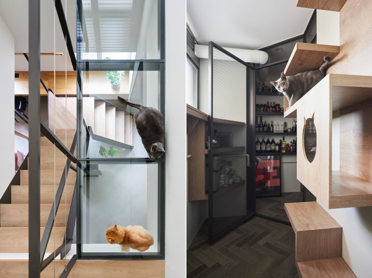 你有想過嗎?生活起居到處都能看到愛貓,不用每天心慌玩捉迷藏,這簡直就是貓奴的天堂啊。為了給三隻愛貓足夠的嬉戲空間,設計師利用公領域畸零處設置跳板、檯面,還以透明材質、挖空方式讓主人不費吹灰之力就能迅速掌握愛貓蹤跡,這個設計實在太貼心了。