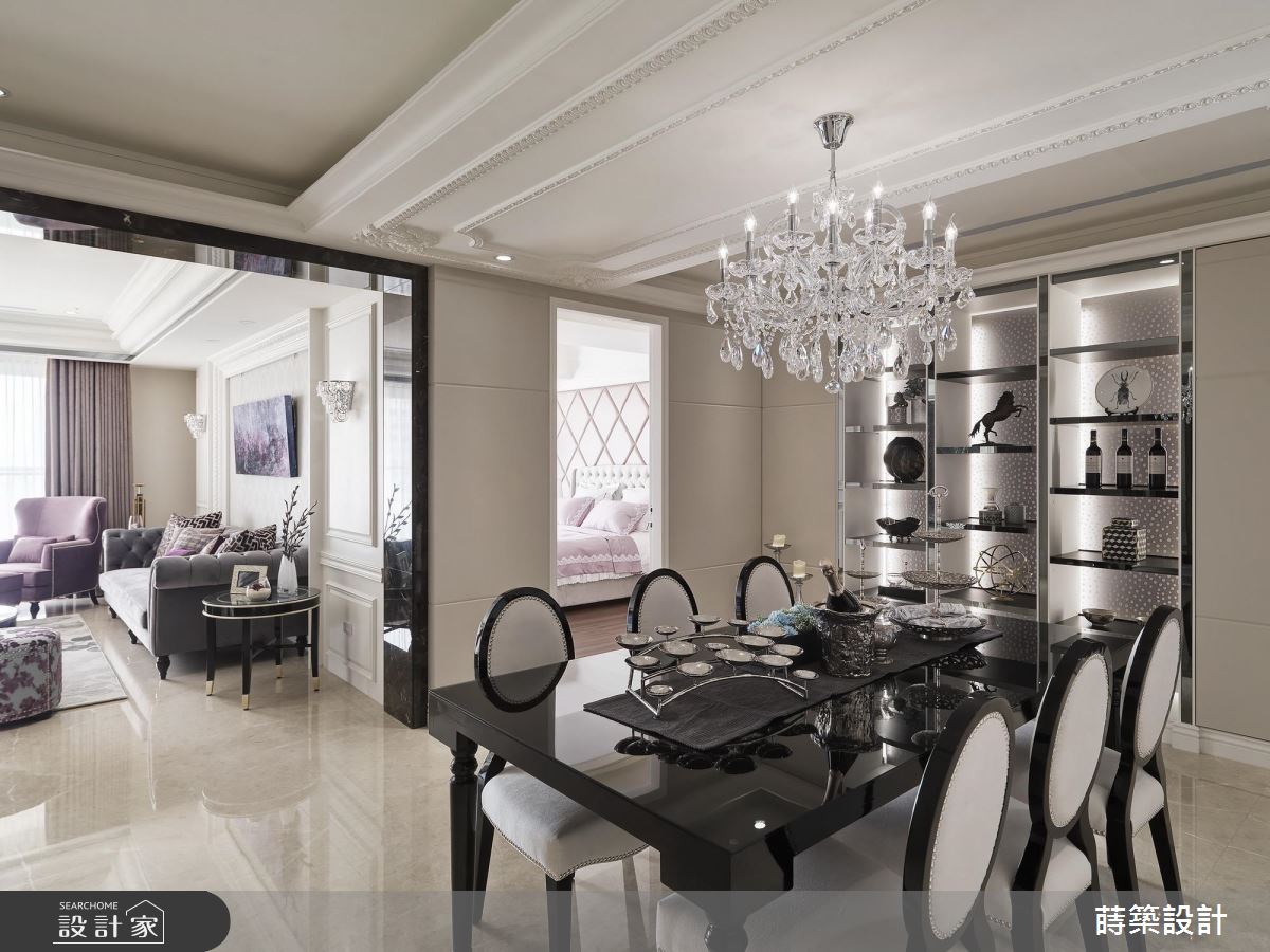 玄關,藉由石材紋理鋪陳牆面背景,搭配花藝與櫃體型塑端景,帶出充滿質感的入口印象;公共領域,則選用輕盈的淺色系,穿插特殊石材及手繪油畫,增添整體層次,沙發背牆則在細緻線板的框覆之下,顯出立體畫面,搭佐兩側閃亮的壁燈妝點,點亮居家質感;轉而跨過黑色門框之後,可來到開放式的餐廳,讓櫃體貼齊牆線,並把畸零地變為儲藏室,網羅美觀與實用機能,透過大面積的展示風景,呈現華麗的時尚氣息;主臥經由重新配置後,坐擁與客廳幾乎一樣大的坪數,並在細節中體現巧思,可見到具有弧腳設計的展示櫃造型,且帶入線板修飾,讓臥房在輕柔的白色印象之中,亦散發成熟且精緻的格調!