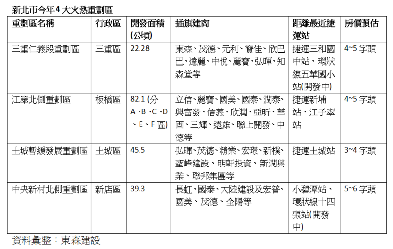 在自住客當道下,重劃區不約而同聚焦主打中低總價產品,新北市包括板橋江翠北側重劃區、土城暫緩發展重劃區、新店中央新村北側重劃區以及三重仁義段重劃區共4大火熱重劃區吸引建商插旗,加入推案價格戰場,其中,近期最值得關注的是新興的「三重仁義段重劃區」,此重劃區因緊鄰三重熱鬧市區,生活機能純熟,且周邊已10年以上無大量新案,為抓緊當地換屋需求,目前已有東森、茂德、元利、寶佳、欣巴巴、達麗、麗寶、中悅等知名建商搶插旗,並可望在今年下半年開始陸續推案,今年案量初估將超過百億元,東森建設首案「日日東森」已蓄勢待發,就連近期喊出擴點千家的超市龍頭「全聯」品牌也搶進駐重劃區,估計將帶動此區住宅買氣與商場、店面聚集效應。
