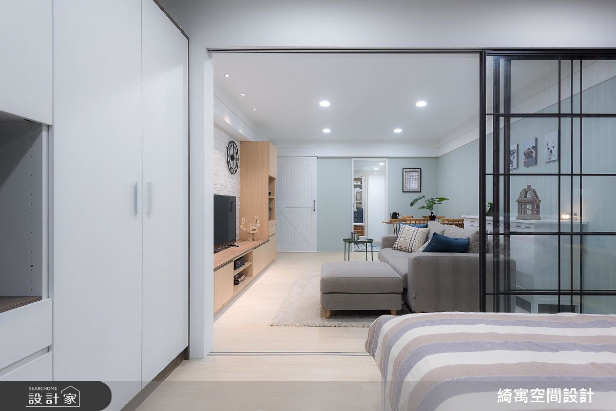 40 年老屋除了管線老舊、原先裝潢殘破,加上地板前後傾斜高達 4 公分,格局配置不均導致廚房極小、風水疑慮,可說是百廢待舉!設計師首先透過全室地板整平矯正傾斜問題,接著以玻璃鐵件拉門取代隔間牆,並重整格局,讓各空間得以擁有寬敞的空間與機能。設計師將屋案分為前、中、後三段,玄關與廚房及衛浴平行,特別設計活動式門片,讓屋主的愛貓可以自由進出衛浴,也能彈性成為廚房隔間。中段則著重調整家具尺寸與配置,讓客、餐廳得以構成寬敞舒適的比例。臥室則置於採光最充沛的臨窗位置,玻璃拉門同時能區分公私領域,卻能不阻礙光線行進。
