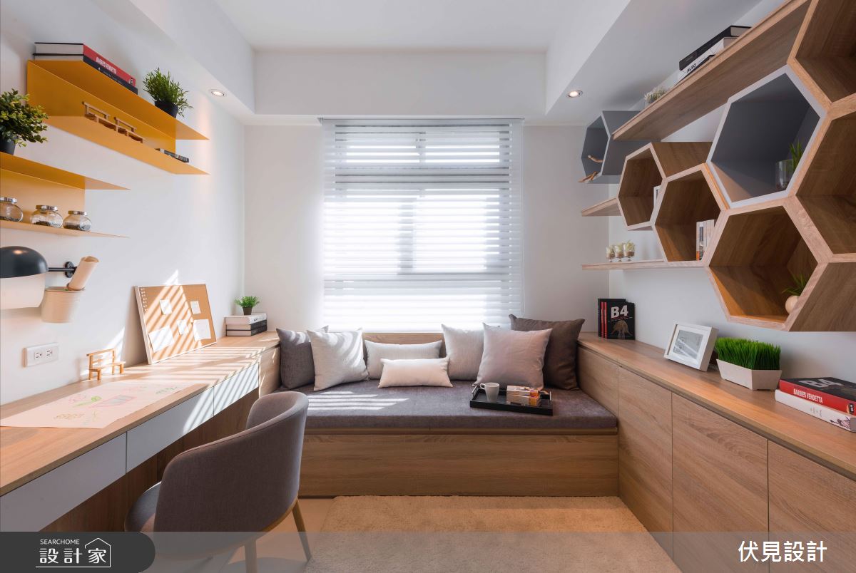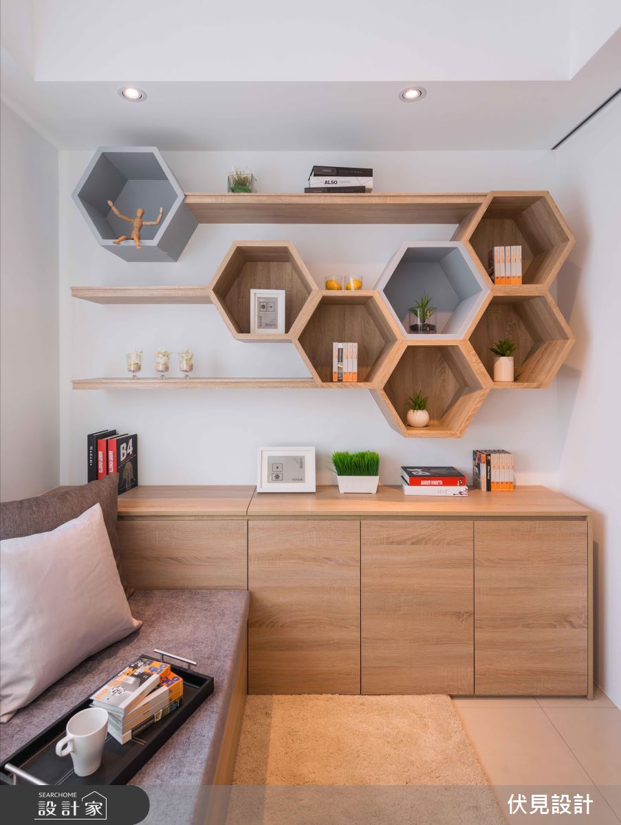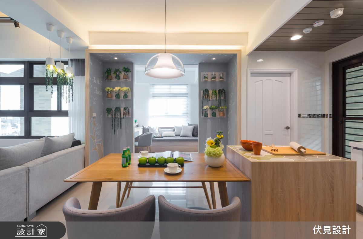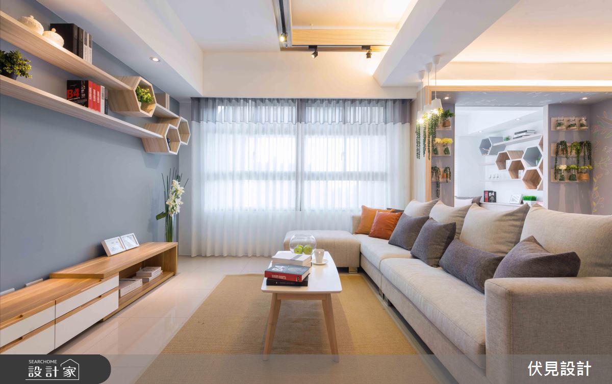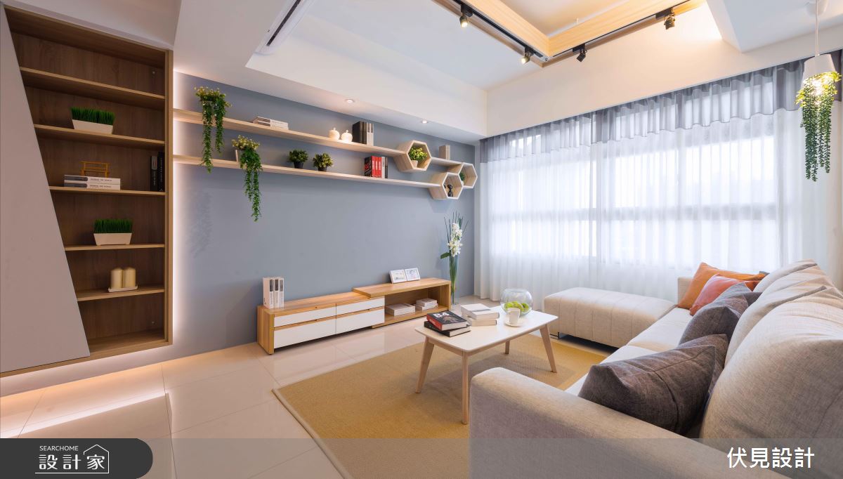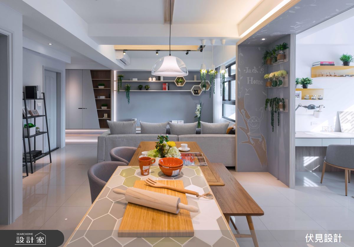 牆面運用大面積淺藍色系,搭配木質家具,創造空間暖度,並將幾何元素應用在櫃體門片、牆面收納層架甚至是中島桌面。而客廳及書房牆面的蜂巢狀六角形簍空層架,幾何造型櫃體除了成功成為視覺亮點外,也兼具展示收納功能。客餐廳區域則置入大量北歐風必備的綠意植栽元素,不管是懸吊式植栽,或是置入六角形收納櫃中的盆栽,都為整個家植入大量活力感! 而開放式設計的書房延展了公領域的視覺範圍,並利用壁掛式植物搭配童趣塗鴉的牆面,巧妙成為區隔書房及客餐廳區域的門框。