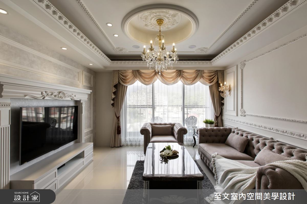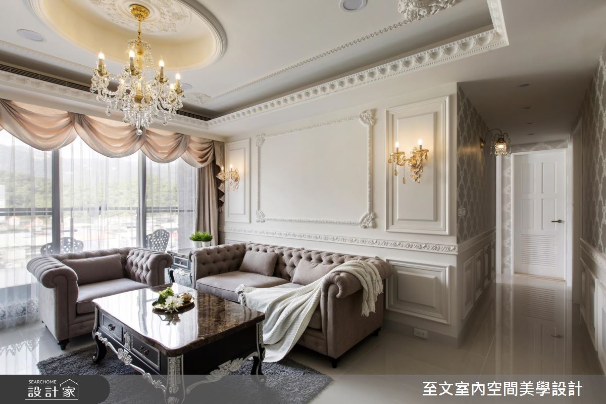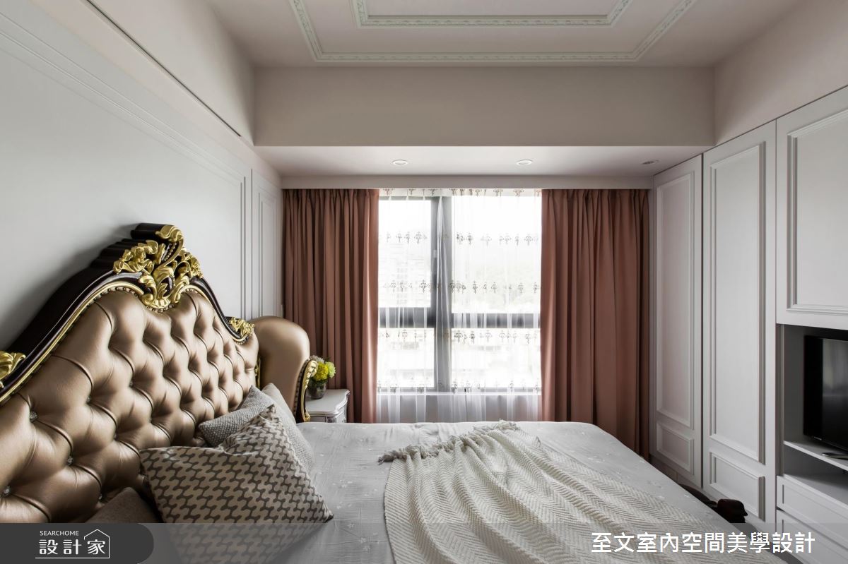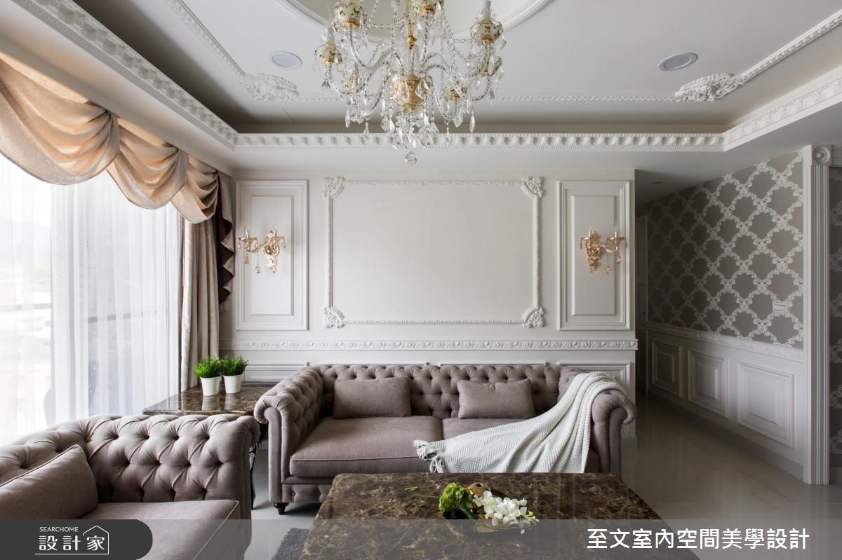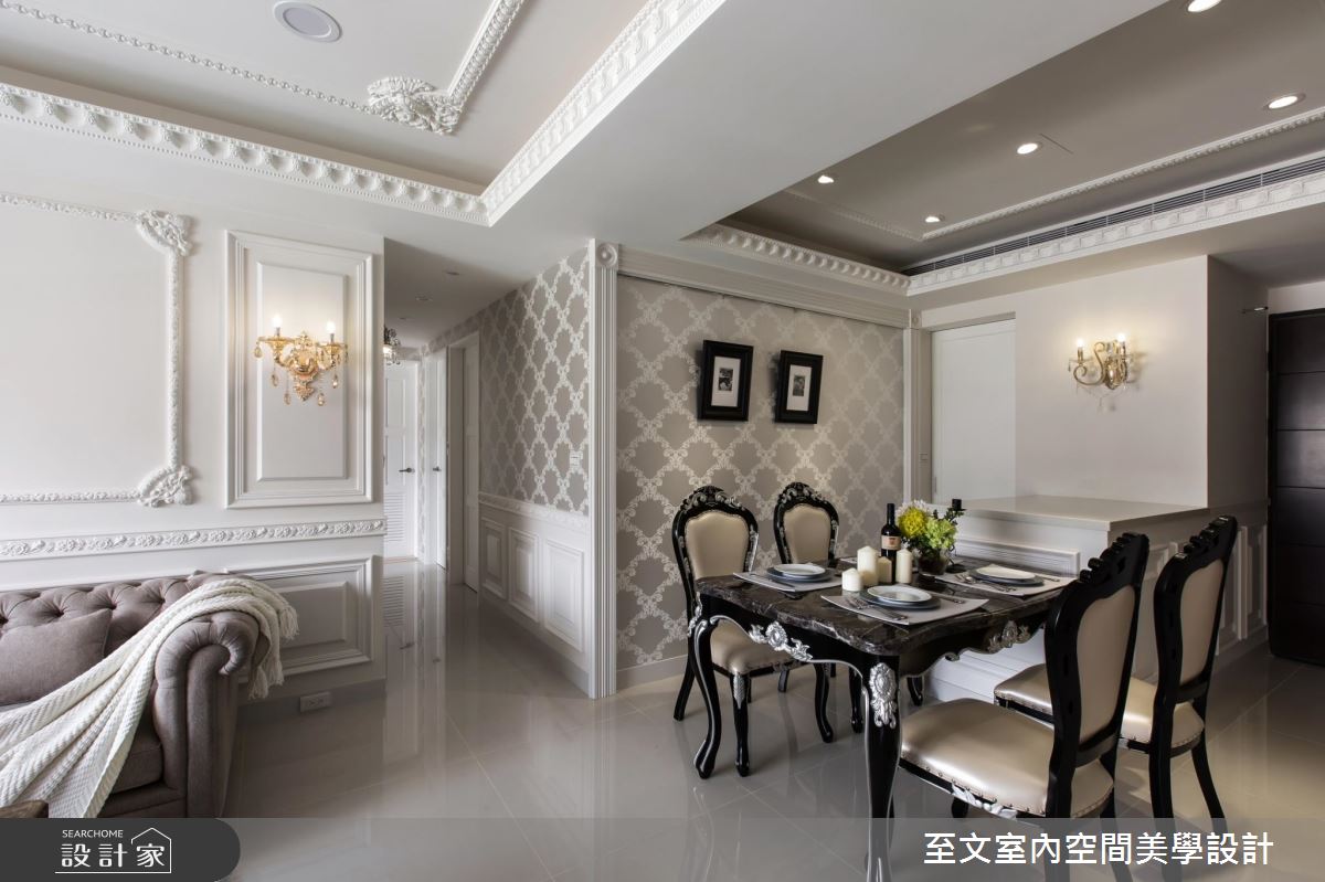 設計師保有方正的格局優勢,讓人一進門後,即可順應視覺脈絡,銜接起餐廳與客廳的開放視野,客廳處,更刻意將天花板拉高且設計成圓頂挑空,增加水晶燈的懸墜高度,營造小宮廷的氣勢,並挹注收納櫃機能,在櫃面門片處特別訂製雕花線板,搭佐天花及壁面的造型線板,彰顯新古典的高雅質感;主臥內,延攬採光、通風良好的條件,並以香檳色床頭帶出低調奢華感,藉由線條的勾勒,詮釋莊重大器的寢居樣貌!