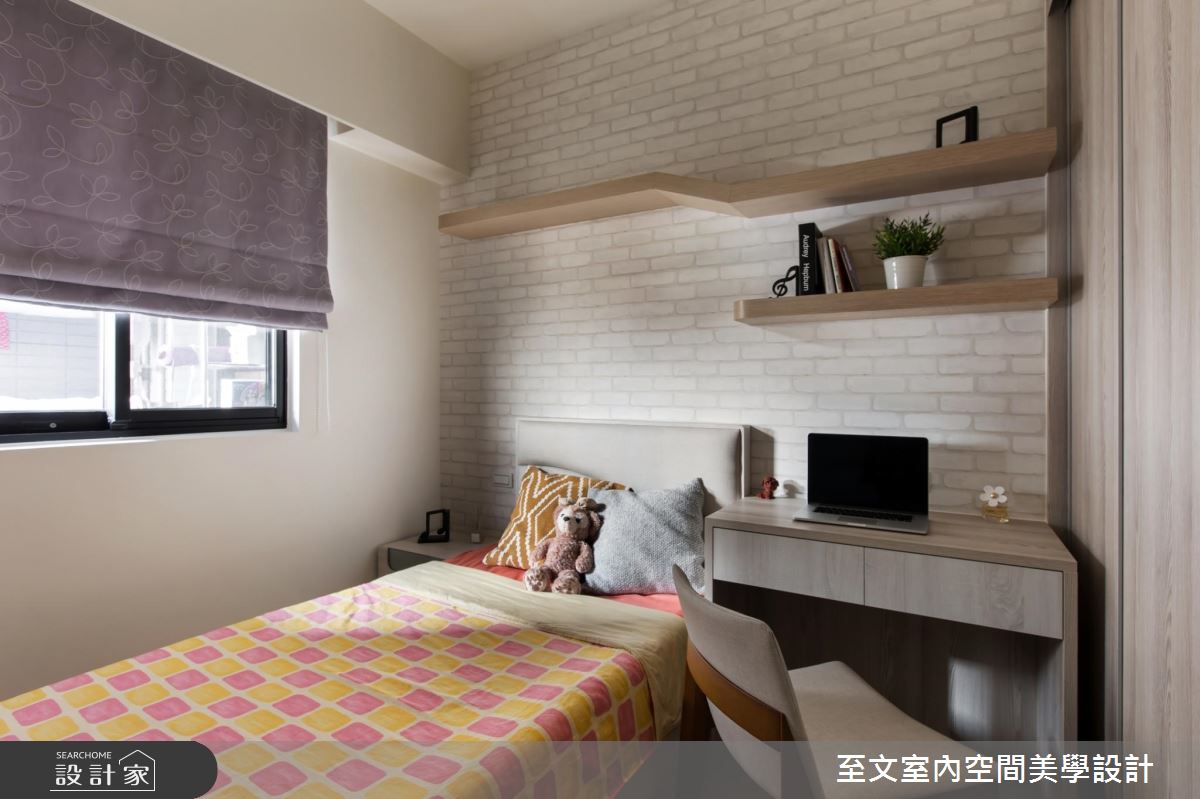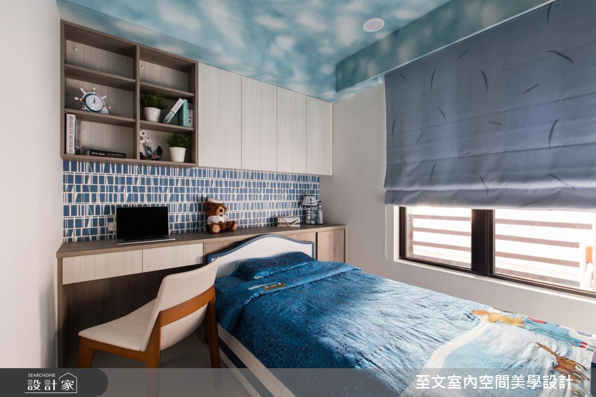 女兒房,床頭牆鋪陳文化石壁紙,加以木作層板搭配,襯出清新的鄉村氣質;而兒子房內,則在海洋風格演繹下,將藍色雲霧圖案延伸至上方天花,就連床板也特別訂製成船的造型,滿足小兒子的航海夢!