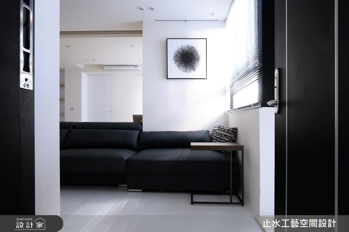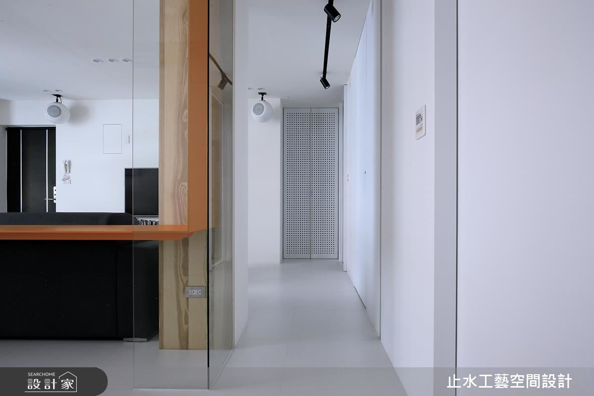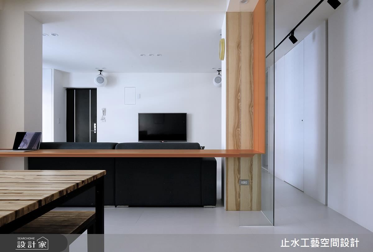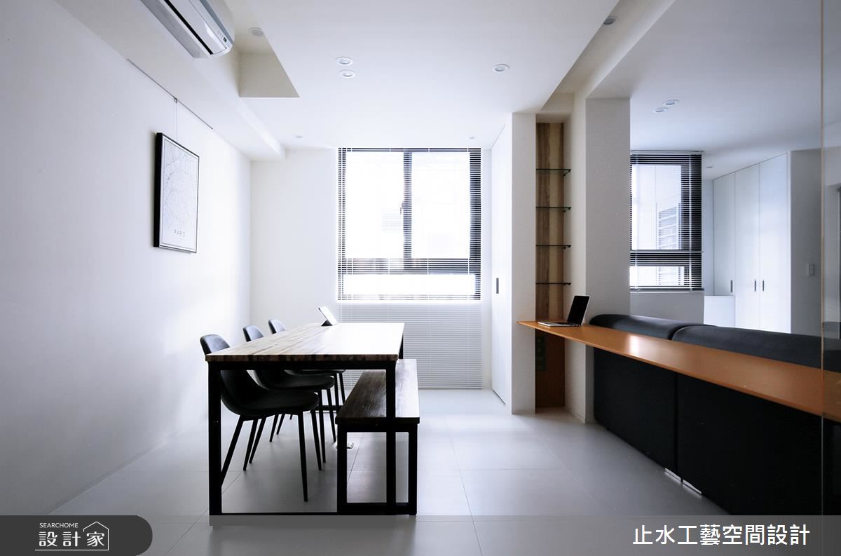 廳區內,透過滿載的清新陽光,促成明亮氣場,成為維繫家人感情的最佳場所,無論是閱讀、玩樂或是談心,都可隨時被大面採光所包圍,並給予大面積的留白設計,搭配深色沙發與木桌几,佐以簡單不繁複的線條勾勒,使整體視覺舒適協調;並依循結構柱位置,安排一道通透的清玻隔間,區分出餐客廳的範圍,一面接連懸空延伸的鋼板桌,讓餐廳多了更多的使用情境,不僅提供用餐機能,也是全家人聊天談心的區域;而房門通道口則藏於白色立面之中,減緩了對門的擁擠感,同時搭接廚房深色玻璃門的配置,加強場域之間的採光流動!