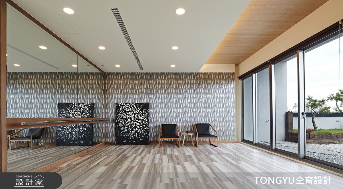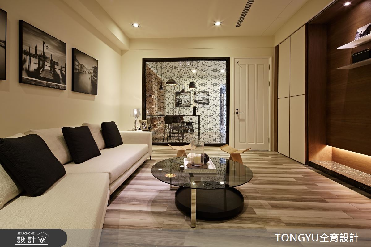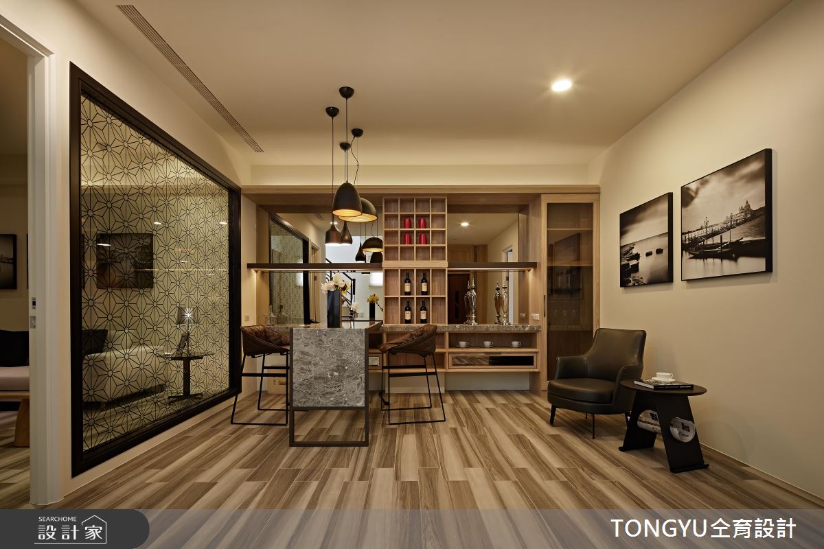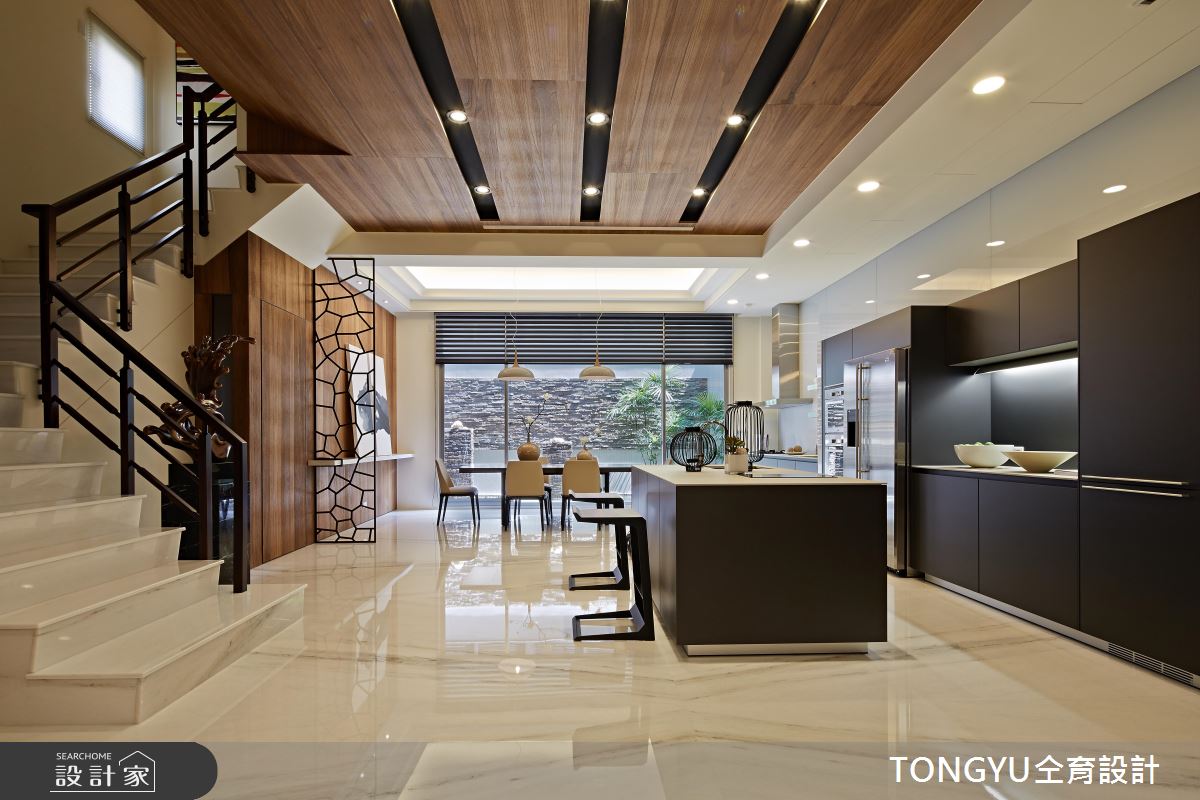整體以開放隔局為規劃,隨著戶外光源的引入,形塑開闊舒心之感。電視牆以漸層的灰階石材拼接而成,搭配素雅的布面沙發、圓形茶几,交織出內斂且非凡氣度;餐廚領域透過細緻的鏤空鐵件屏隔,隱喻空間劃分,黑色的中島與櫥櫃門片,展現沉穩風範;藉由暖調木紋鋪陳天花板,並以黑色溝縫的造型、嵌燈設計為照明,與深色廚具相互呼應,而原木質感的肌理延伸至餐廳區的壁面,同時成為共用衛浴的隱藏門,替冷調的現代空間挹注溫潤氣息;餐廳桌倚靠整片落地窗,接引敞朗天光,且讓戶外的植栽、卵石等景致引入,形塑內外皆景的人文雅緻豪邸。