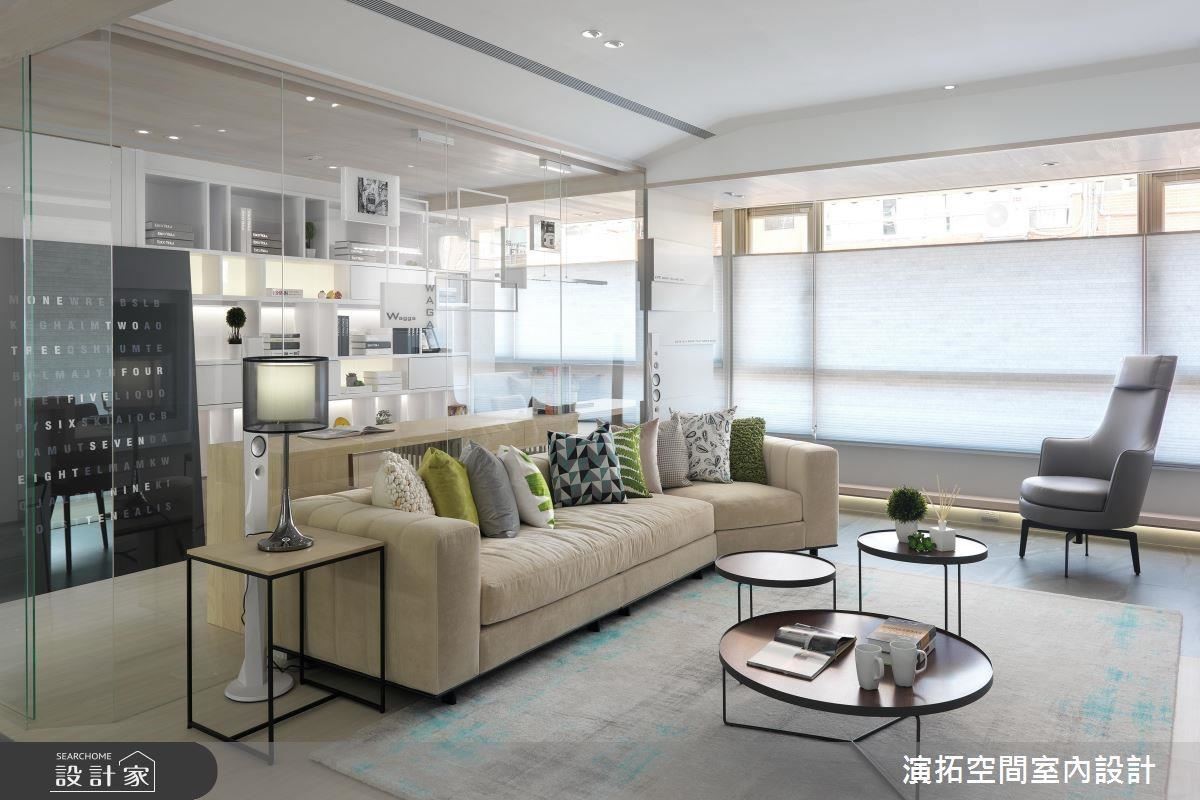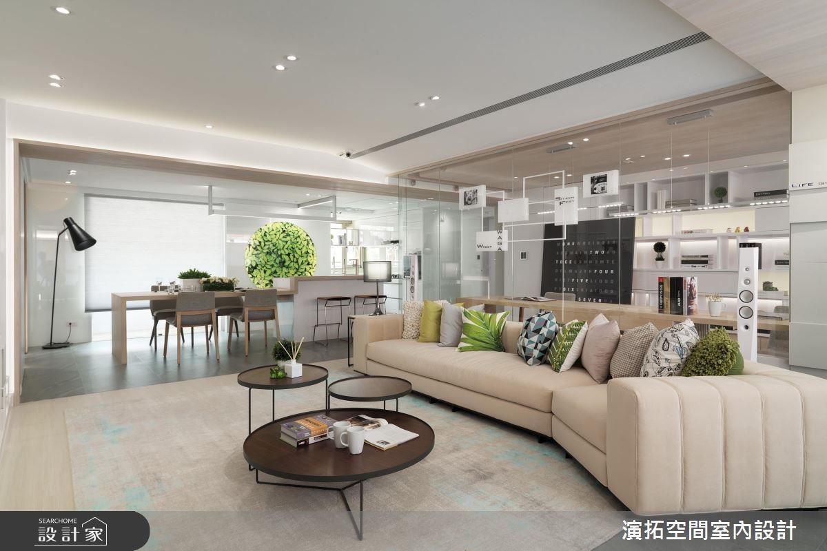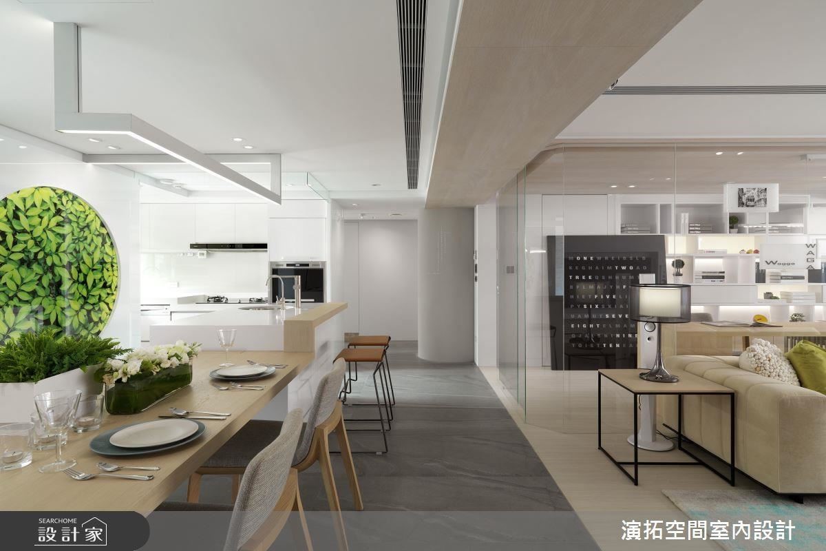 客、餐、廚公共區,是家人共處時間最長的場域,演拓空間室內設計的殷崇淵設計師不僅將這間36年老屋的隔間打開,讓三個區塊彼此互通,更利用透明玻璃隔間,界定書房,即使置身書房,也能與公共區保持良好互動。