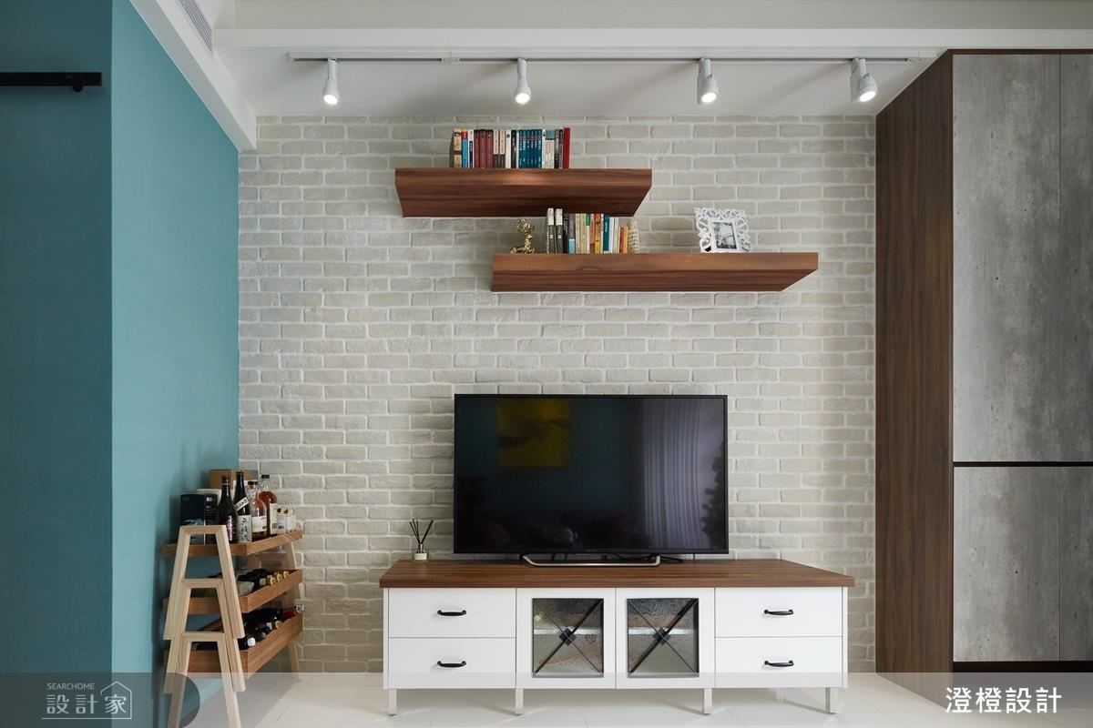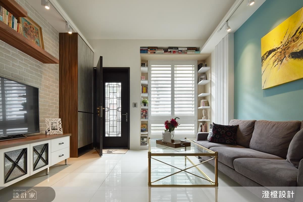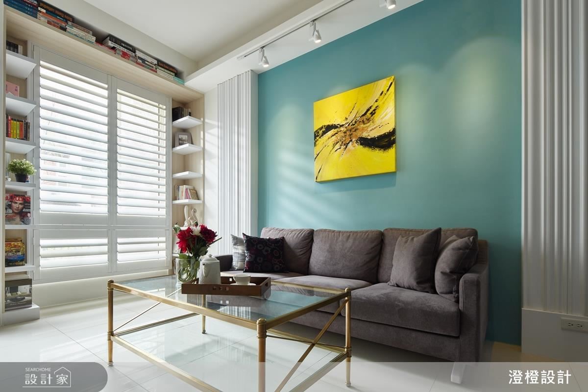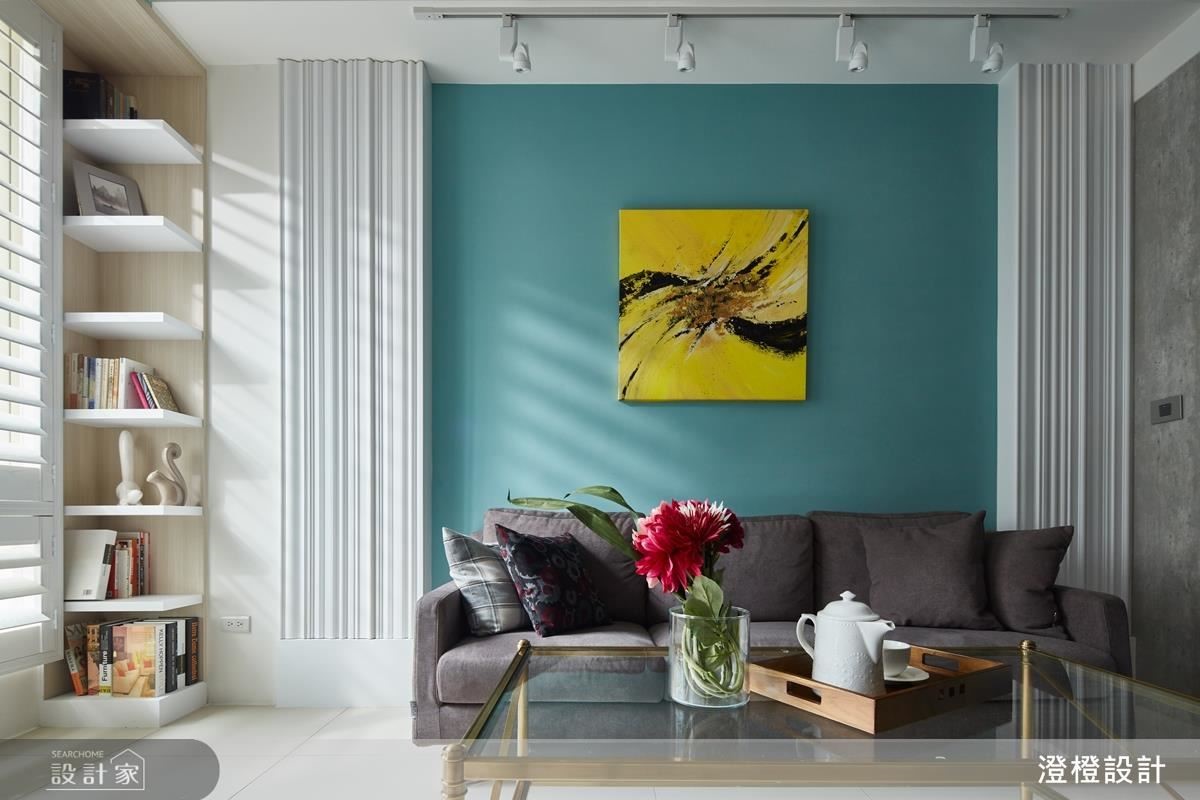 客廳沙發背牆一側具有結構柱與電箱,於是在左右兩端安排白色柱體,打造成具深度的對稱表情,透過垂直線條的鋪排,以及大面積藍色鋪陳牆面、鮮明畫作的置中妝點,使牆面有如一幅端景畫面;窗戶則做出客製化收納,沿著窗框規畫 ㄇ 字型書櫃,形成別出心裁的風景畫面。