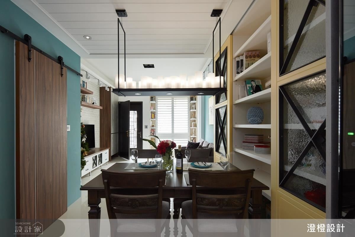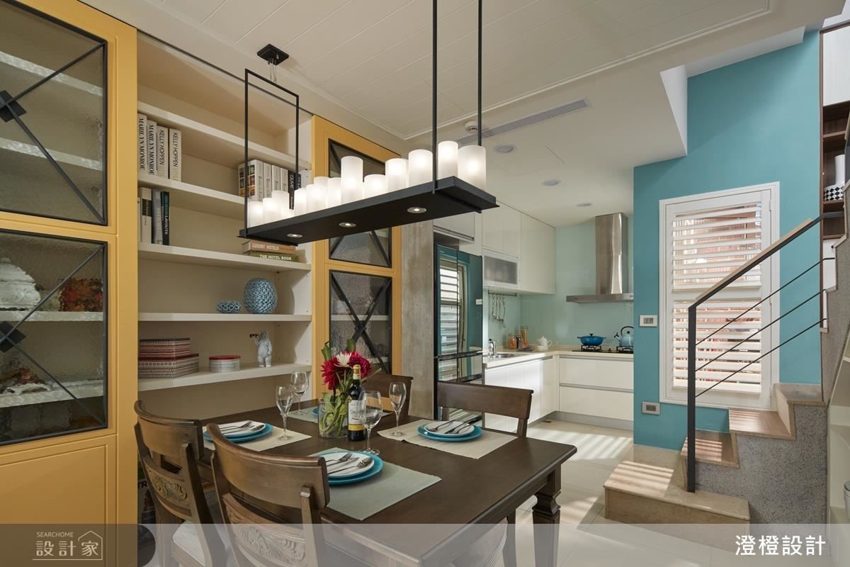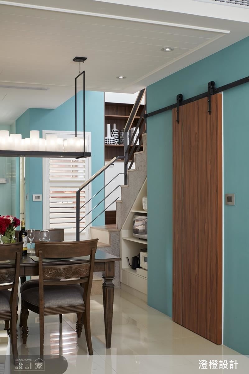 客廳、餐廳、廚房呈開放式一字串聯,除了讓前後採光暢通無阻、分享給較昏暗的中段地帶之外,也塑造公領域更大的空間感,並打造一座黃色餐櫃,與藍色牆面形成趣味對比,一旁通往衛浴的門片則加入穀倉門造型,以裝飾性語彙修飾機能,美觀且實用。