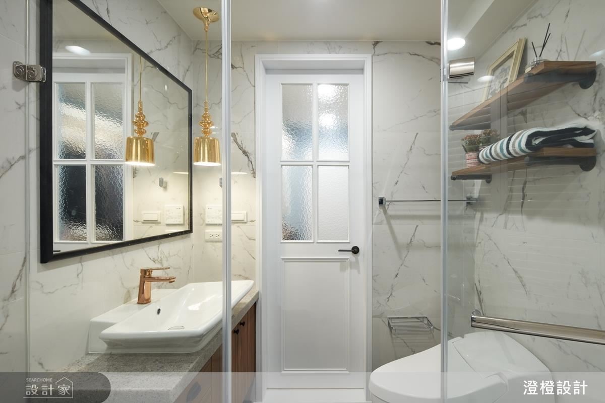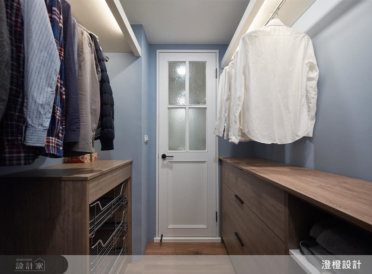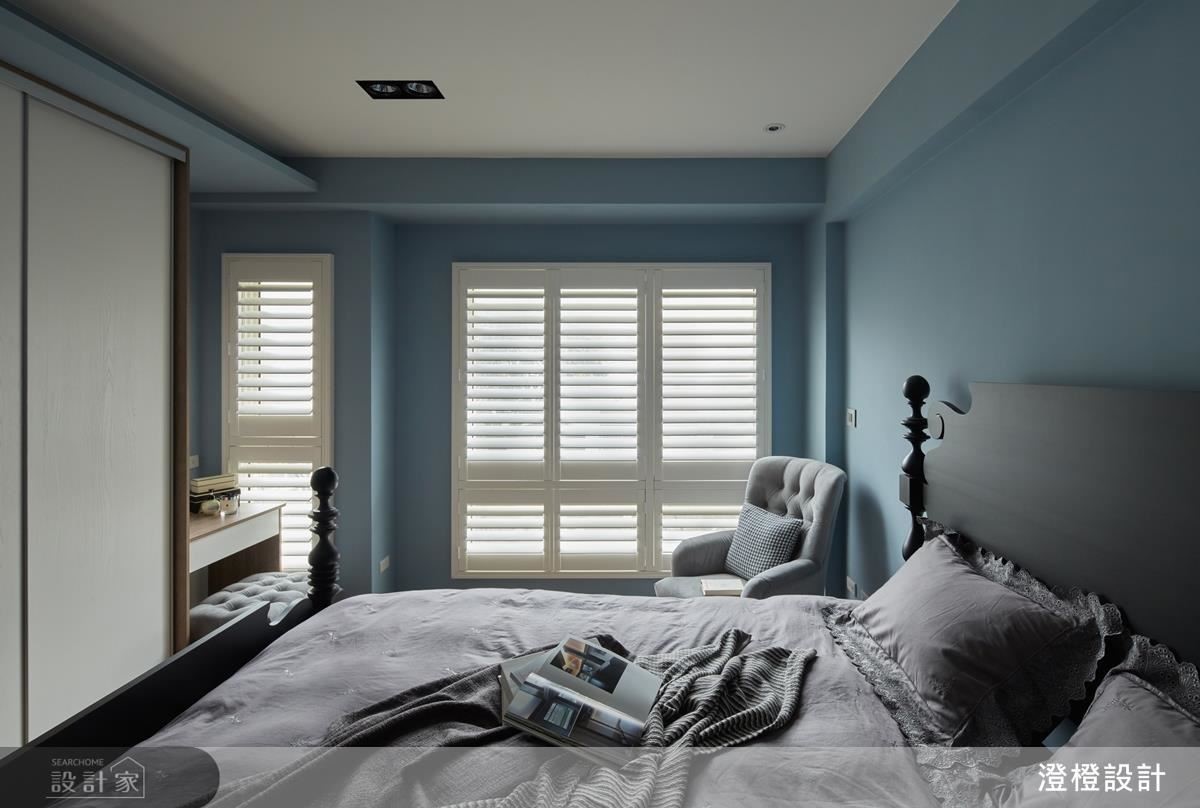 寢臥轉換為灰藍,加入簡約的美式風韻,床尾處則將衣櫃結合梳妝台,塑造一體成形的機能運用;原先的衛浴領域則在格局改革後,部分變為更衣間,承襲著優美的藍色調、落實清爽收納;衛浴內則在仿銀狐石磚基底下,增加金色的龍頭與吊燈,注入微奢的魅力。