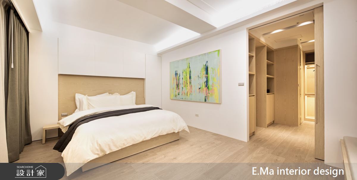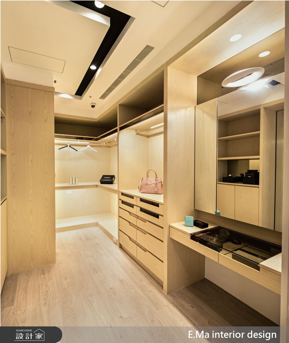 更衣間內,依照屋主需求,增設兼具梳妝功能的檯面,並留有充裕的櫃體機能,方便夫妻同時收納衣物與生活用品!